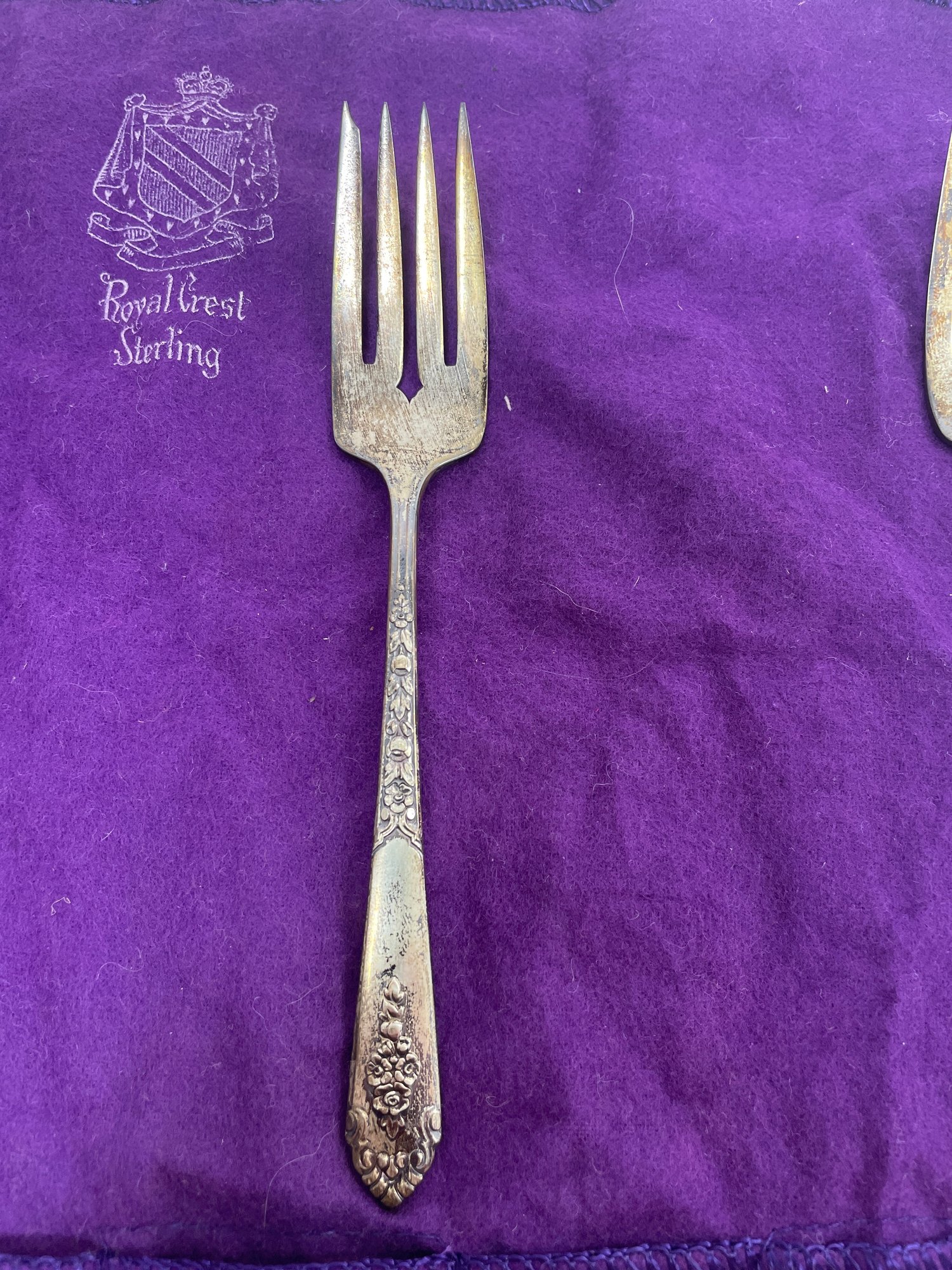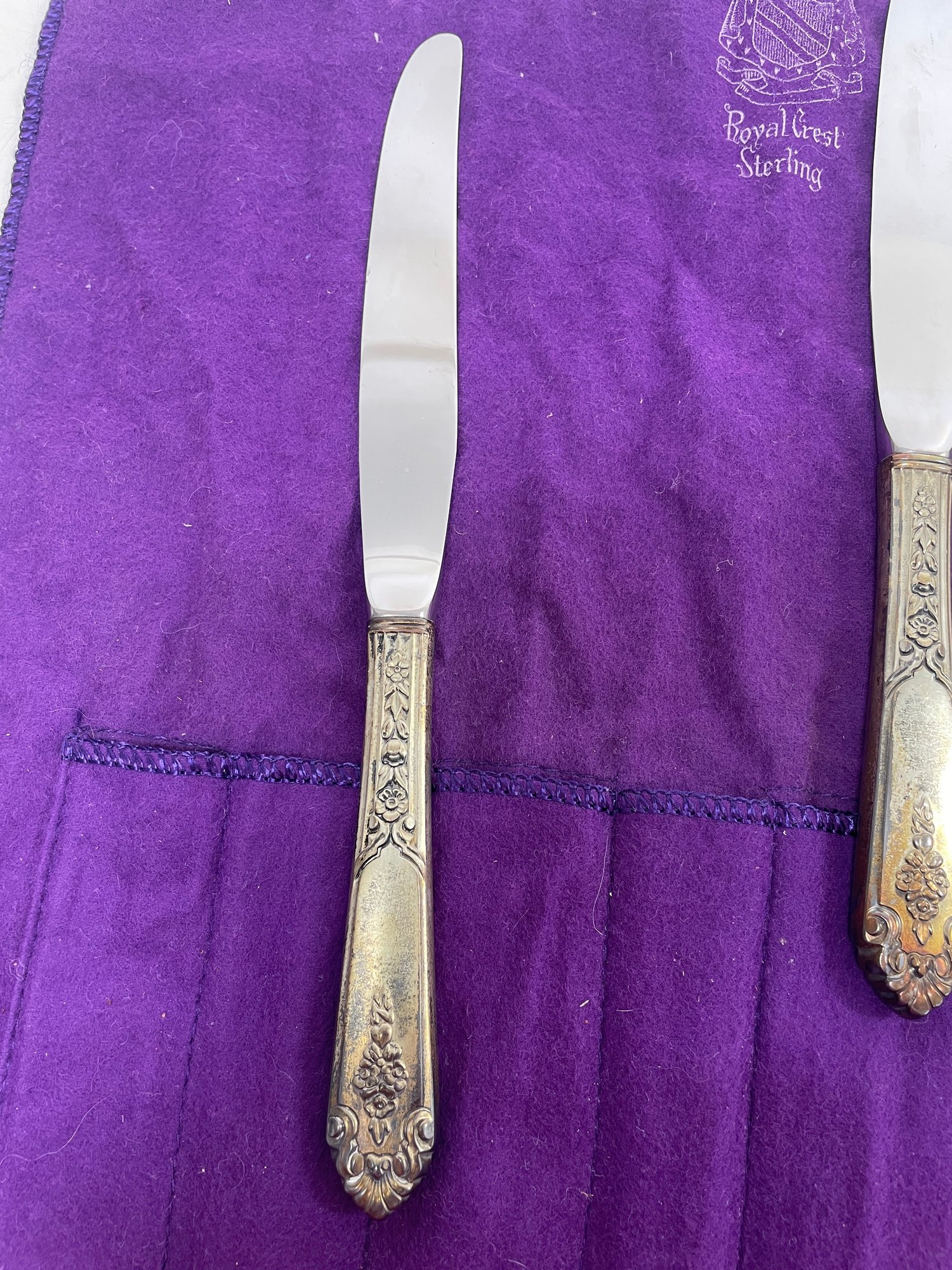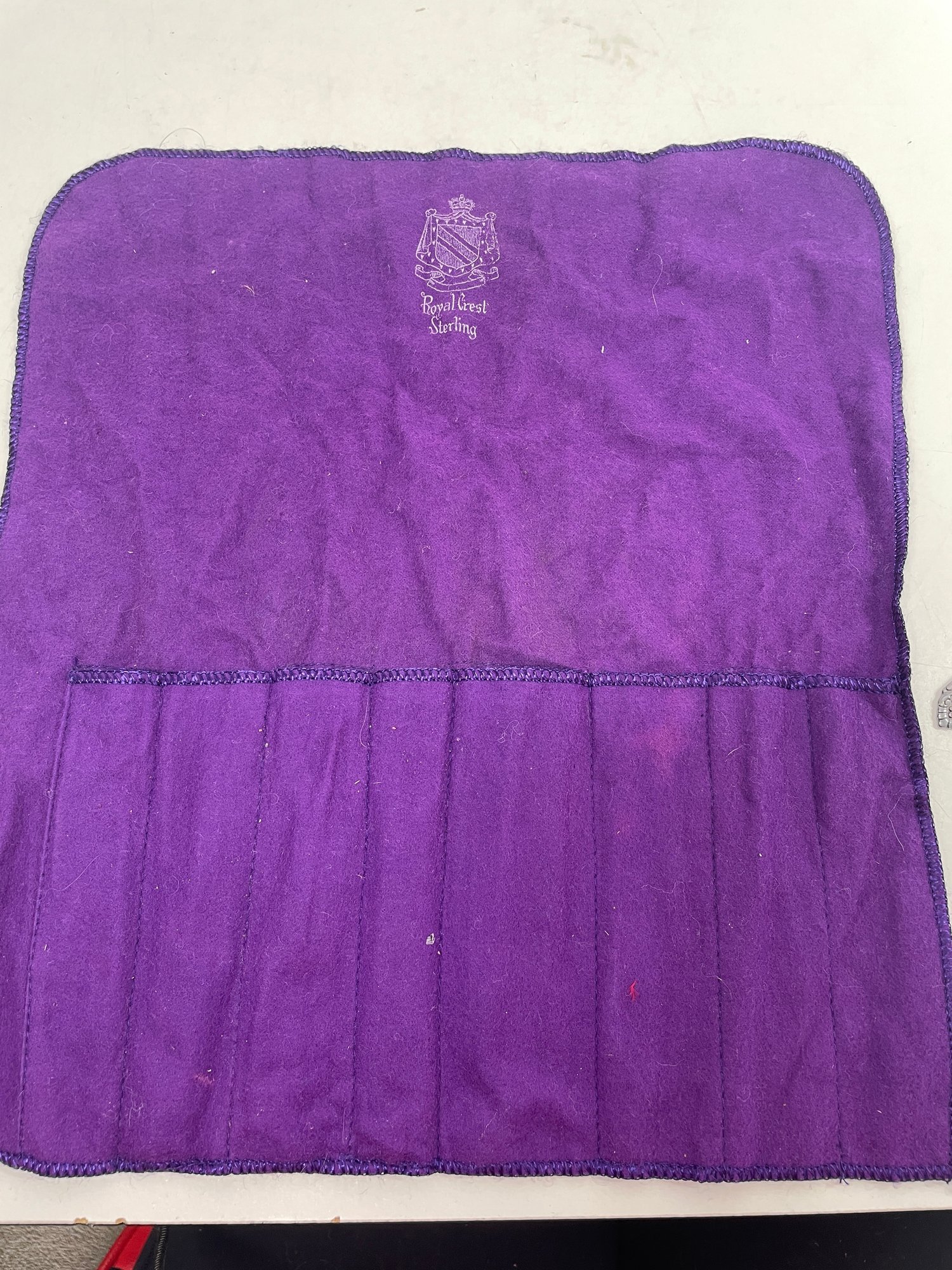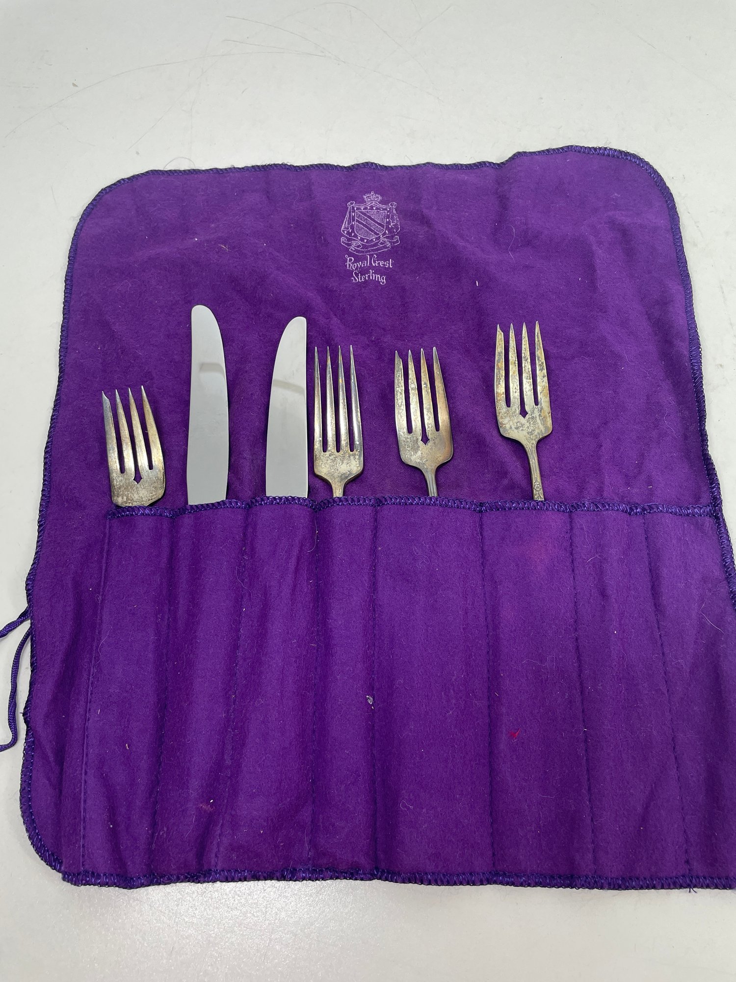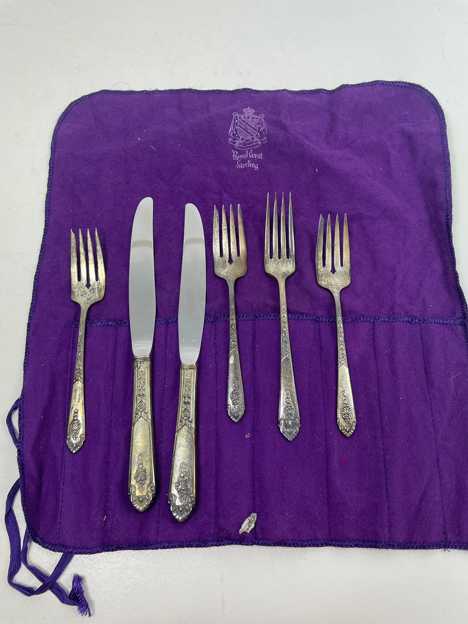 This is a beautiful set of Royal Crest Sterling “promise” flatware. They are in overall good condition but could use a nice polishing. There are 6 pieces total plus the roll up fabric case. Please see pictures for more details.