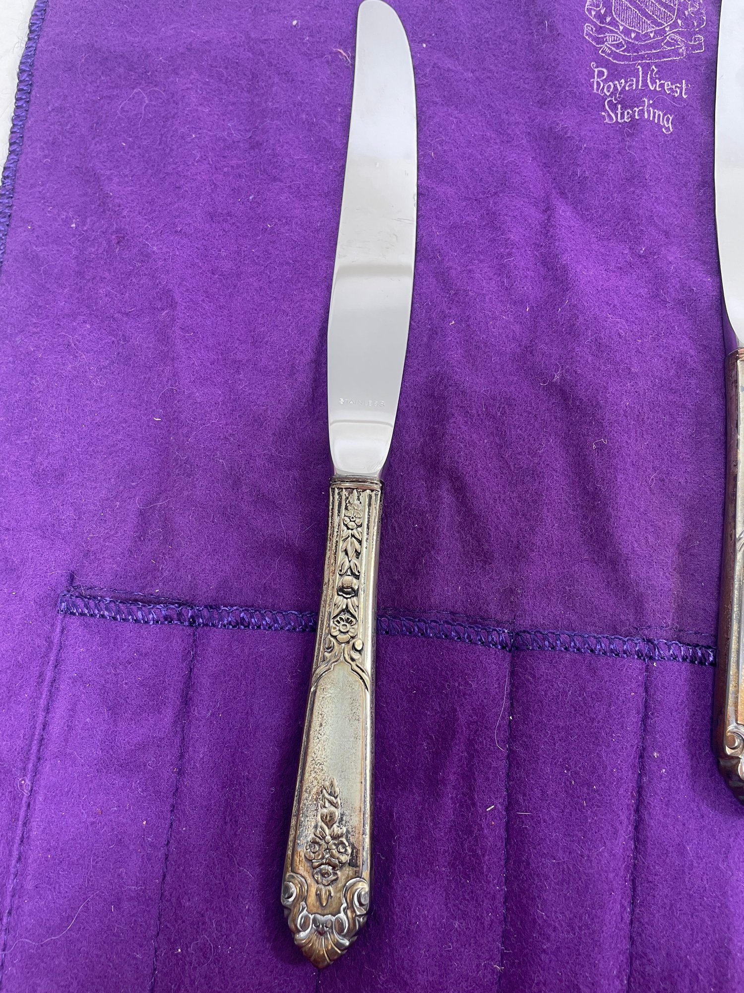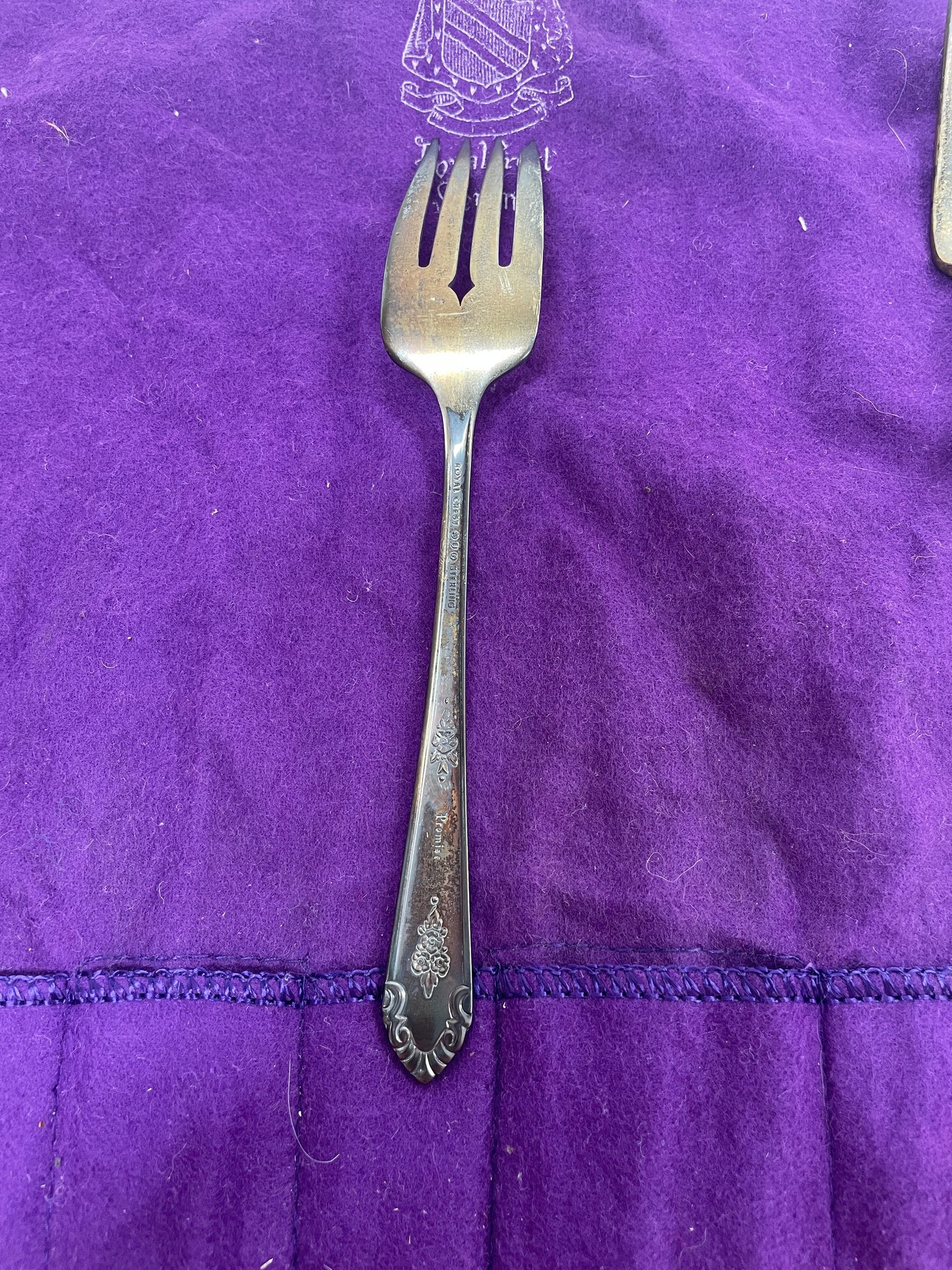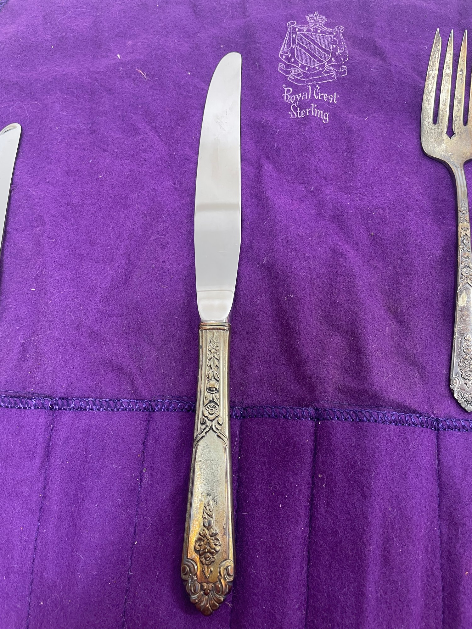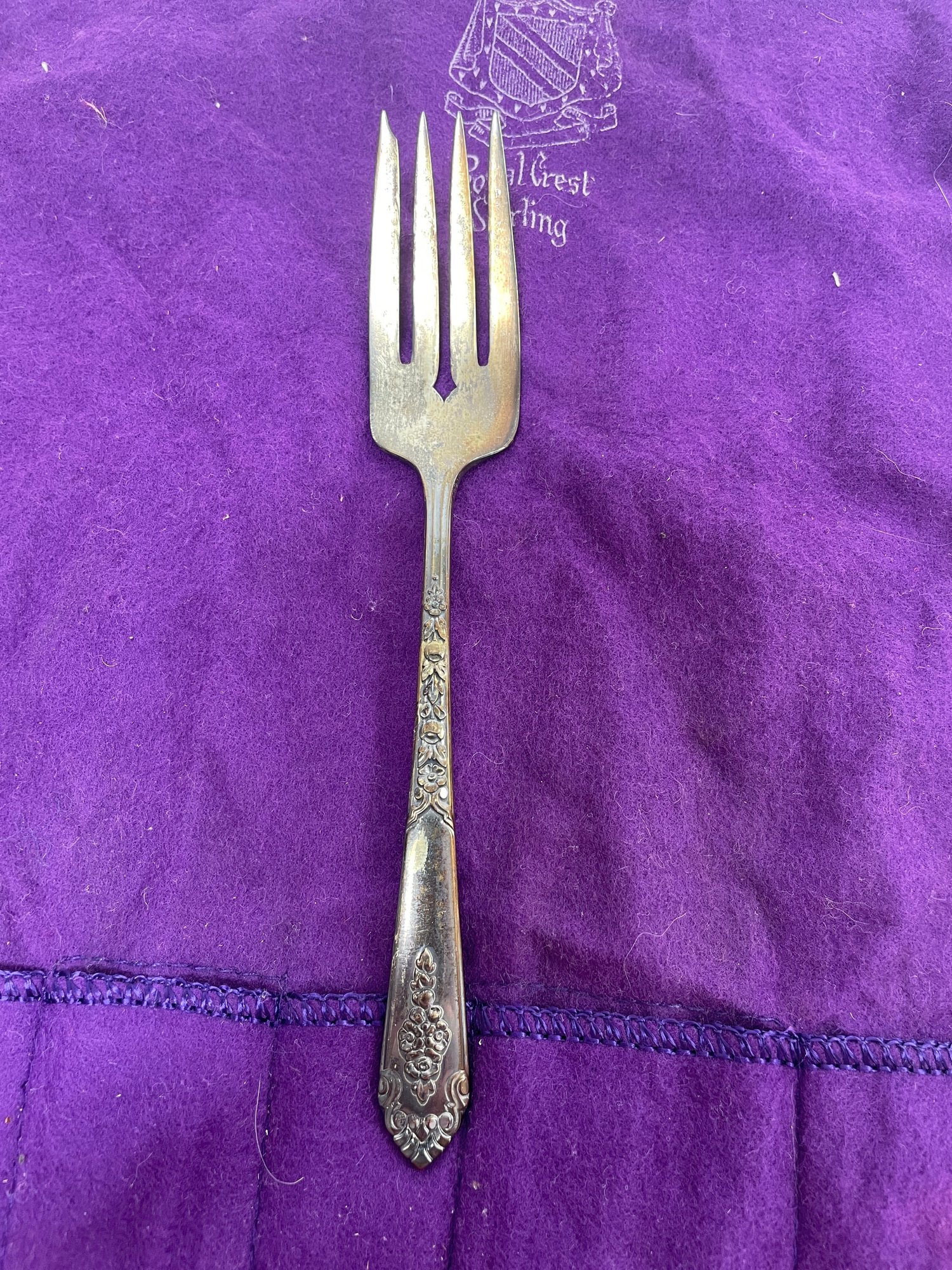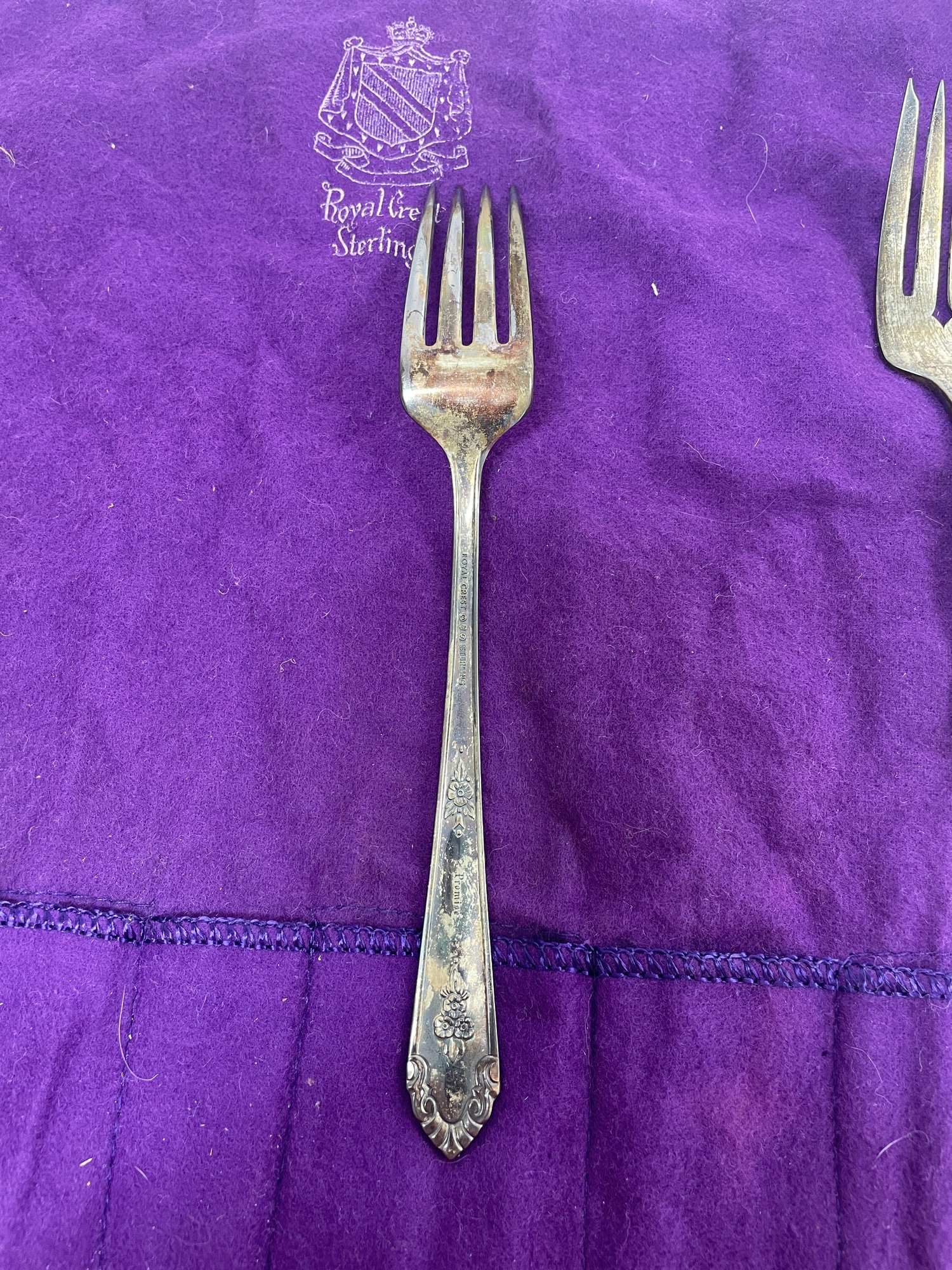 This is a beautiful set of Royal Crest Sterling “promise” flatware. They are in overall good condition but could use a nice polishing. There are 6 pieces total plus the roll up fabric case. Please see pictures for more details.