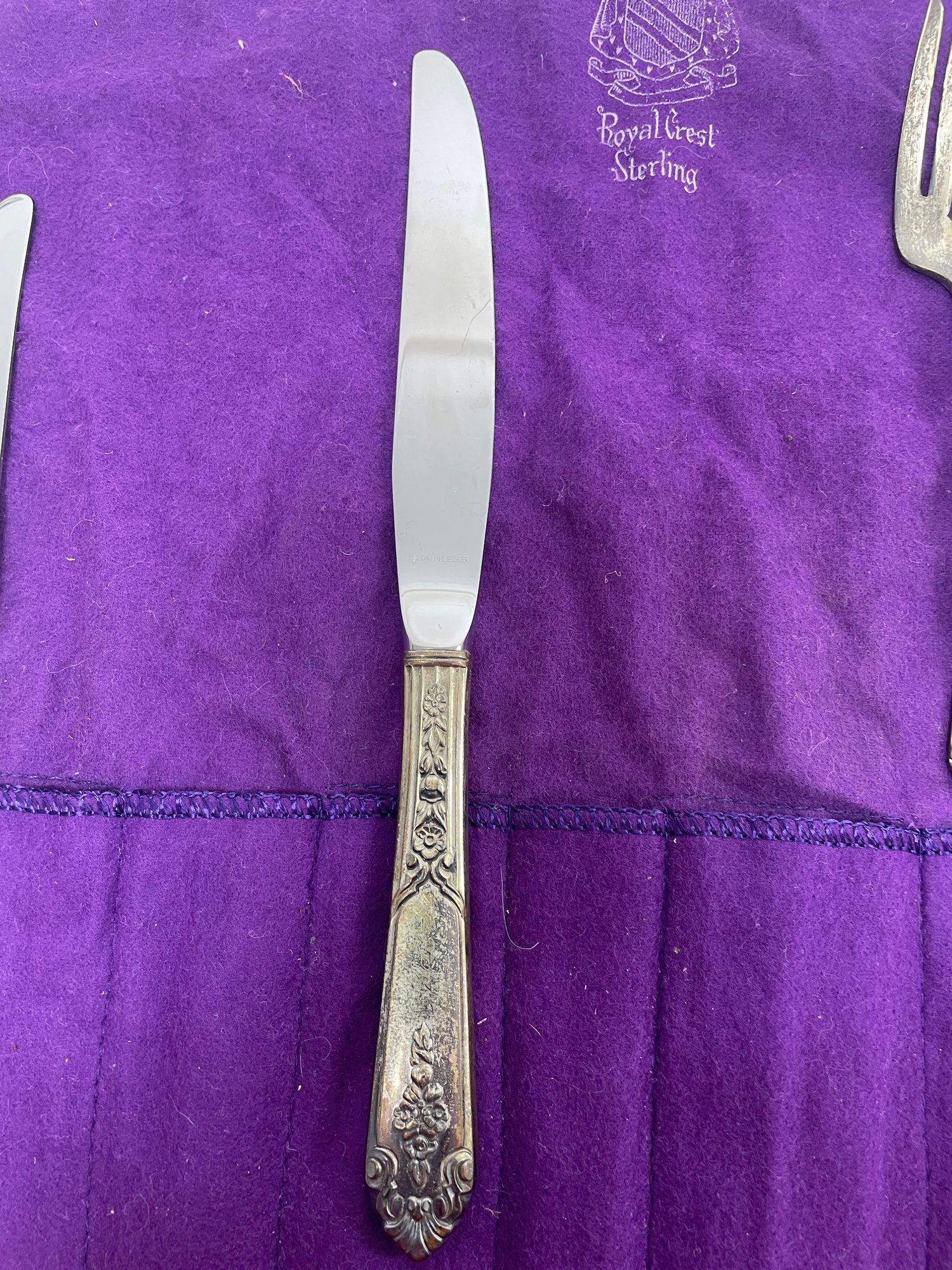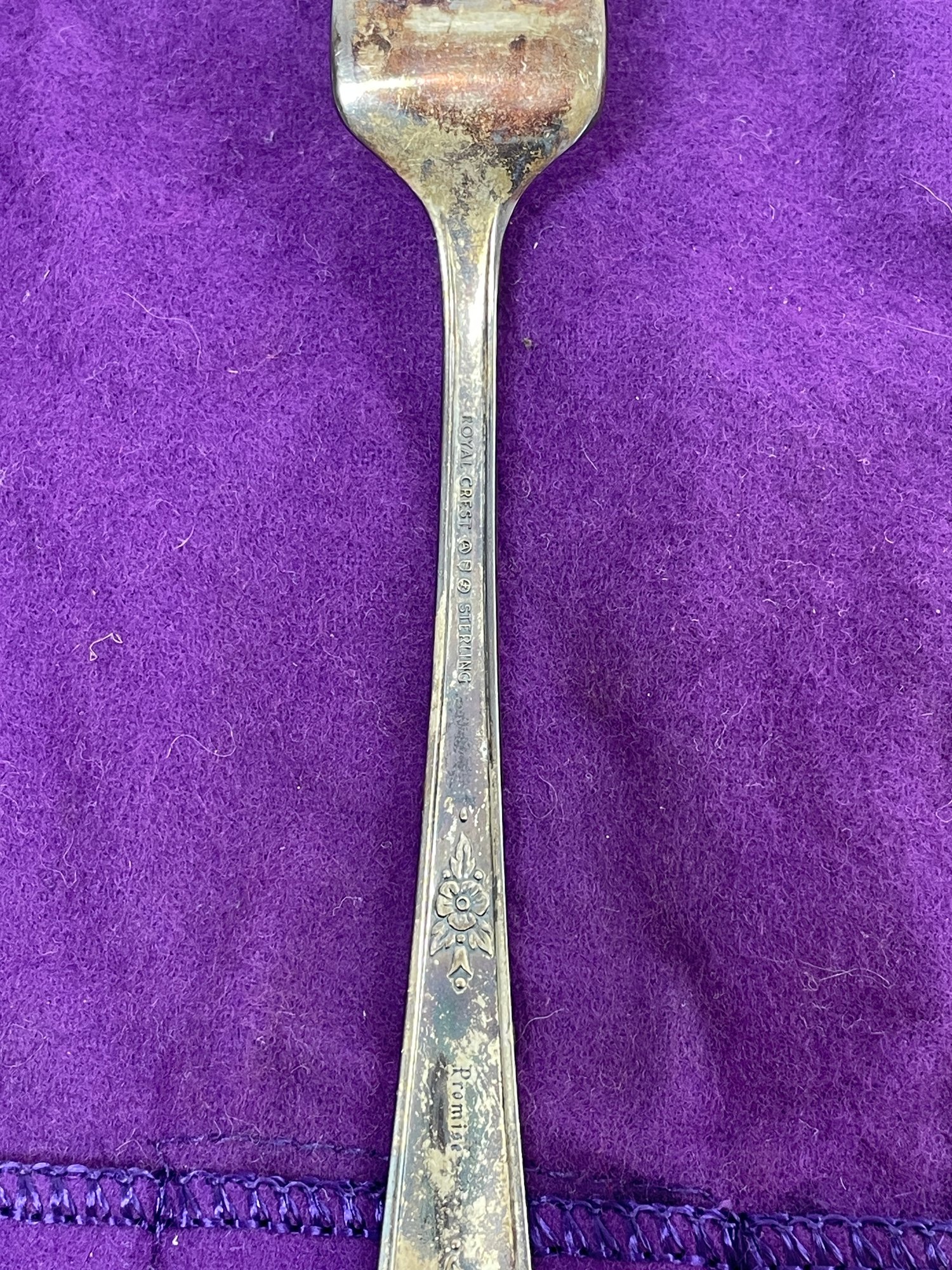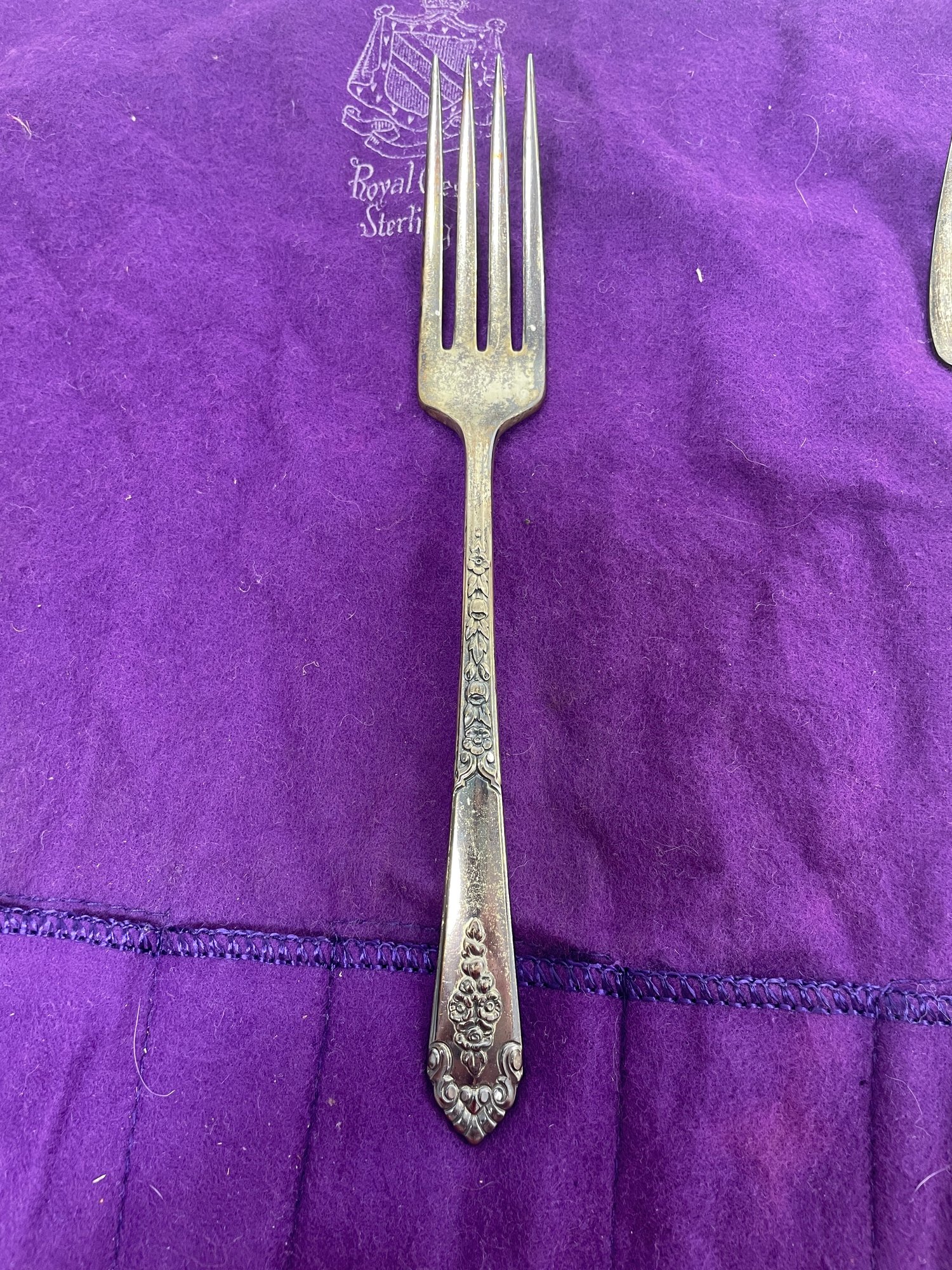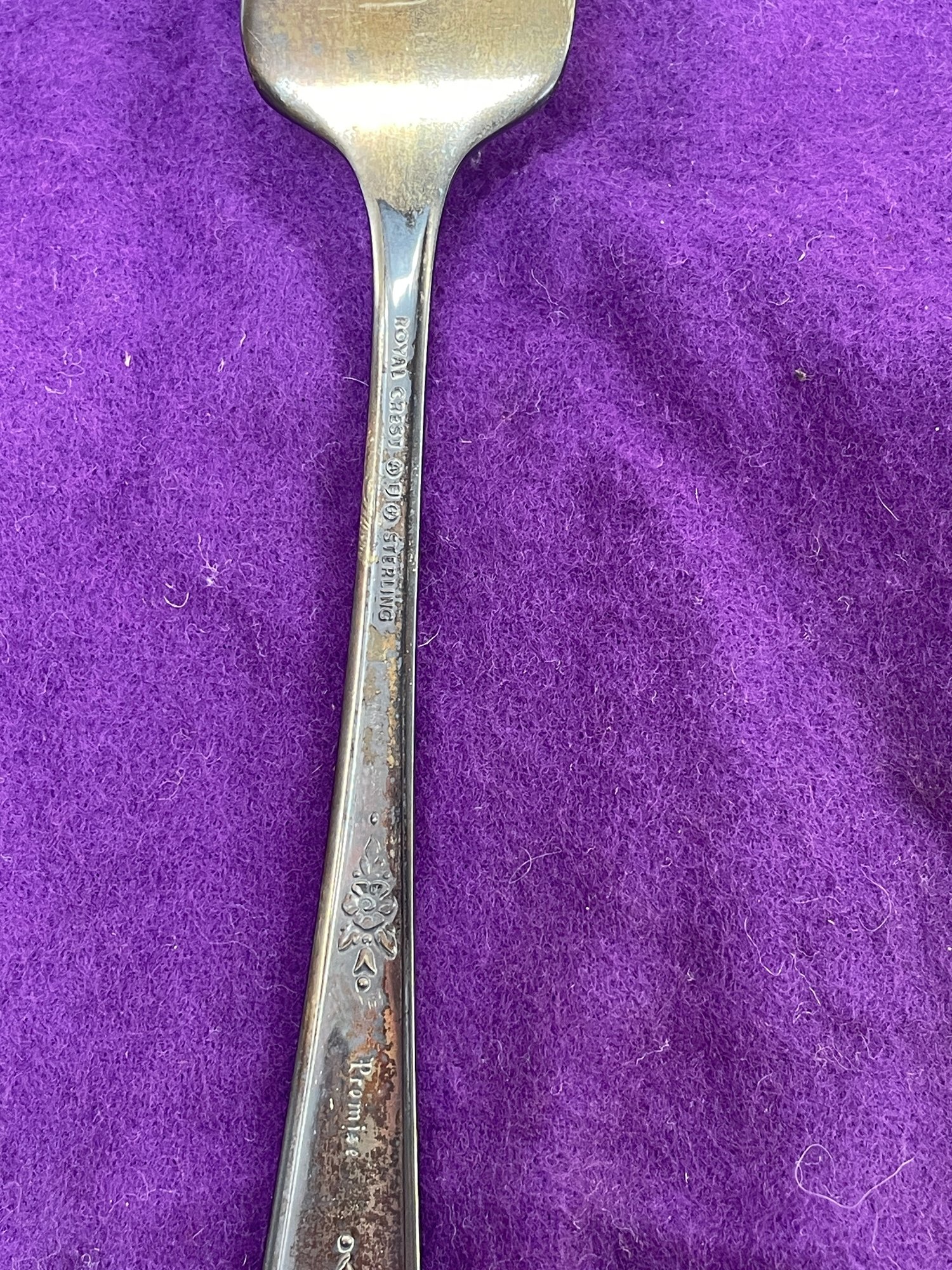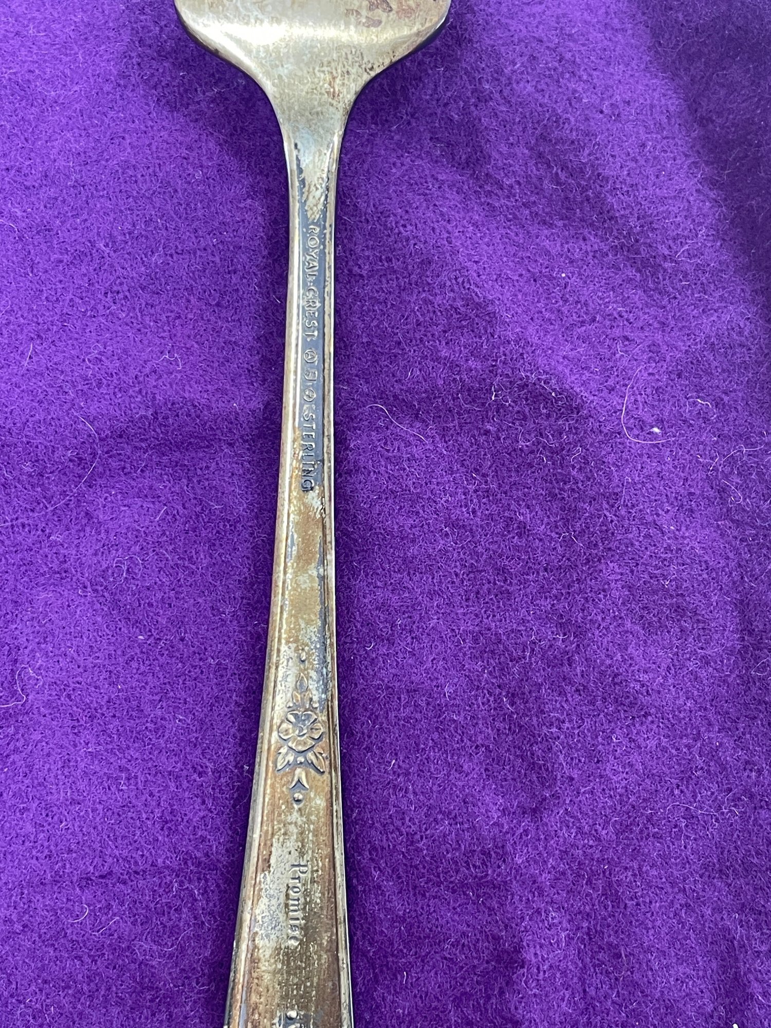 This is a beautiful set of Royal Crest Sterling “promise” flatware. They are in overall good condition but could use a nice polishing. There are 6 pieces total plus the roll up fabric case. Please see pictures for more details.