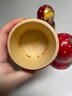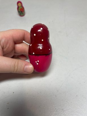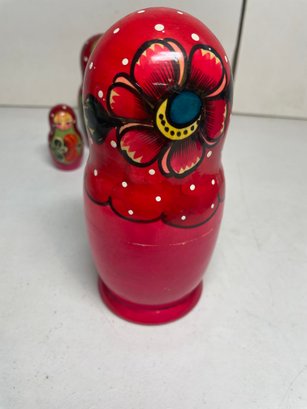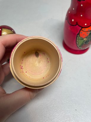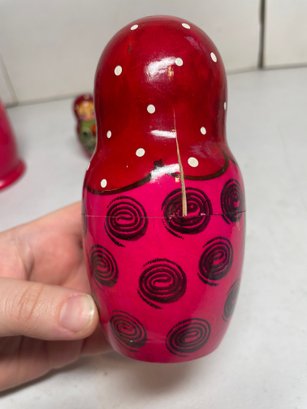 This is a nice set of Russian nesting dolls. Hand painted. Not sure how old they are or where they’re from as there’s no markings. The largest one has a couple of digs as shown in the pictures. The second largest one has a split as shown in the picture. The insides of some are stained pink. Overall still a nice display set.