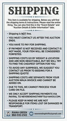 ~Shipping costs go by weight and location and are non-negotiable but we will try to find the cheapest option for you. To avoid any surprises we suggest you contact us prior to bidding to calculate your shipping cost. Shipping costs are SEPARATE from your Never Ending Thrifts LLC invoice and cannot be added on to the invoice.
