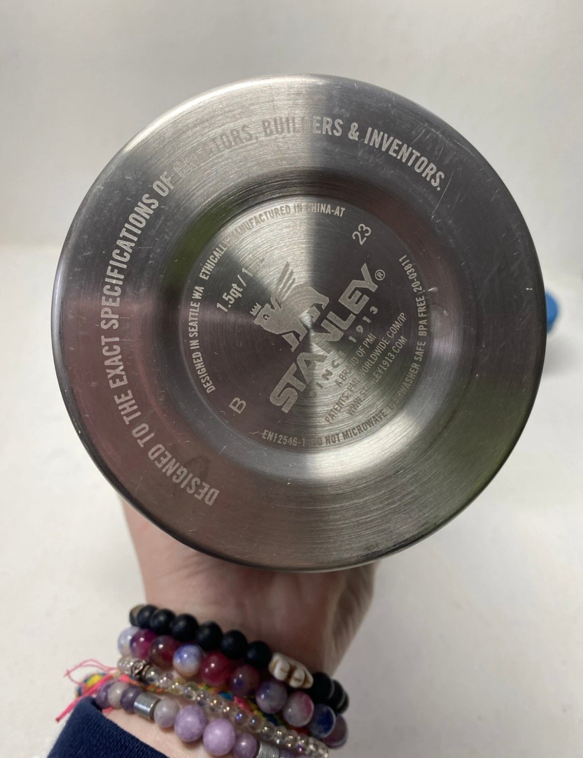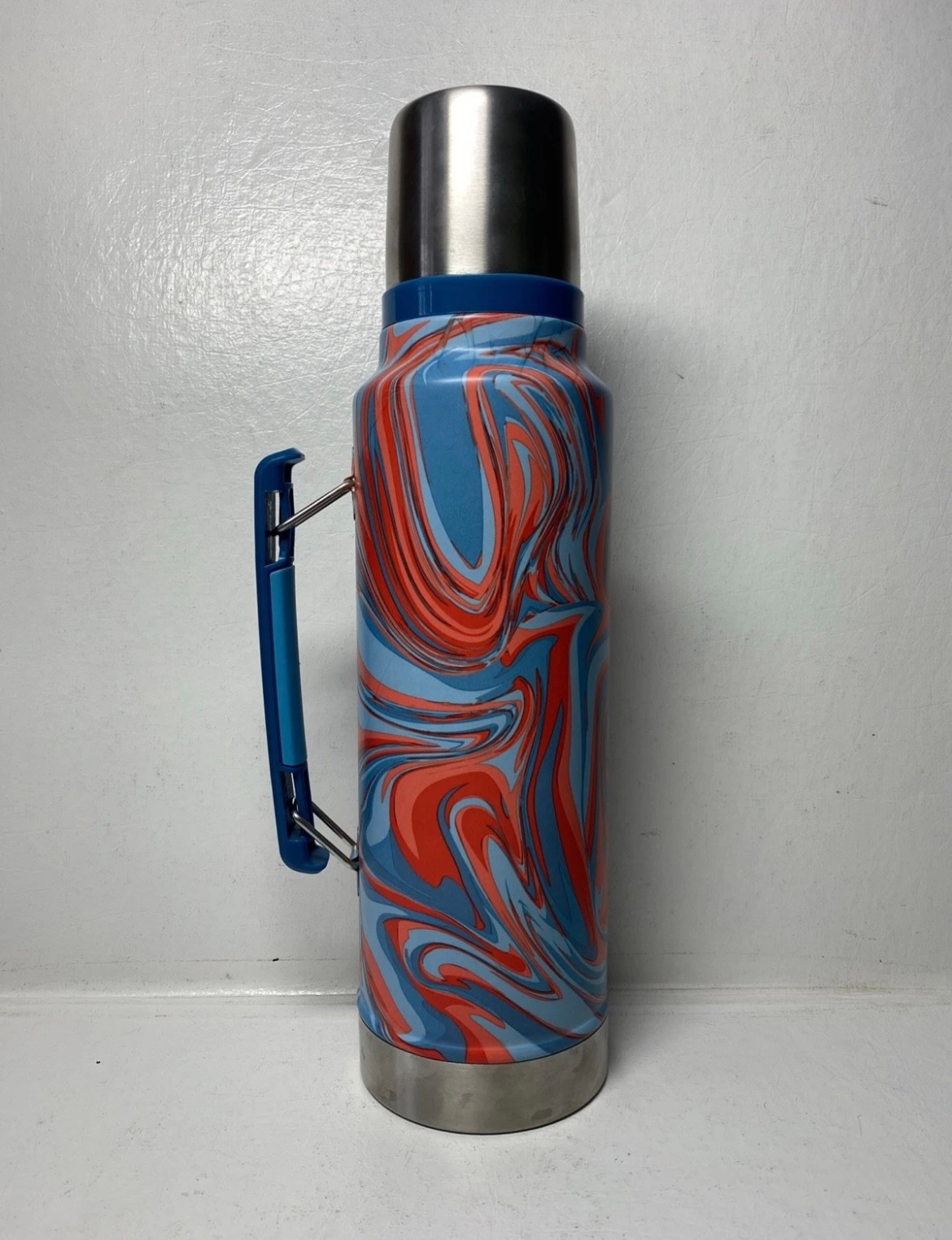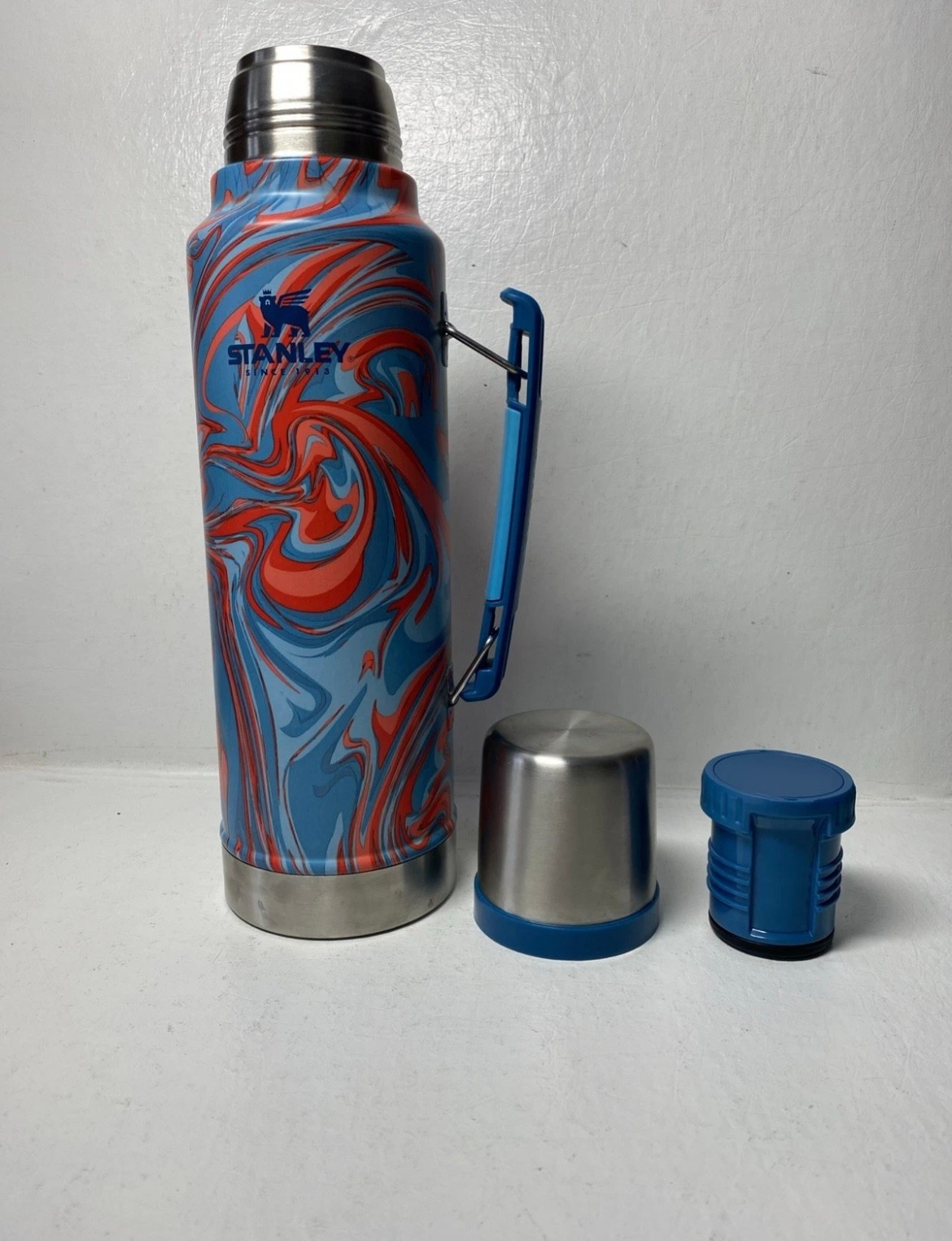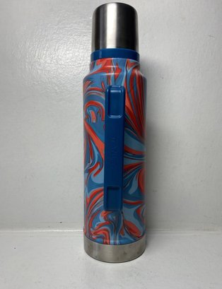 Stanley ice flow thermos is in great condition. It is 1.5qt. It features a cup on the top and the inside is clean. It’s 14.5 inches tall.