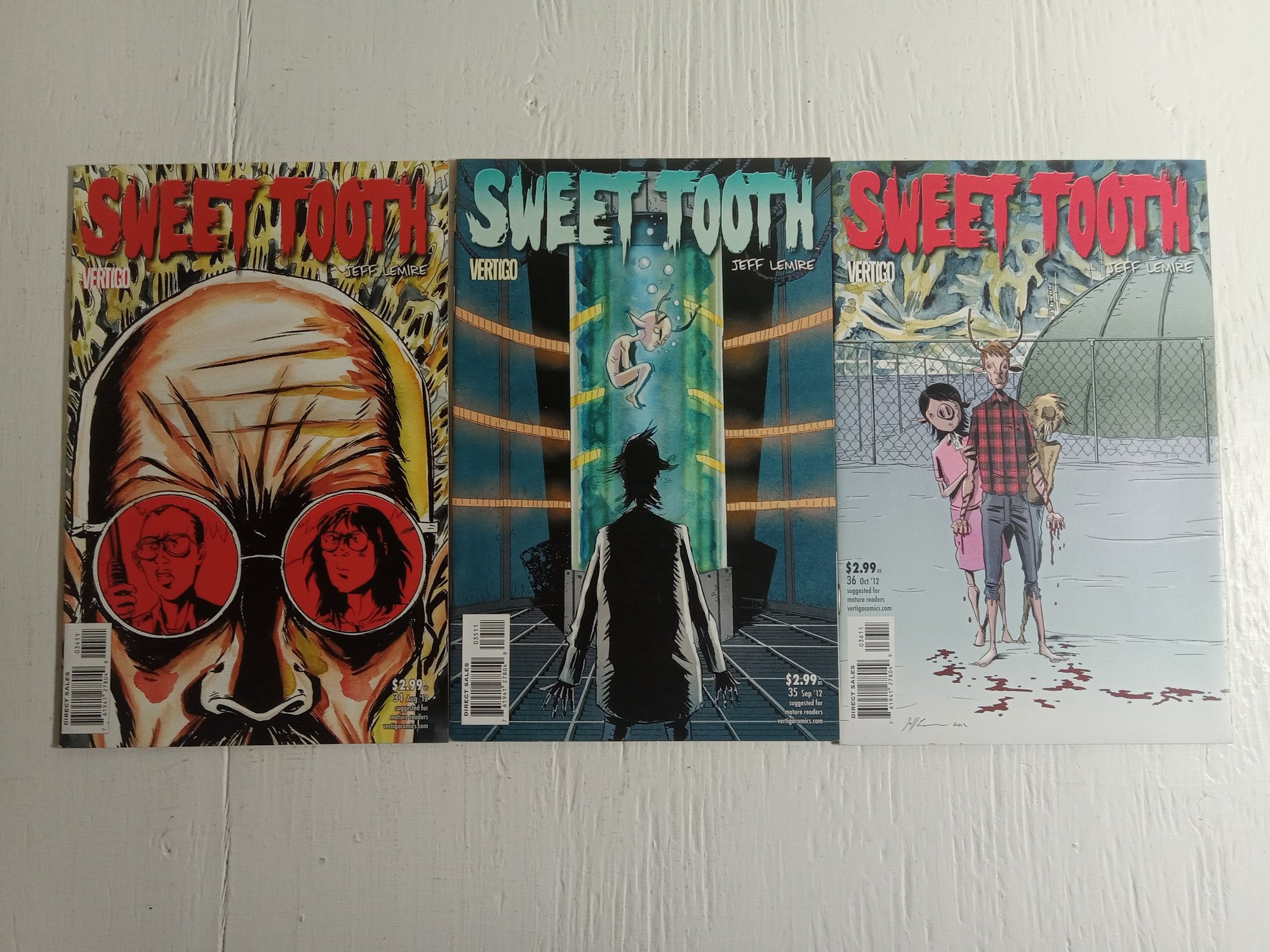 Lot of 5 sweet tooth comics, none of them are in mint conditon but should still get a good grade. Issues are #19, 34-36, and #38. Bagged and boarded.