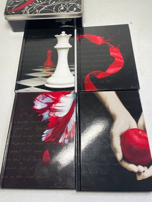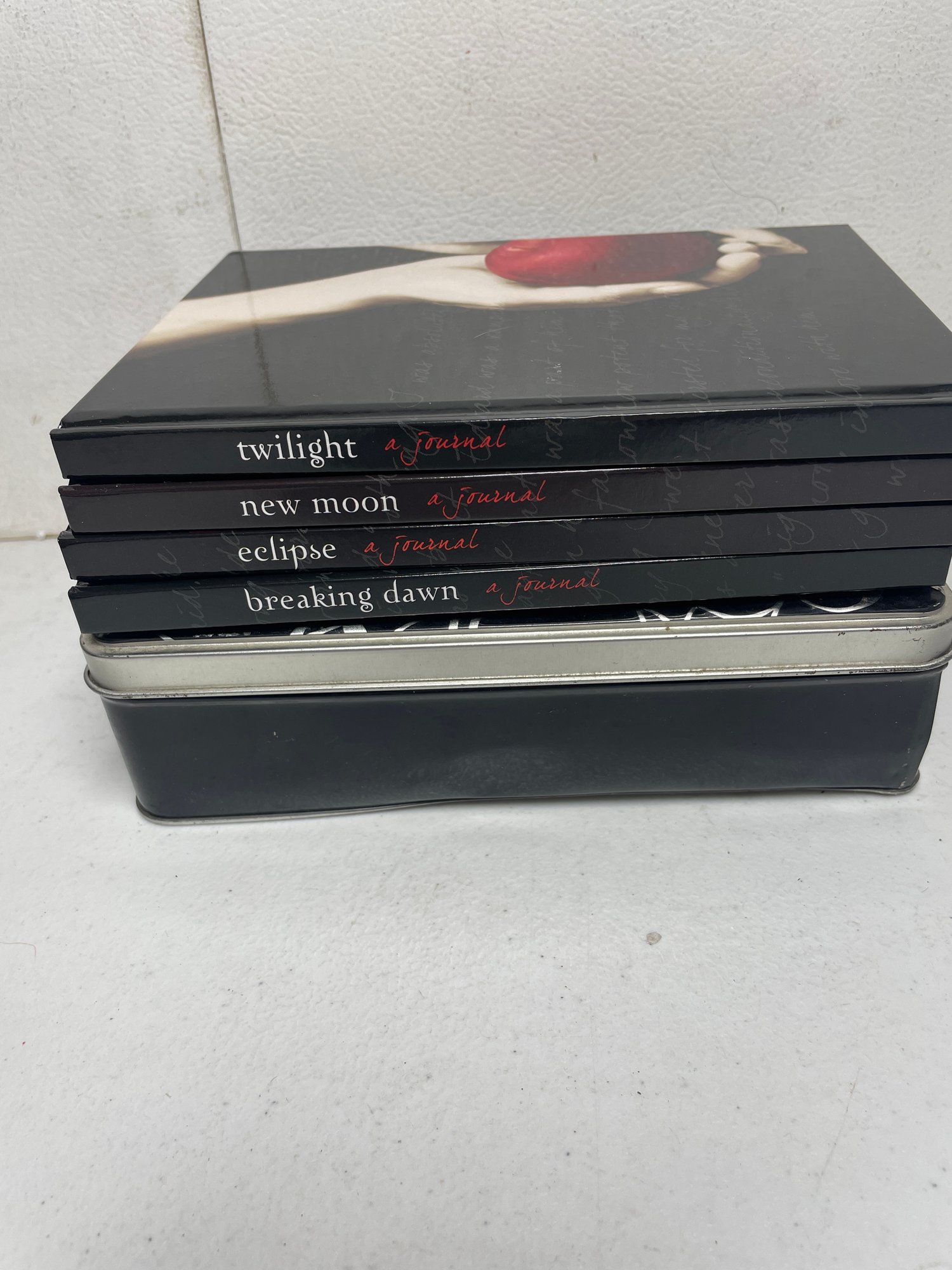 This is a set of 4 twilight journals with a metal case. The twilight journal has one page written in but the rest are cleaned. There is some rust spots on the meta case.