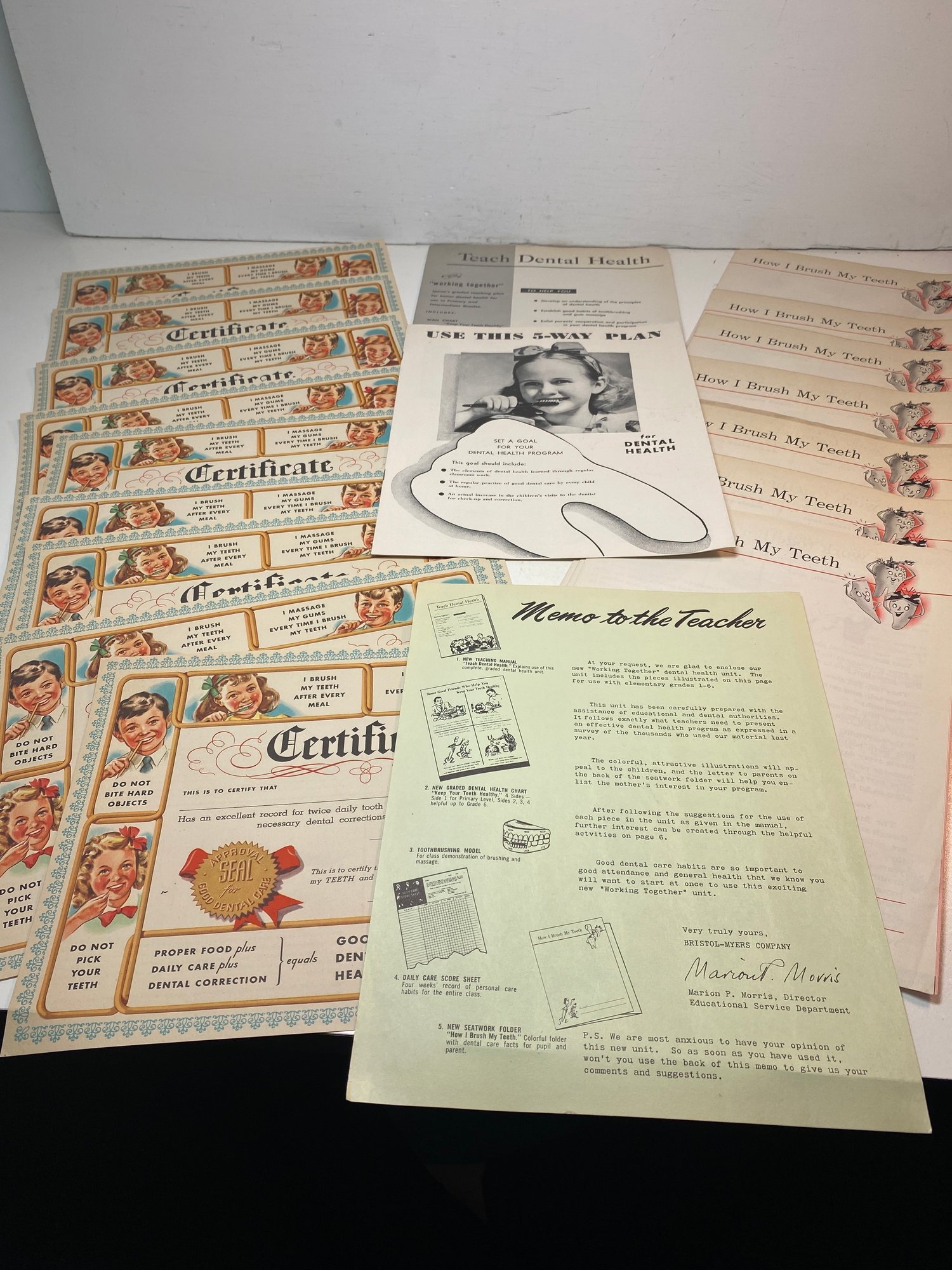 This set is in beautiful condition! There is some very minor discoloration from age but I don’t see any other flaws! This is a teacher’s set from 1945. Included is 10 unused certificates, 8 unused tooth brushes work books, 2 teacher’s guides and two information sheets.