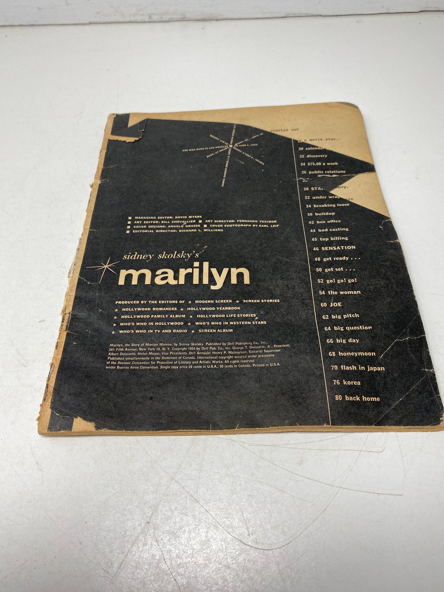 This magazine unfortunately is missing the front cover. There is some rips,tears,bends, and yellowing from age and use. The binding is also tattered but all pages are still intact nicely! There is a copyright of 1954.