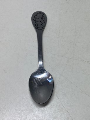 This spoon has some minor scratches from age and use. It has Winnie the Pooh engraved on the handle and is tommee tippee brand. This spoon measures 5.5” long.