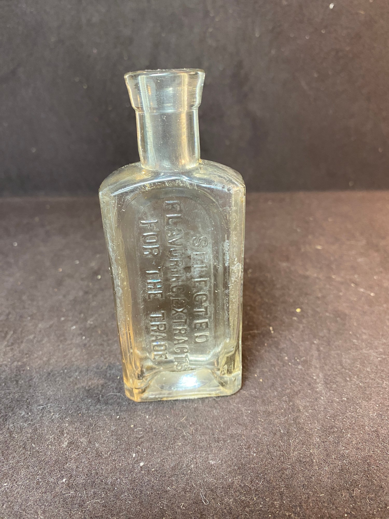 This bottle could use a deep cleaning but I don’t see any chips or cracks. The lid is no longer intact to the bottle. The bottle measures 5” tall and it says “ selected flavoring extracts for the trade” along the side.