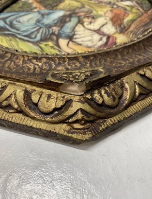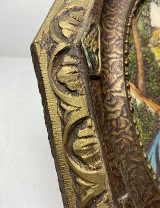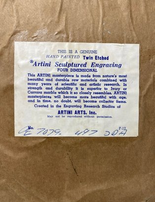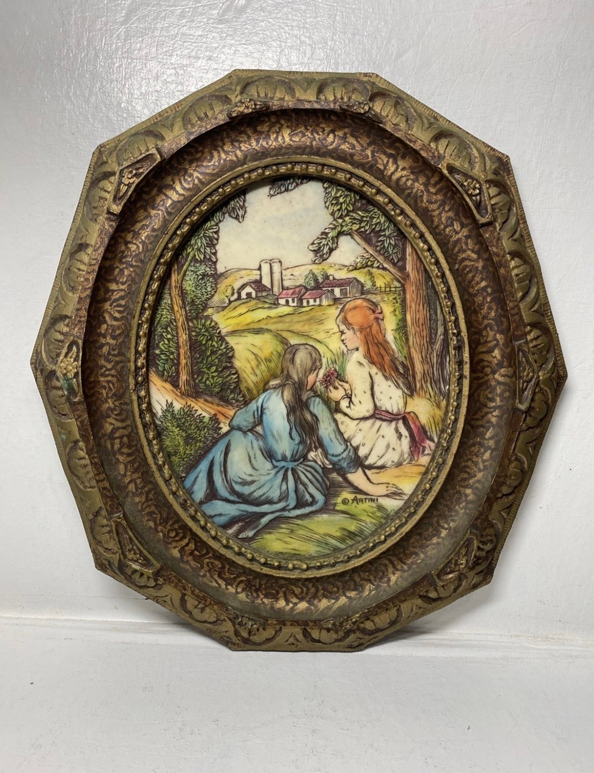 Artini sculpted engraving oval frame and painting good condition, the art it’s self is in good condition could use a cleaning up. The frame has a couple of flaws green discoloration, a small chip.