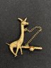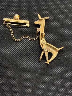 This giraffe is too cute! It has some very minor wear but nothing obvious. The giraffe is 2” tall and the pin is 1” long and includes a glass gem. Both pieces are unmarked and attached.