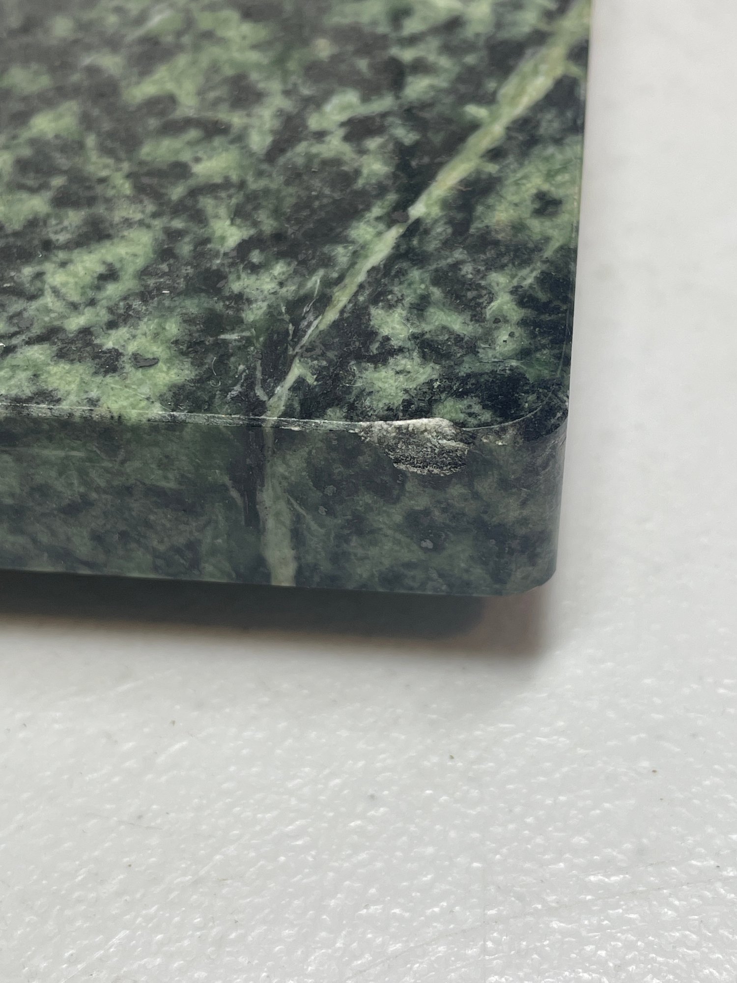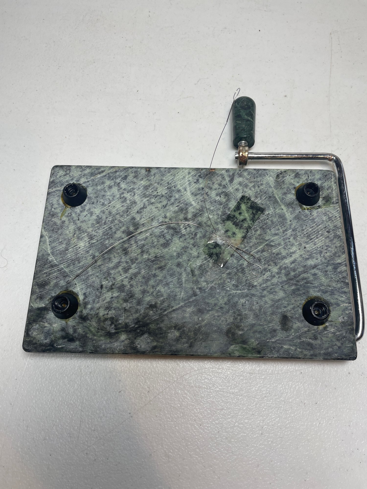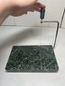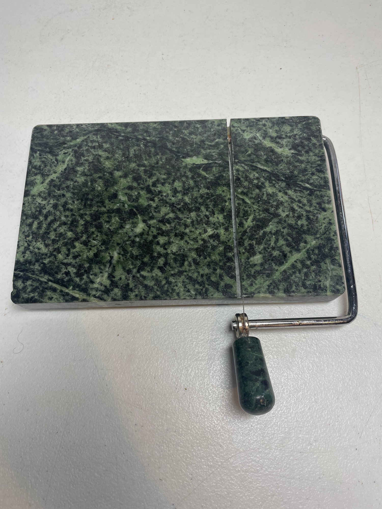 This is a nice green marble cheese slicer. Comes with an extra slicing string. Has one little chip on the side as shown in picture. Measures 8”x5”.