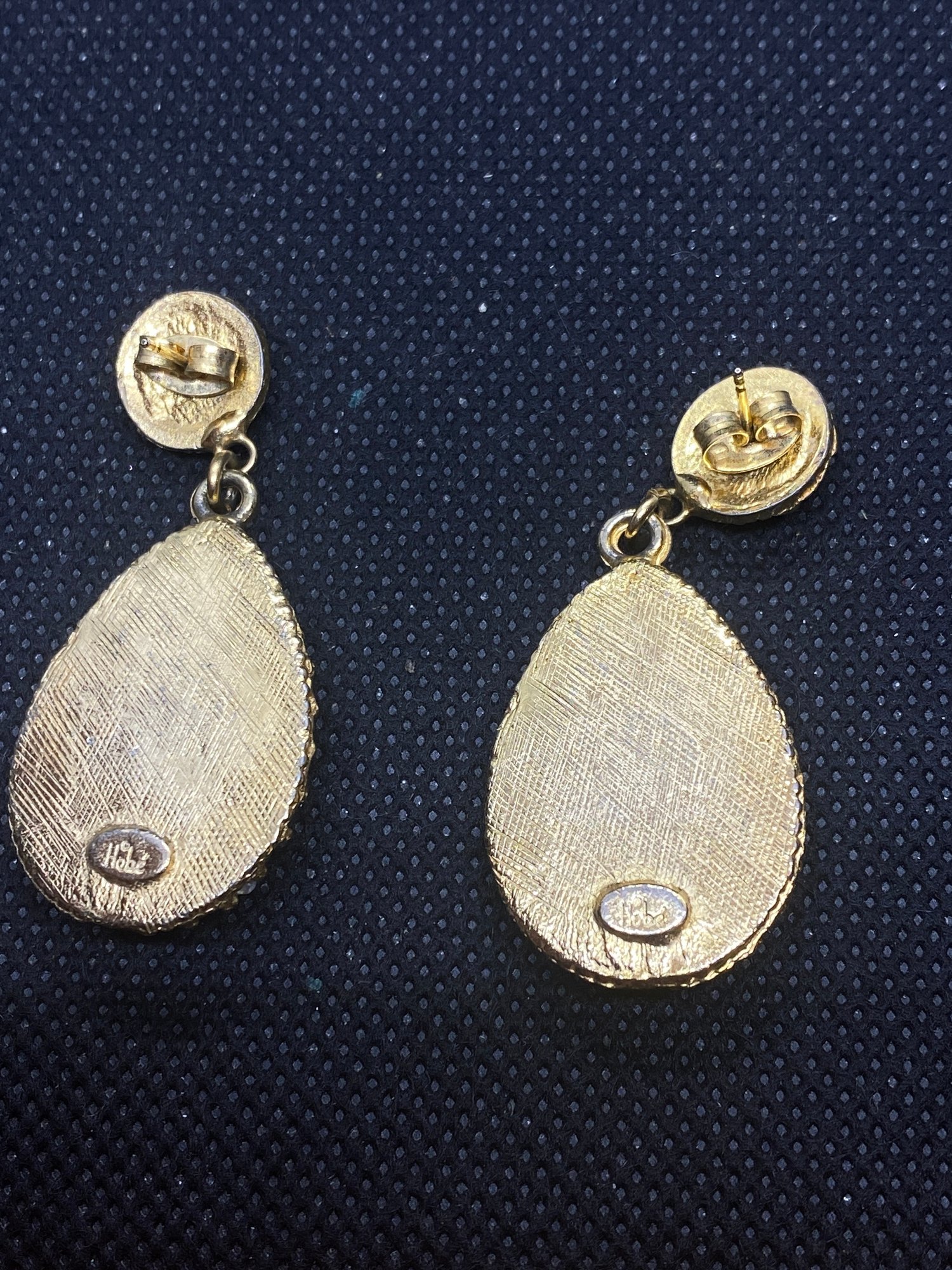 These earrings are gorgeous! They do have some very minor tarnishing and some of the stones are flaking off but are included and just need to be glued back on. They have a 1.25” drop and are marked “Hobe” on the back.
