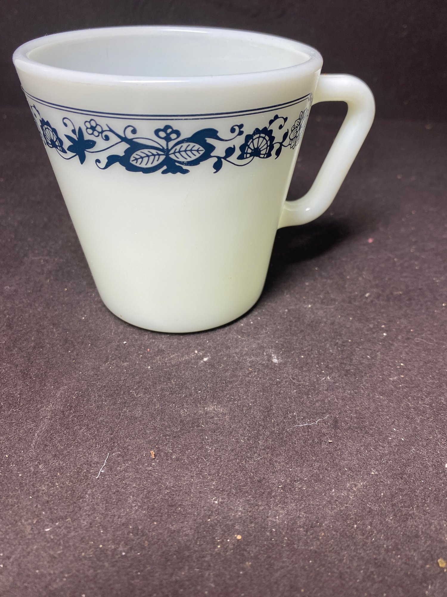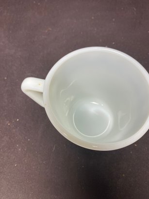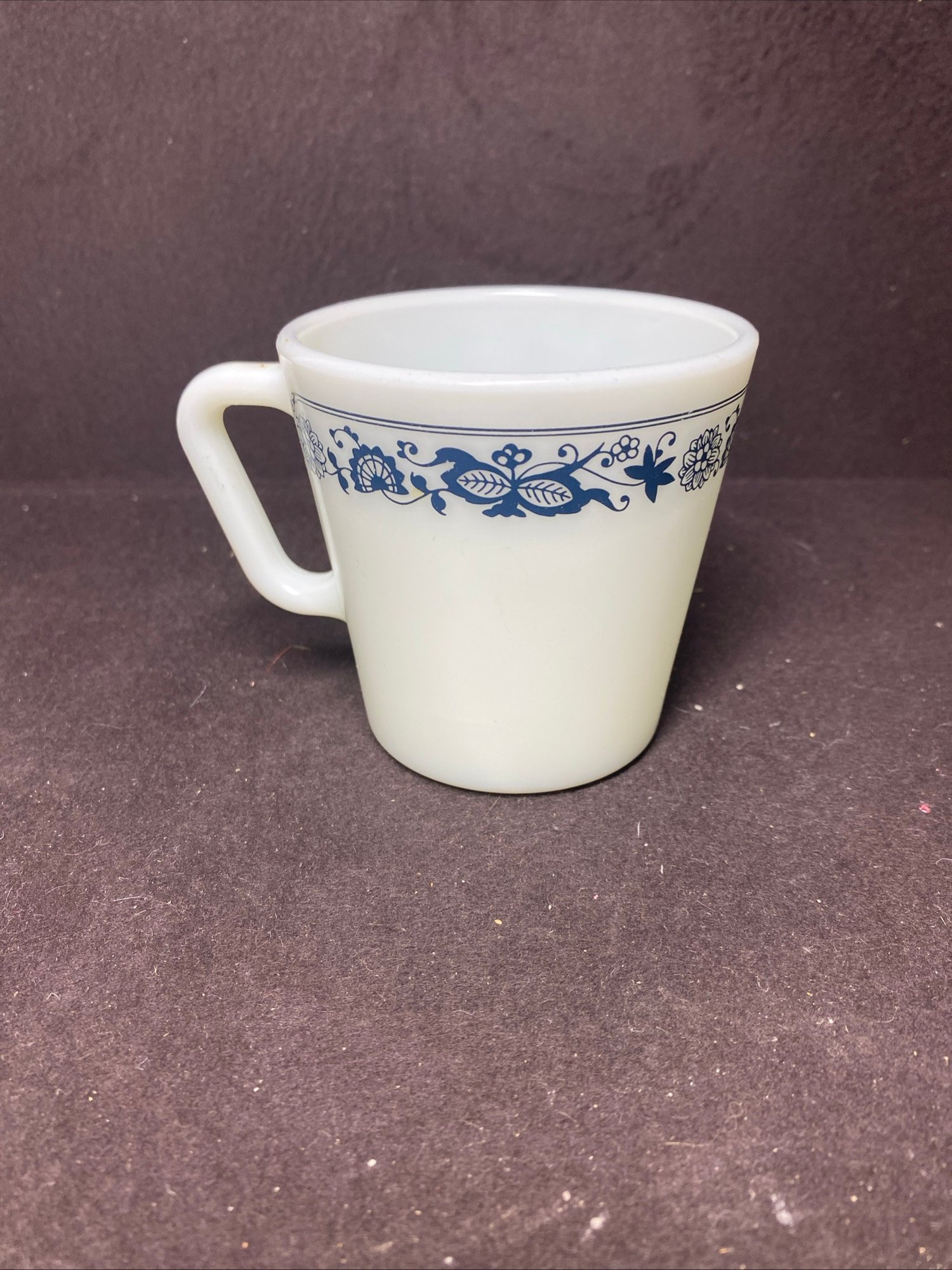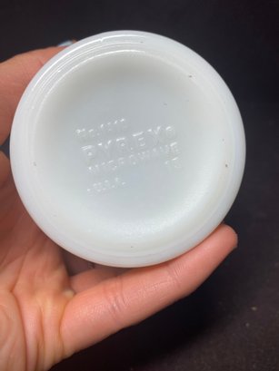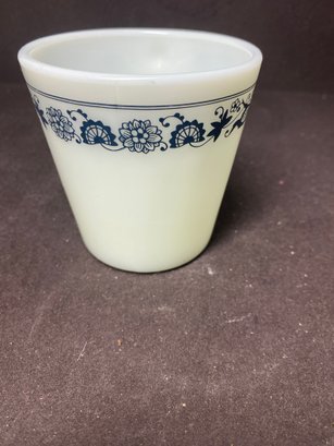 This coffee cup could use a detailed cleaning but has no chips or cracks. The pattern is still very vibrant and doesn’t look chipped at all. This is a vintage Pyrex piece and is no. 1410 and measures 3.5” tall and 3.5” in diameter.
