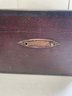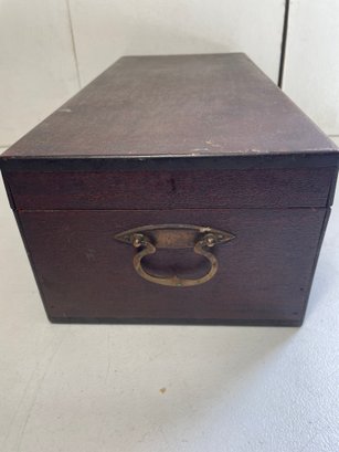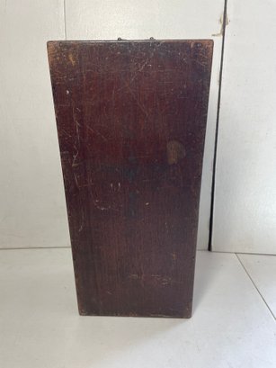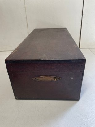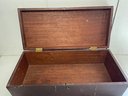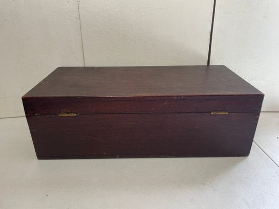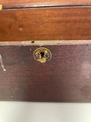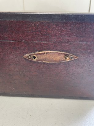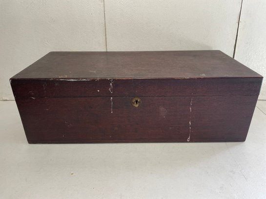 This is a nice vintage wooden box. It does have some stains on it and paint as shown in the pictures along with some minor scratches. The handle is missing on one side. We do not have the key for the box. The box measures 18” long, 8” deep, and 6” tall.