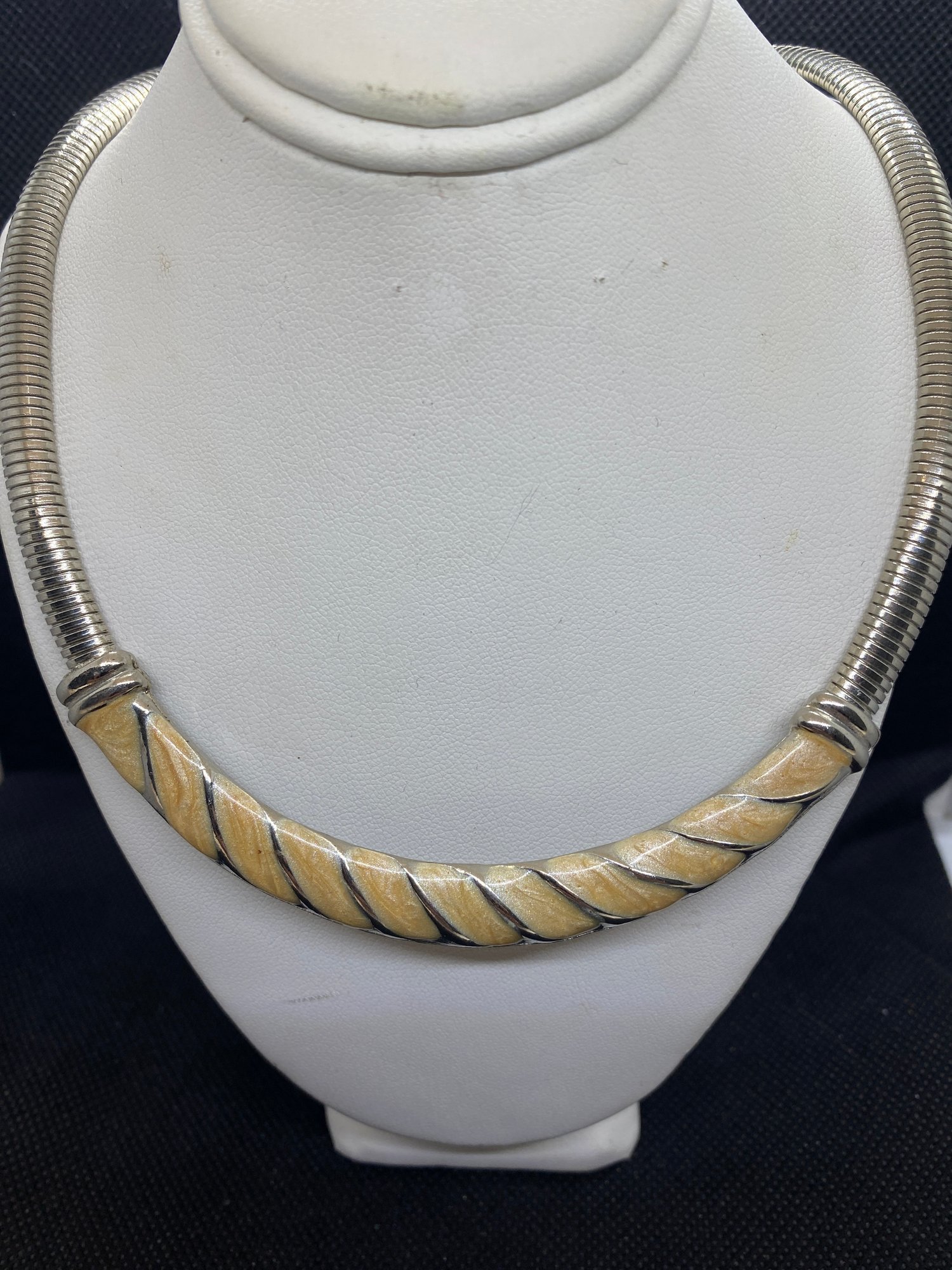 This beautiful necklace is a quality vintage piece! It measures 7” in diameter when clasped and is a silver tone with marbled accents. It is unbranded but is on the heavier side and was definitely made with quality material.