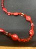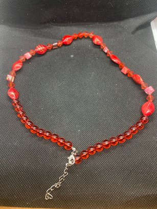 This necklace appears to be lucite but is definitely vintage! It is slightly worn(mostly on the metallic swirl pieces) but I don’t see any other flaws! It measures 9.5” long when clasped.