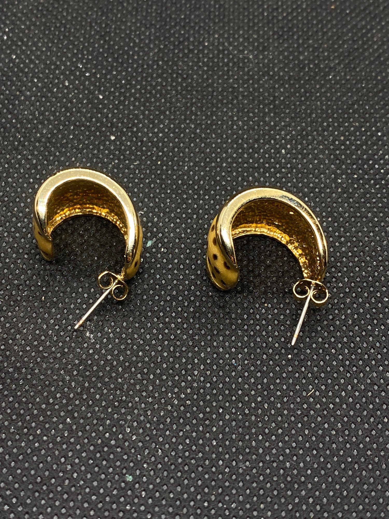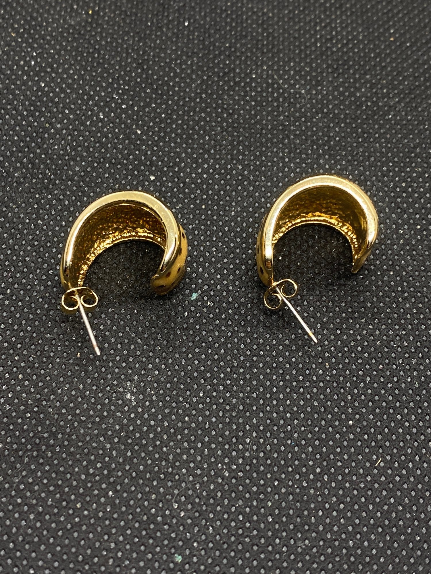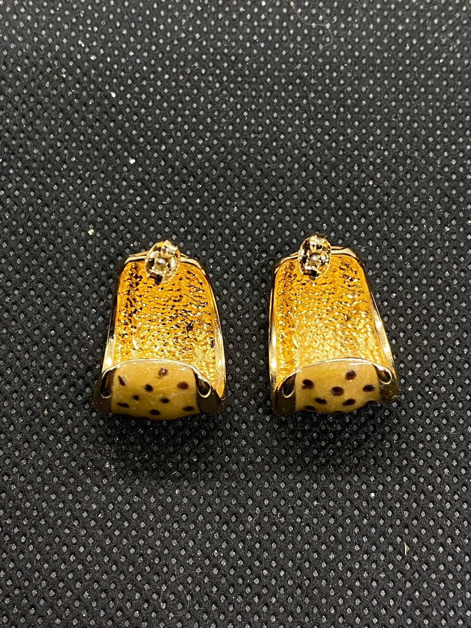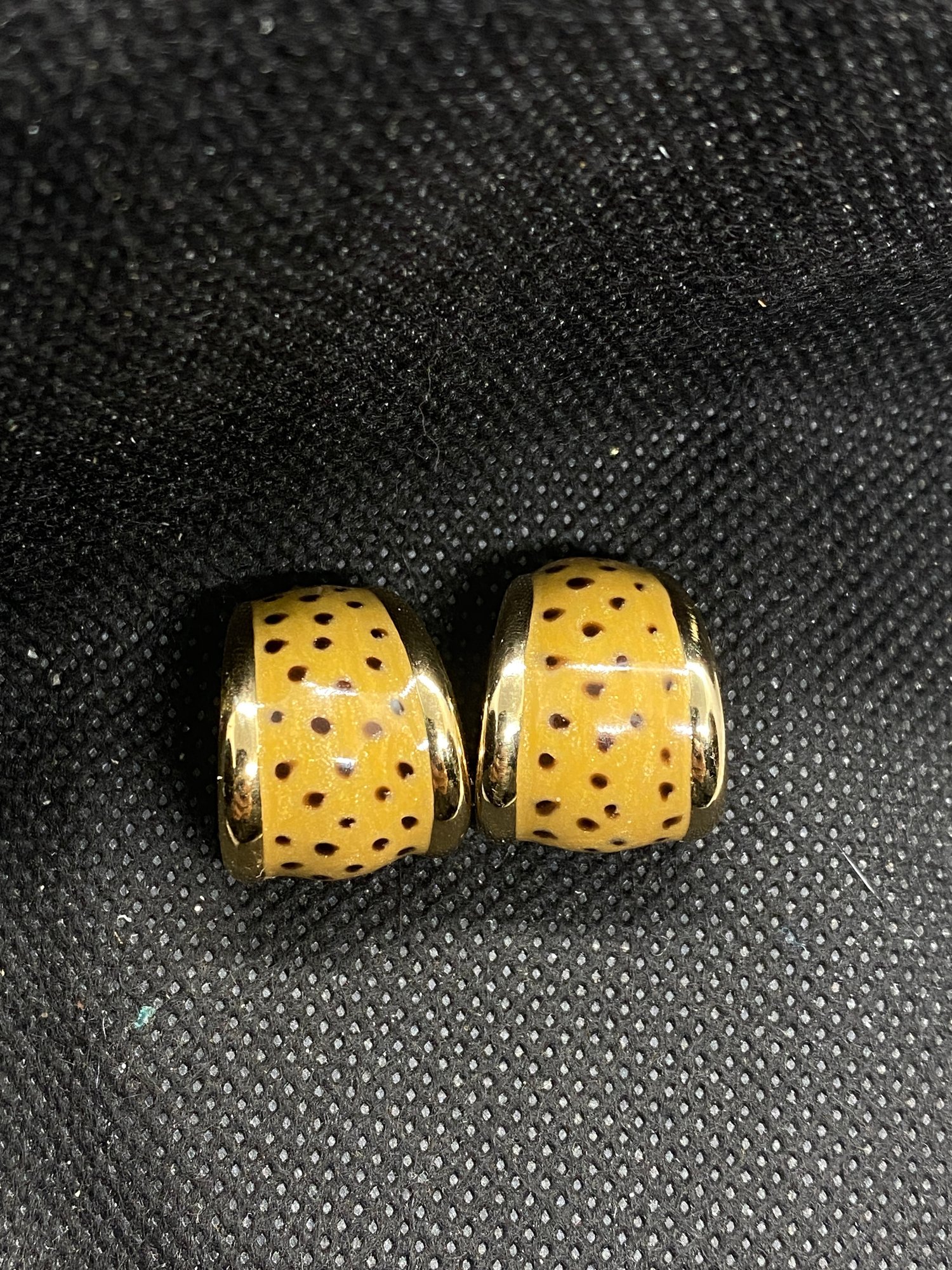 These earrings are in beautiful condition and don’t appear to have ever been worn! They are unmarked and have a nice shiny polka dotted enamel on them. They have a beautiful shine.75” drop.
