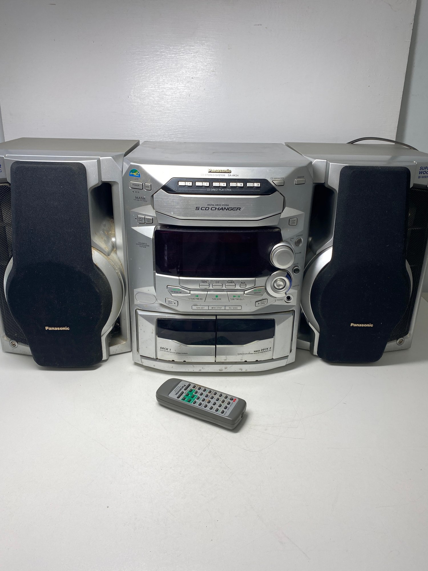 This stereo system is in excellent working condition! All buttons and knobs work and it even includes the remote which also works great! There is some scuffs and scratches throughout from age and use. It is a little dusty and dingy and would benefit from a deep and detailed cleaning. There is no antenna included and would need a new one to use the radio. This is a Panasonic model SA-AK24. The speakers measure 13” tall,10” wide and 9.75” deep. The stereo measures 11” wide,12.75” tall, and 11” deep.