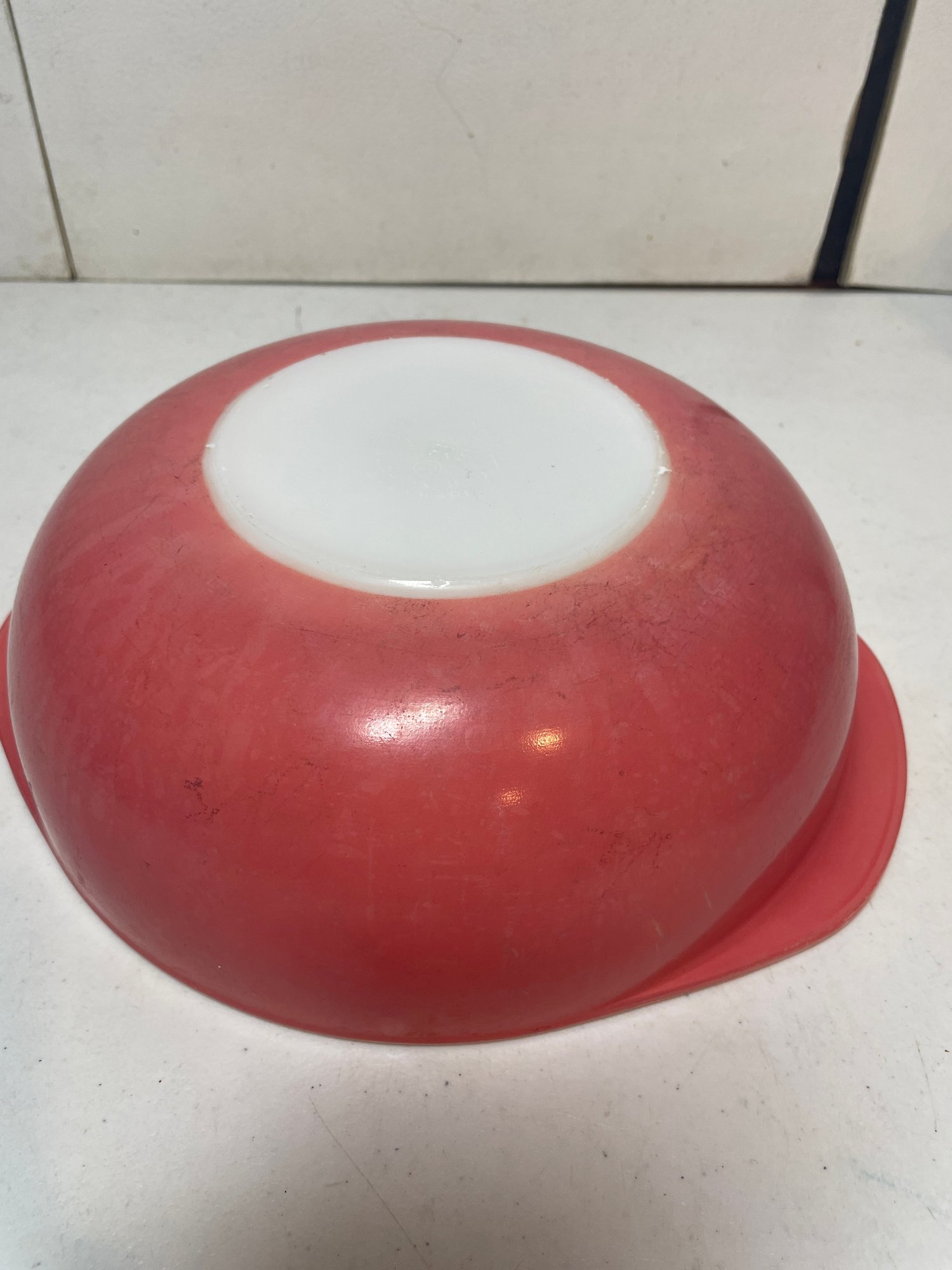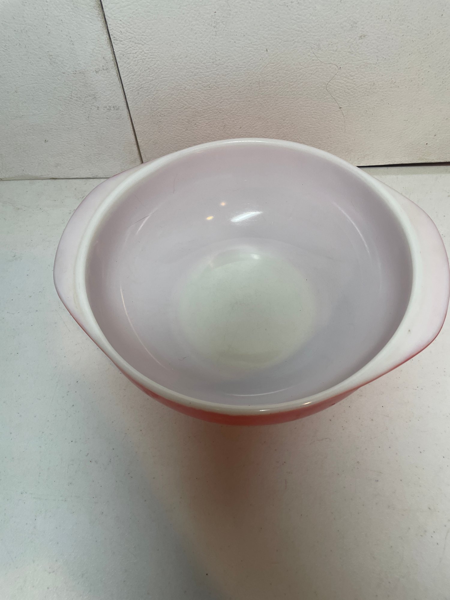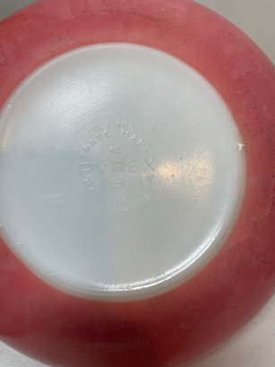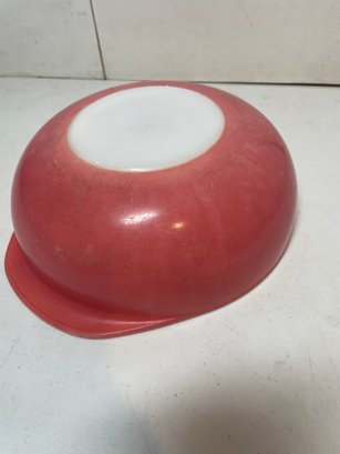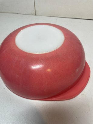 This is a pink Pyrex 2qt mixing bowl. Not sure if it was suppose to have a lid but we do not have it. Does have some wear and tear on the pink as shown in the pictures with several scratches and faded spots. 8 1/2” in diameter and 3” tall.