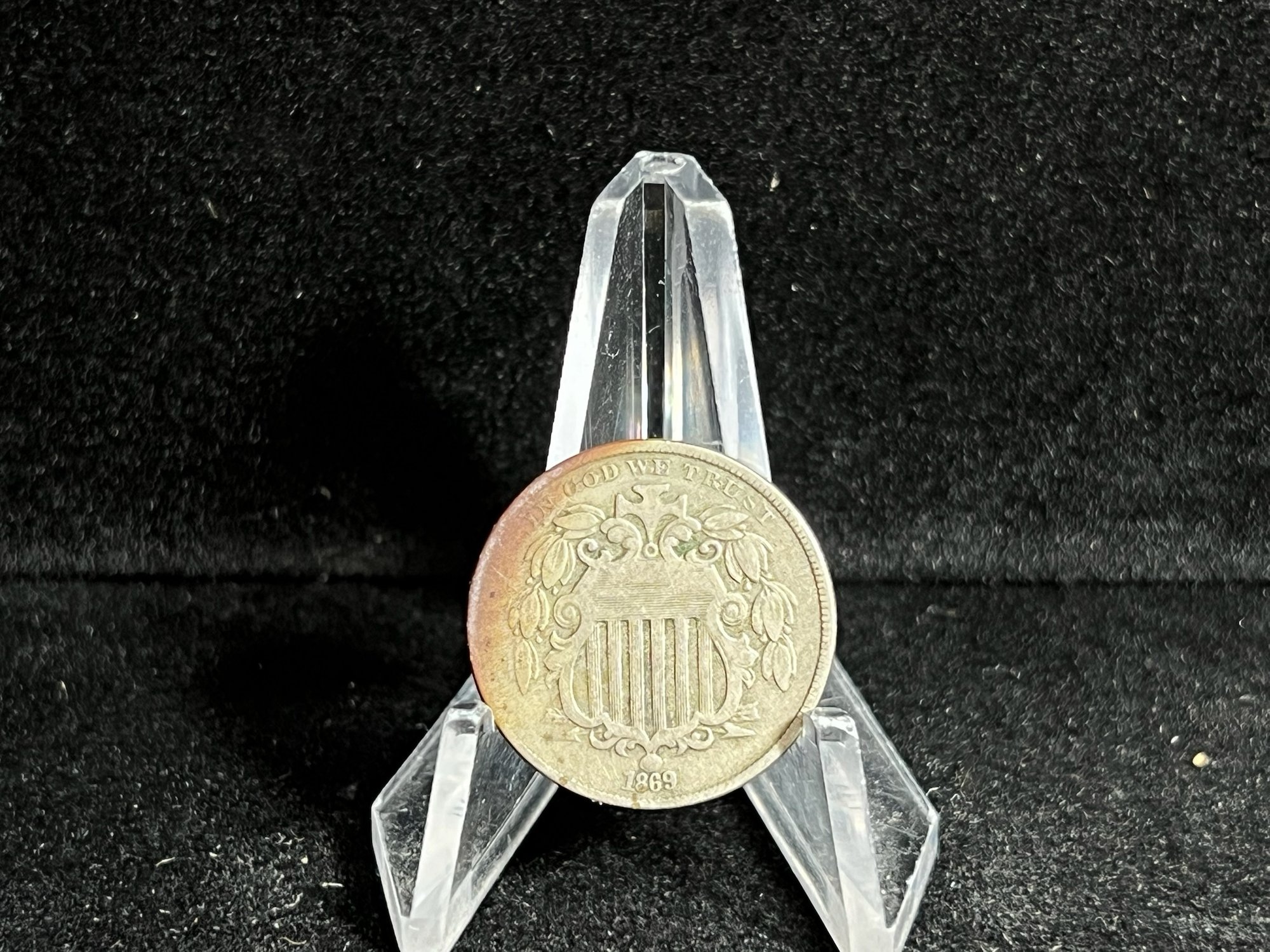 You are bidding on an 1869 Shield Nickel 5 Cent. This coin would make a great addition to your collection. Please see all photos before bidding.
