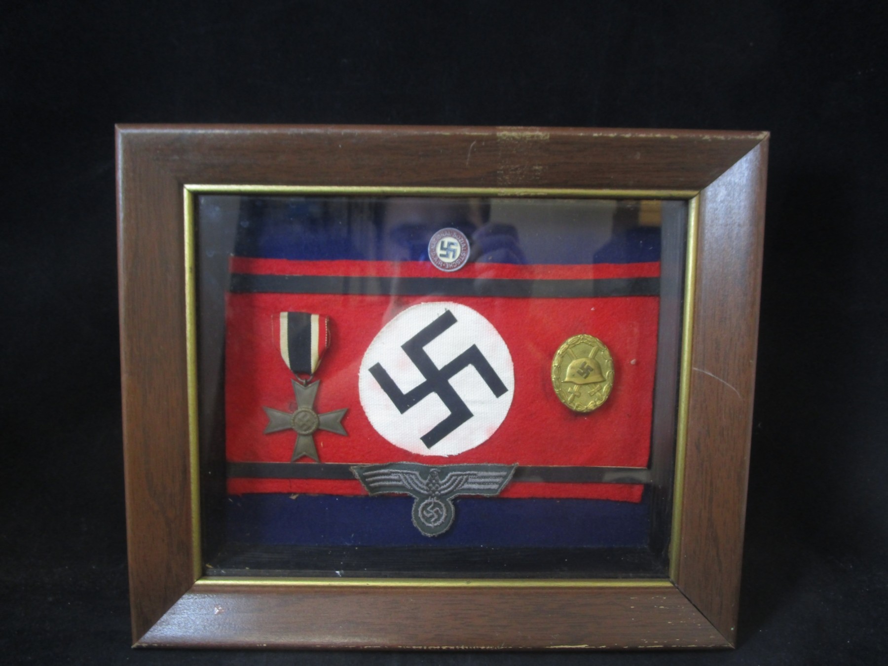 This piece is in great condition The two medals on the band and the patch on the bottom appear to be original. But the red arm band appears to be a re production made for this display. Please see all photos before bidding. This case is about 12 inches wide and about 10.25 inches long and 2.5 inches deep.