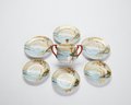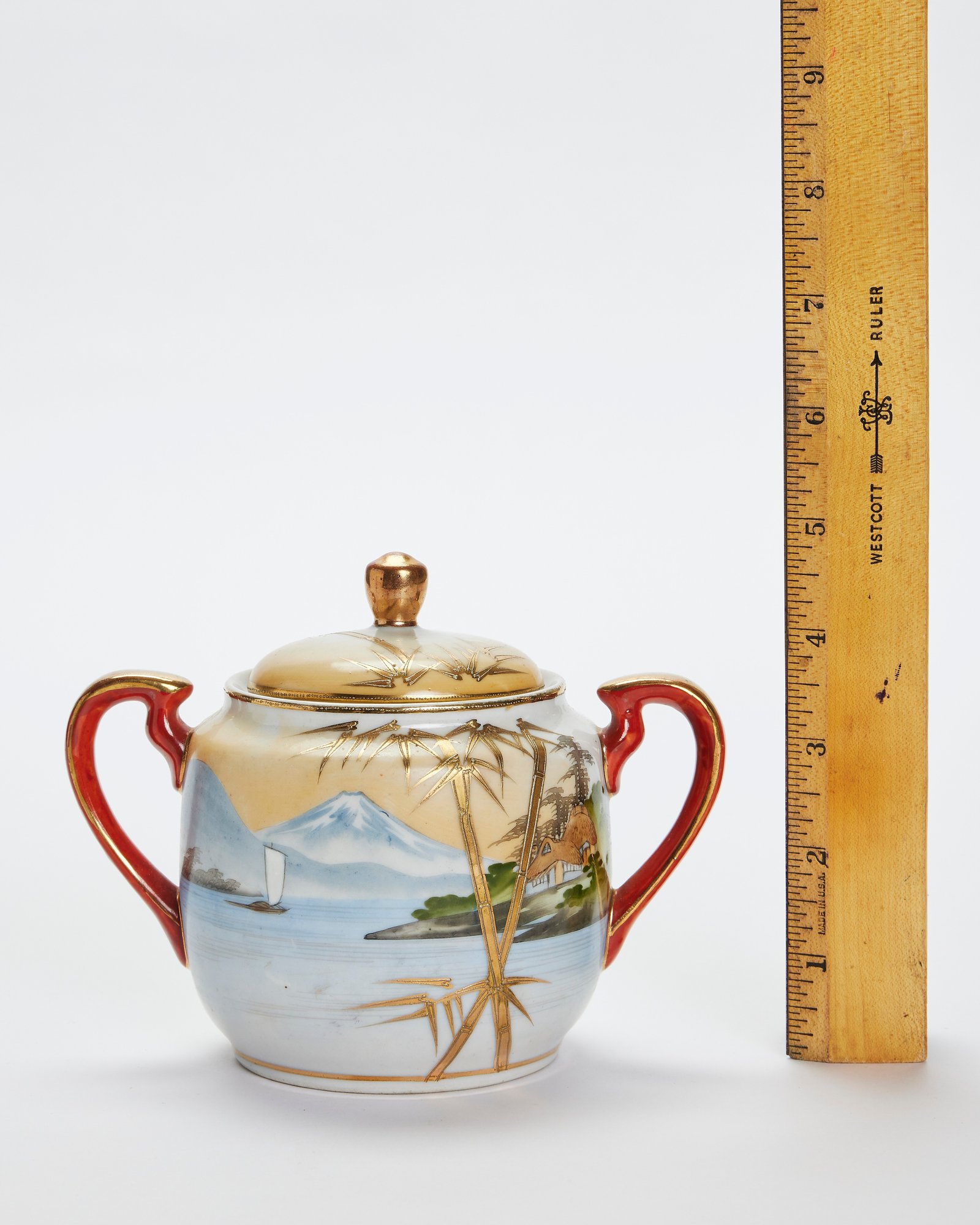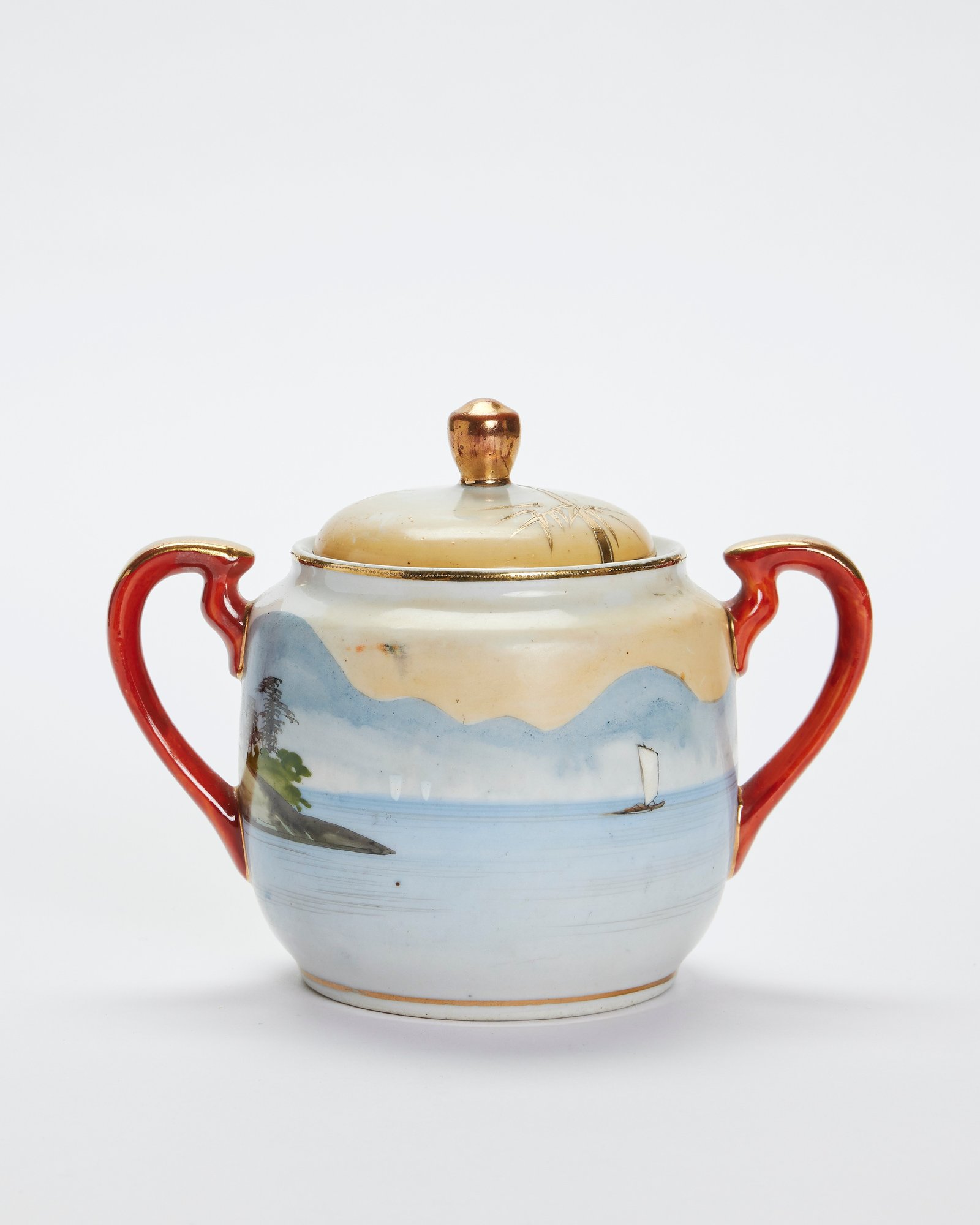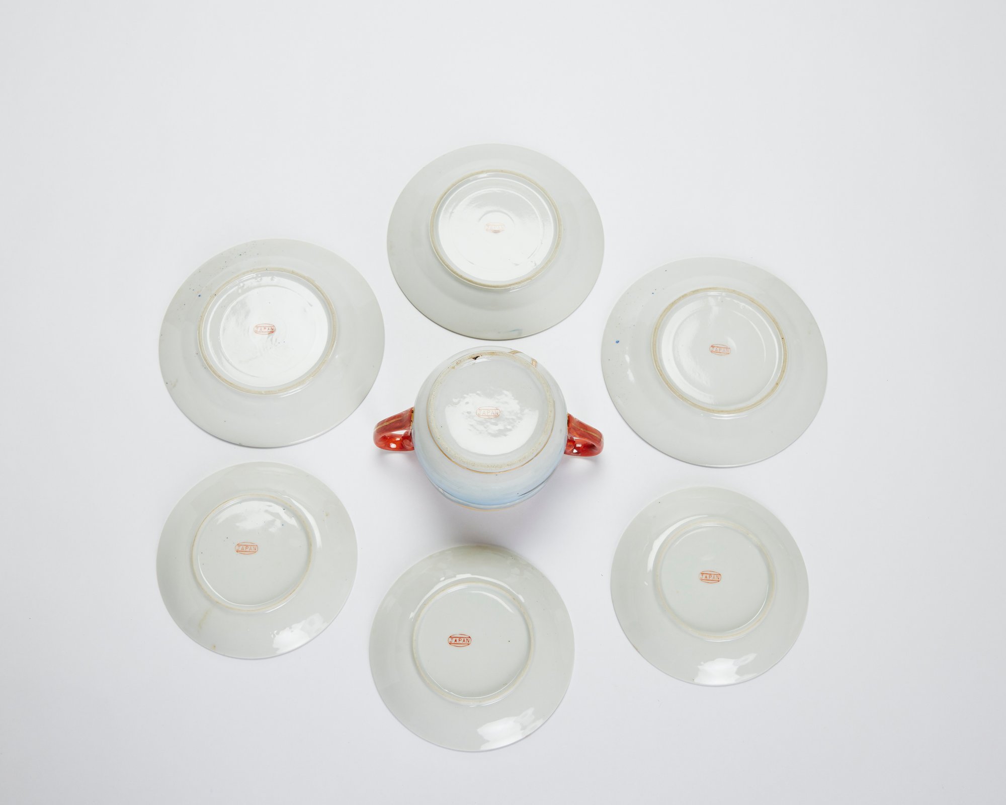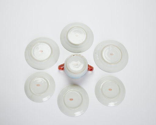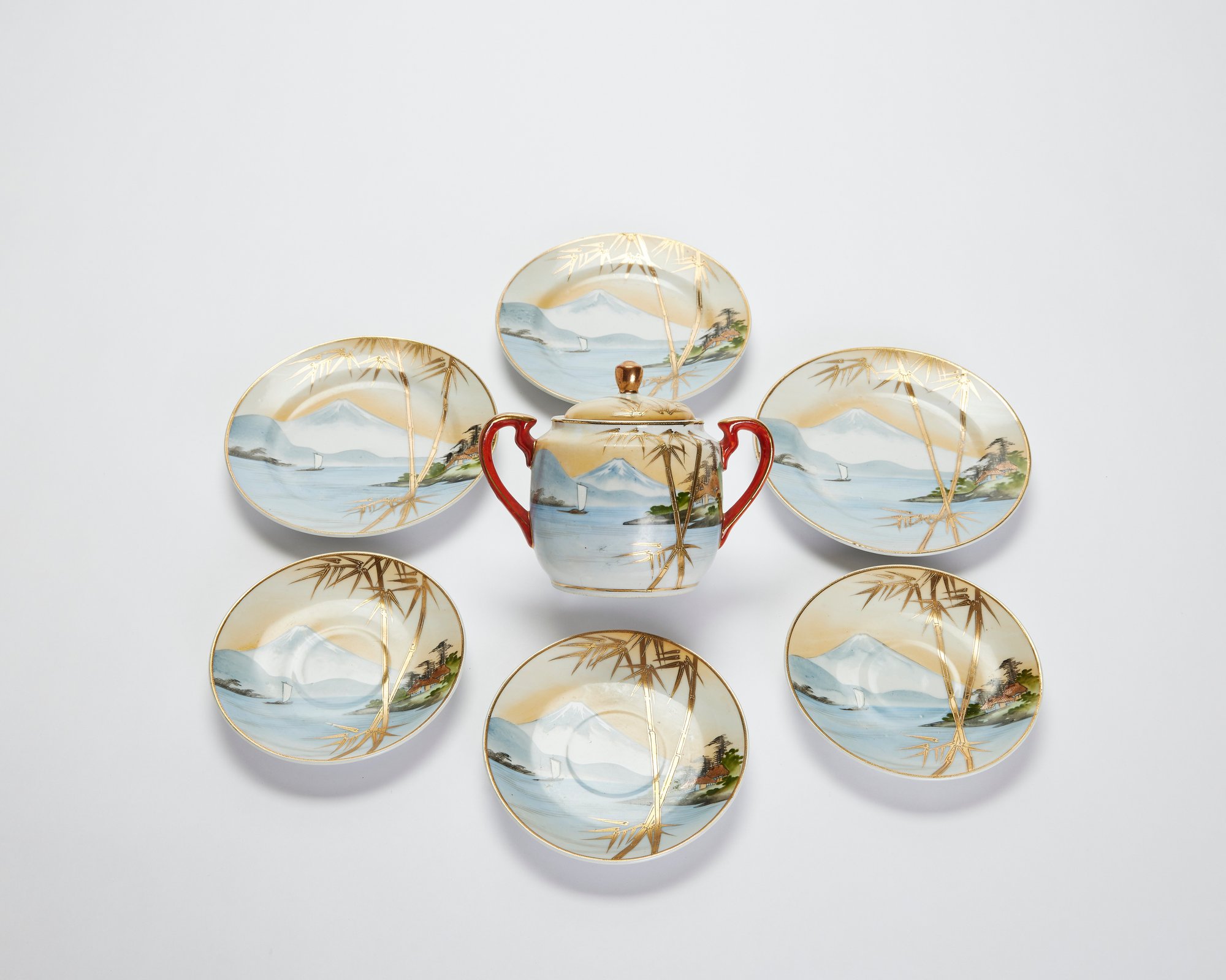 Sugar bowl, 3 dessert plates, 3 teacup saucers