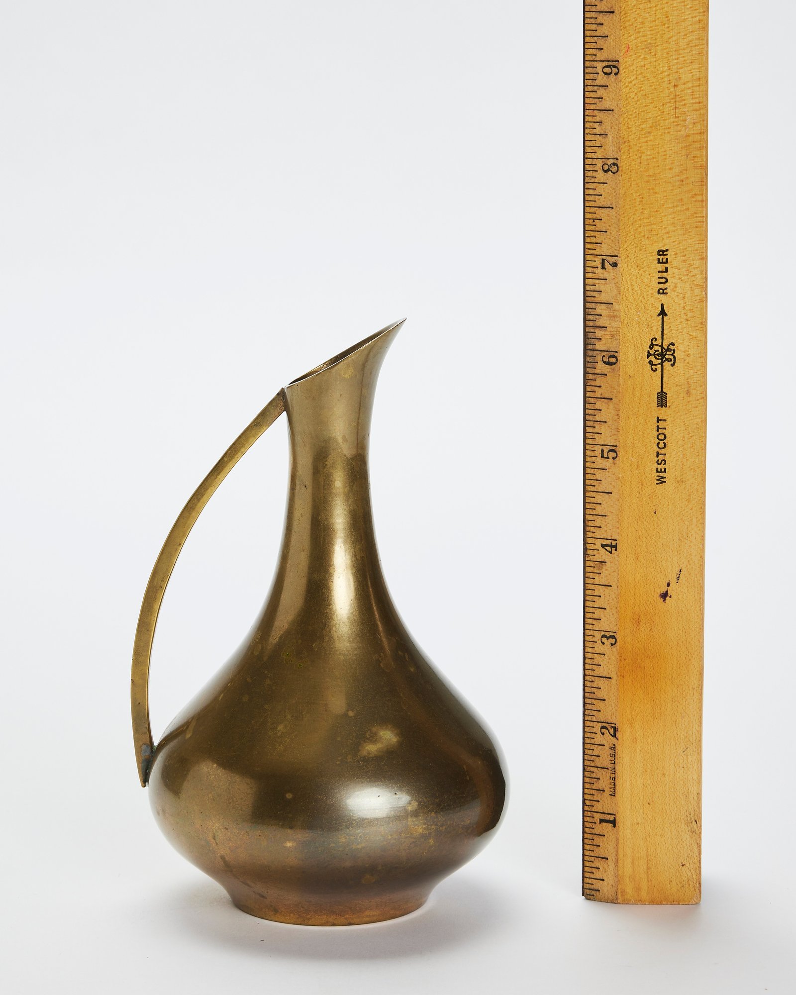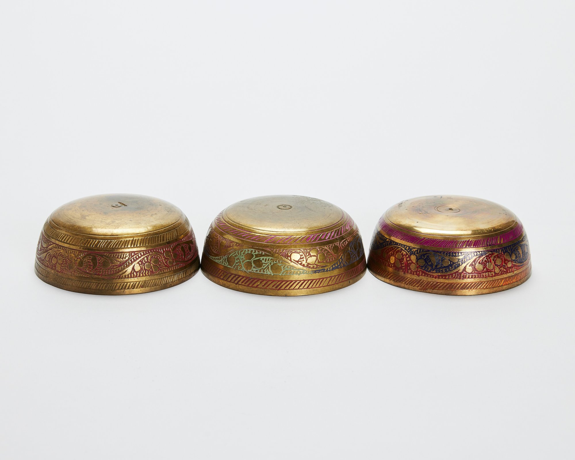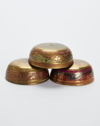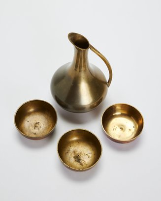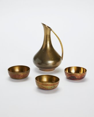 Mid-Century Brass Ewer Pitcher With 3 Enamel Inlaid Indian Bowls
