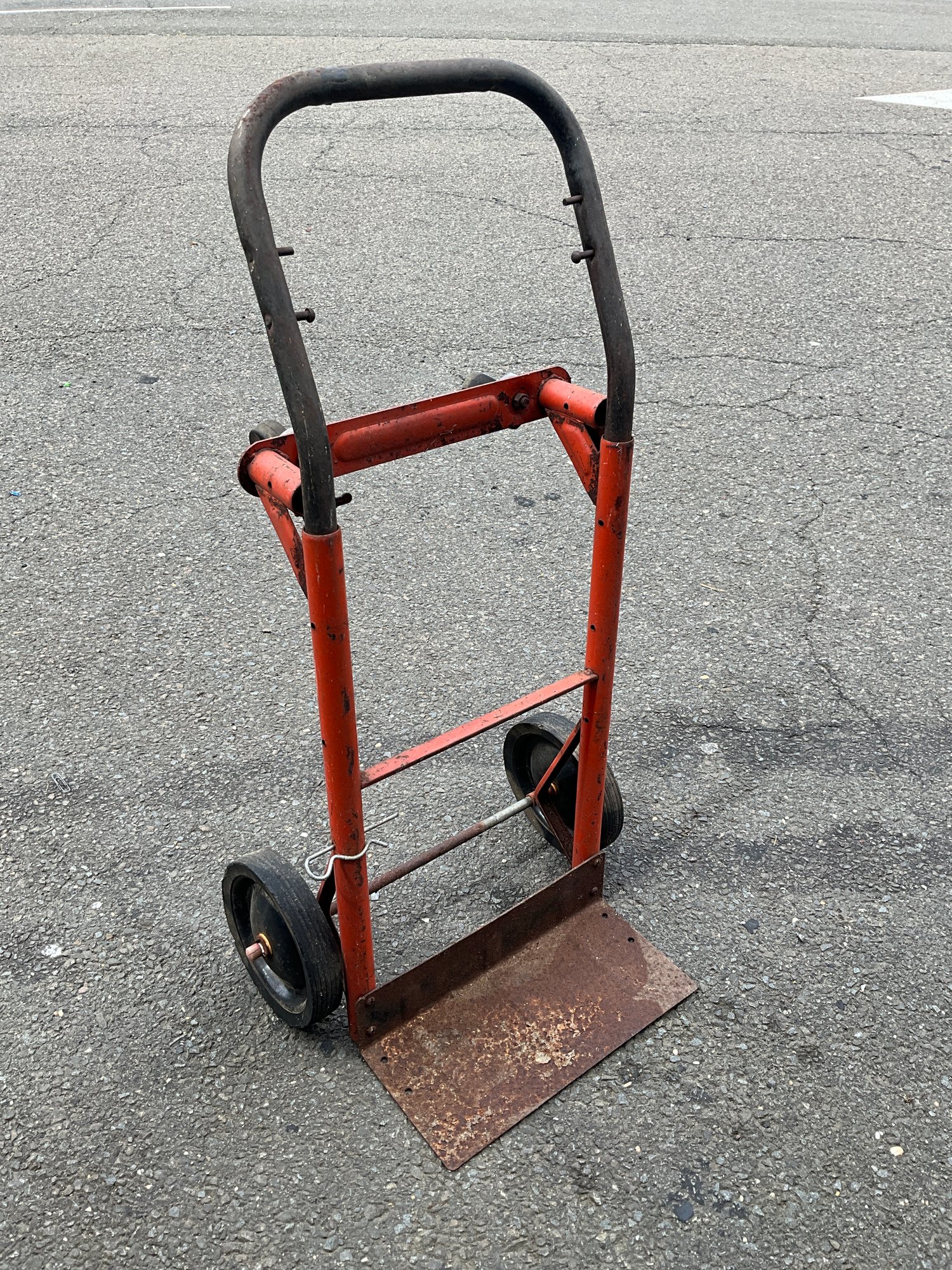 Hand truck with four wheels, black bar can be removed and inserted to use as a hand cart.