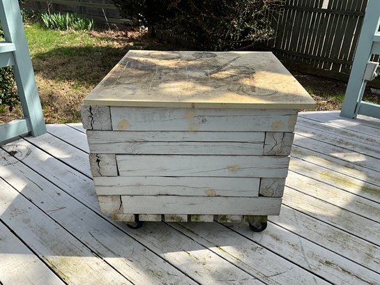 Solid wood outdoor storage bin with rope handles to sides. Bin is on wheels for easy mobility.