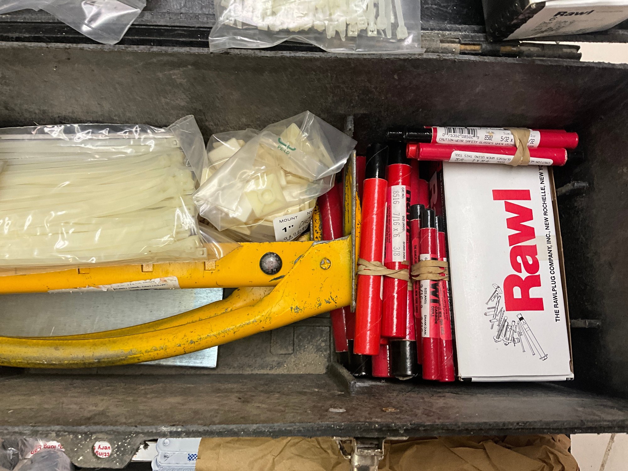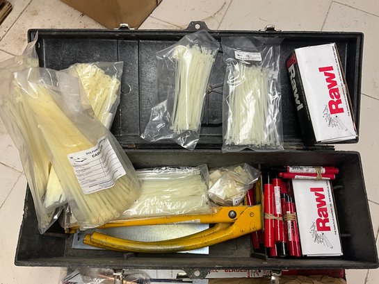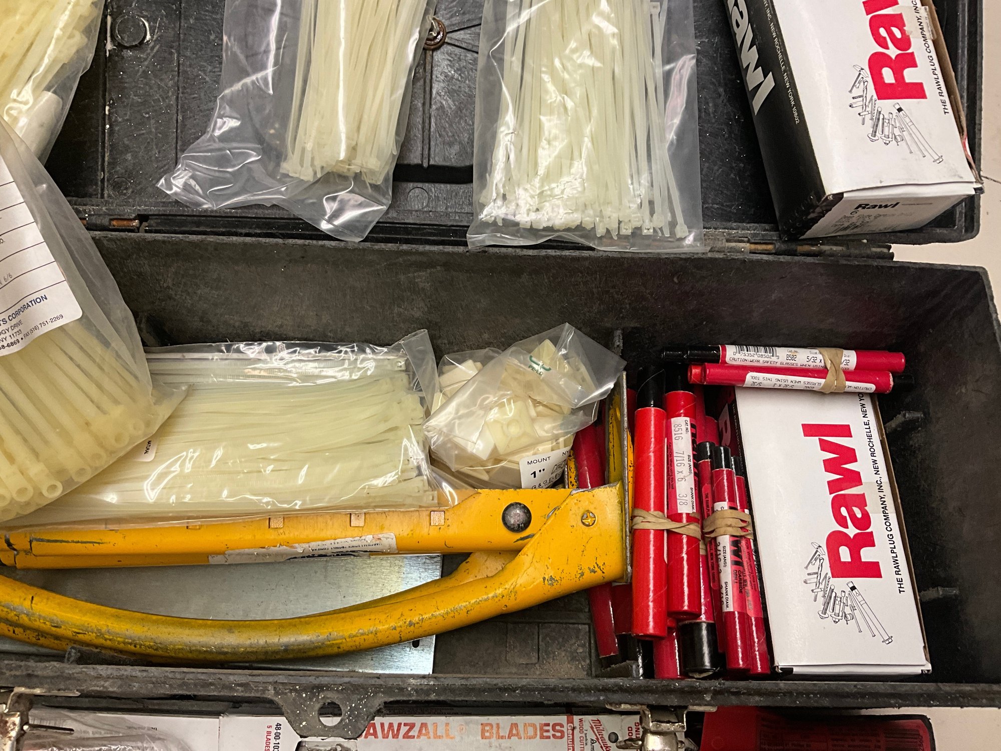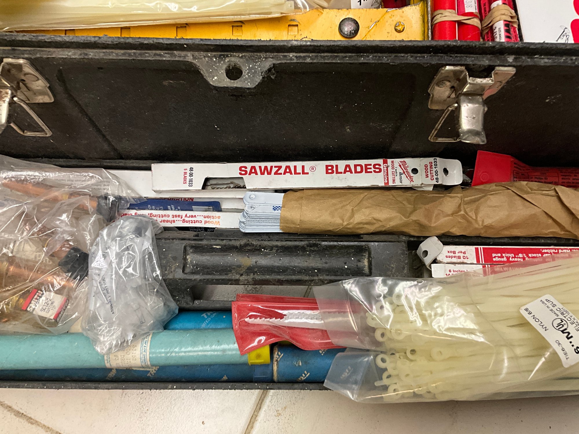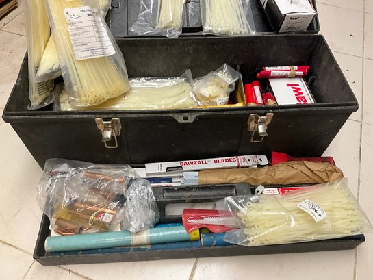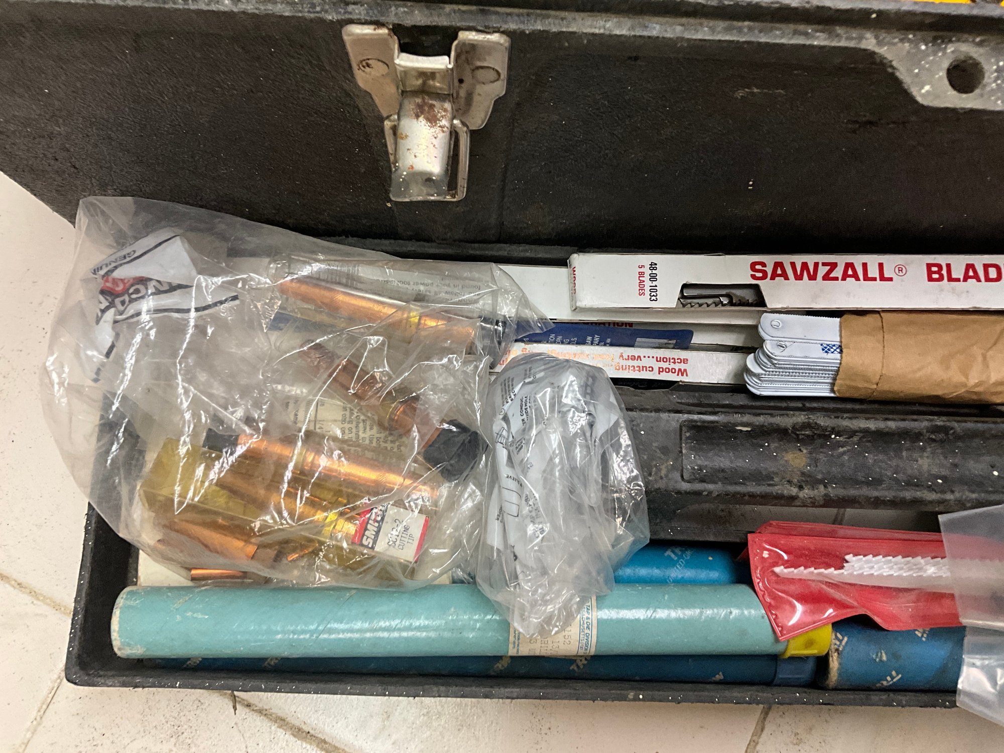 Including flip top toolbox and an assortment of hand tools and garage items within.