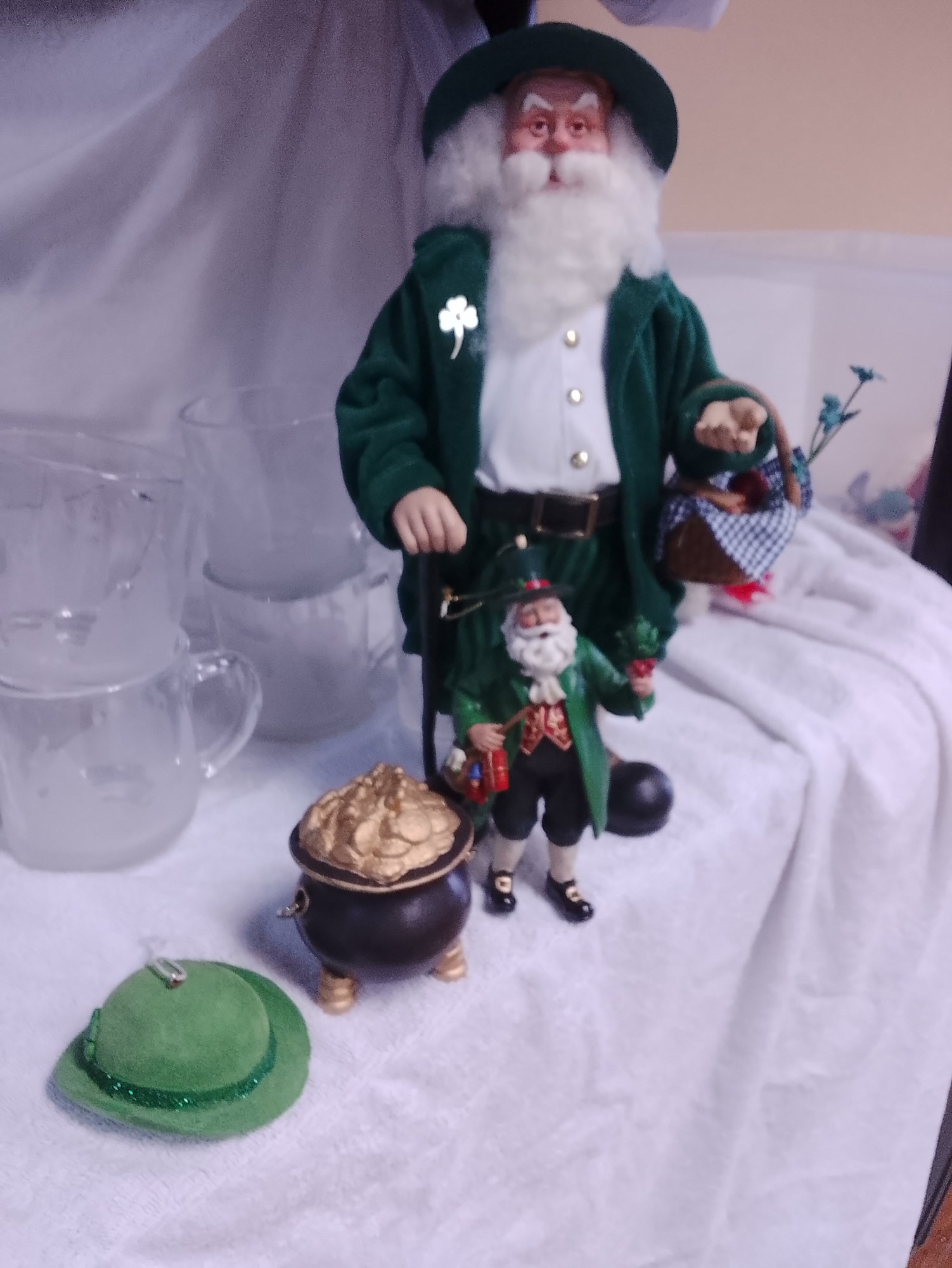 Beautiful detailed Irish Santa, accompanied by green velvet hat, pot of gold,smaller Irish Santa ornament