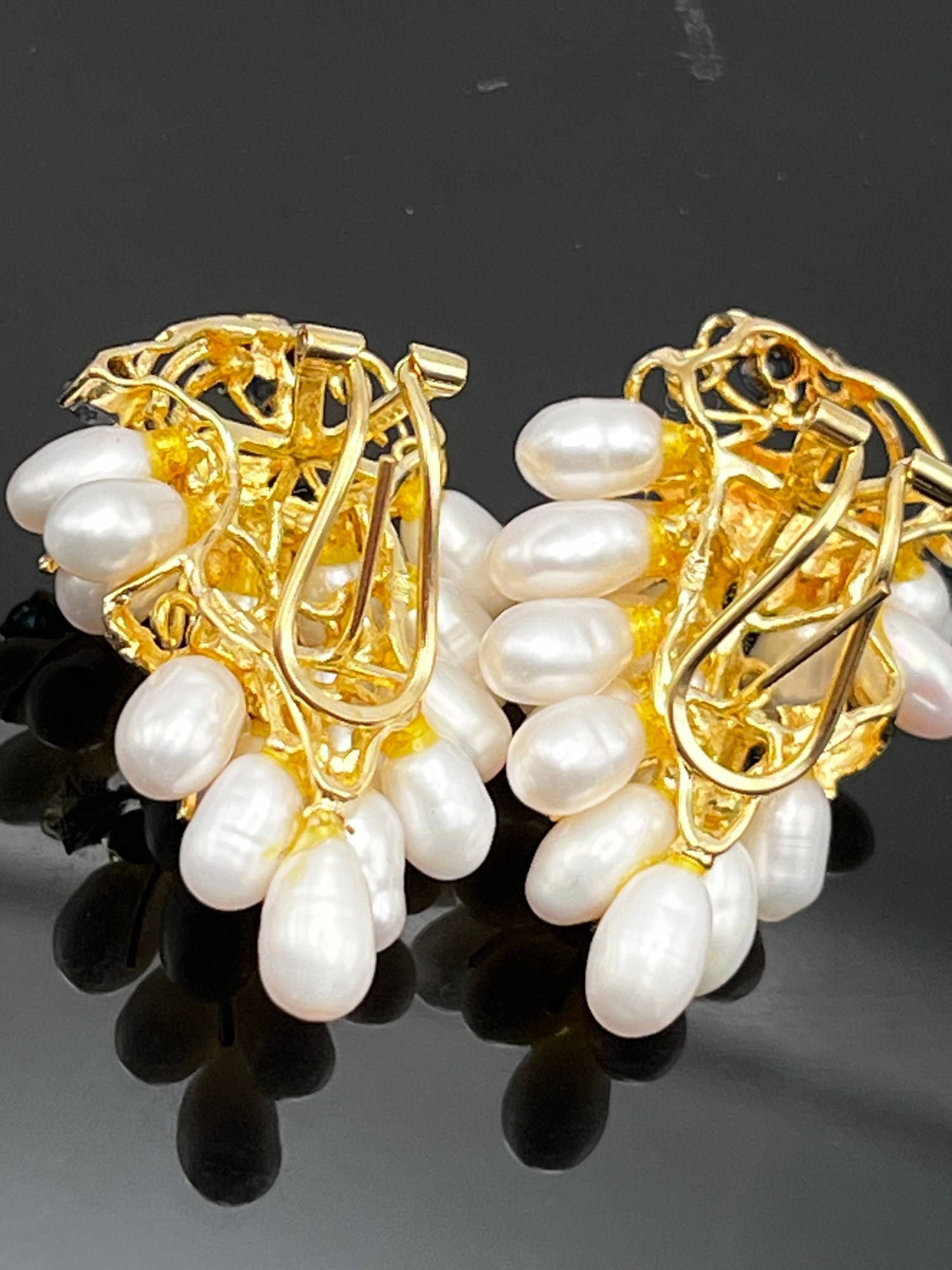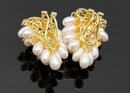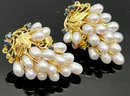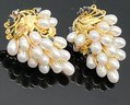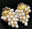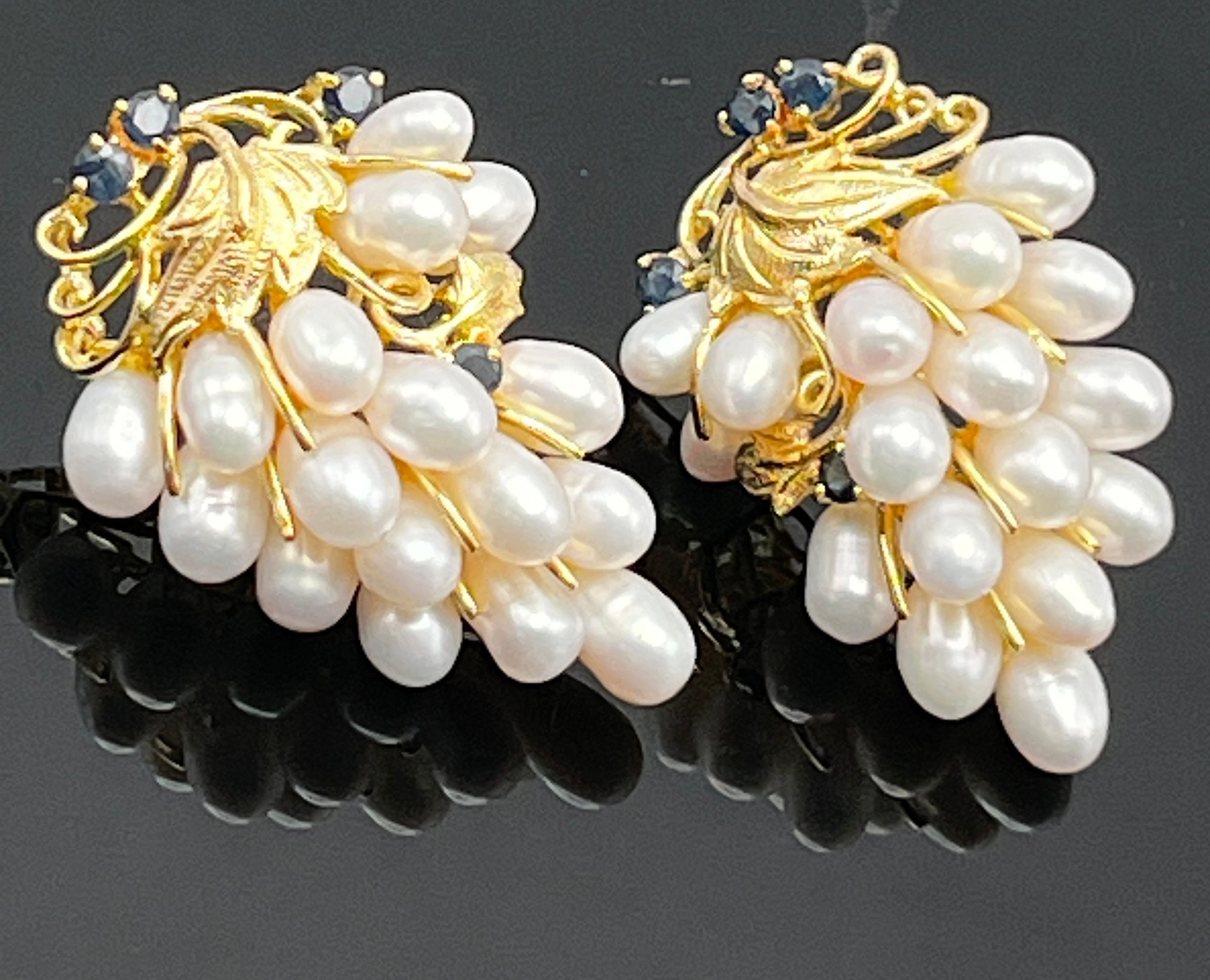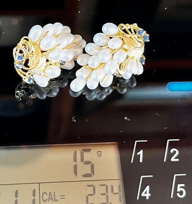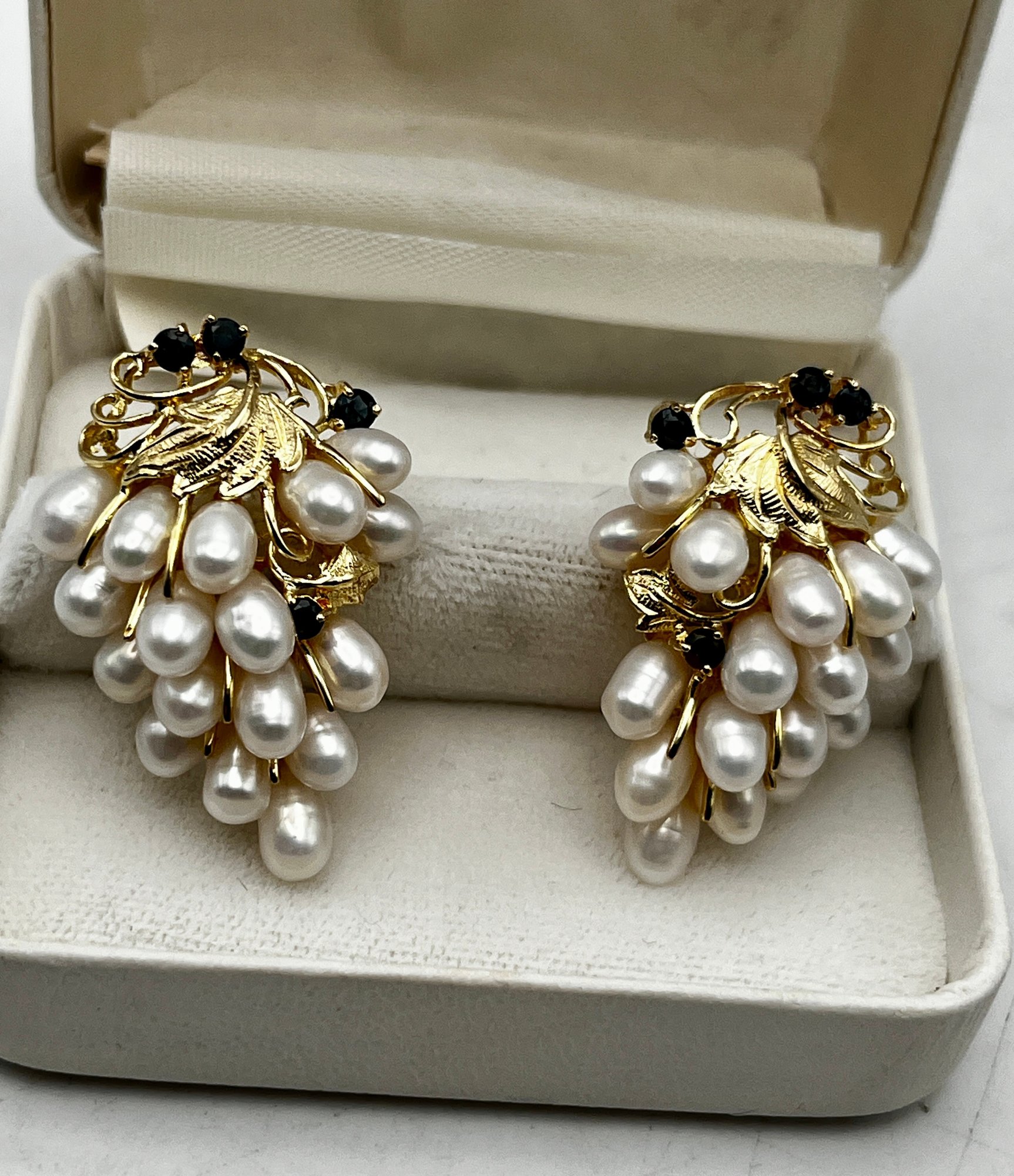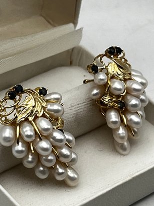 14k Yellow Gold Grape Cluster Pearl & Sapphires Pierced Earrings