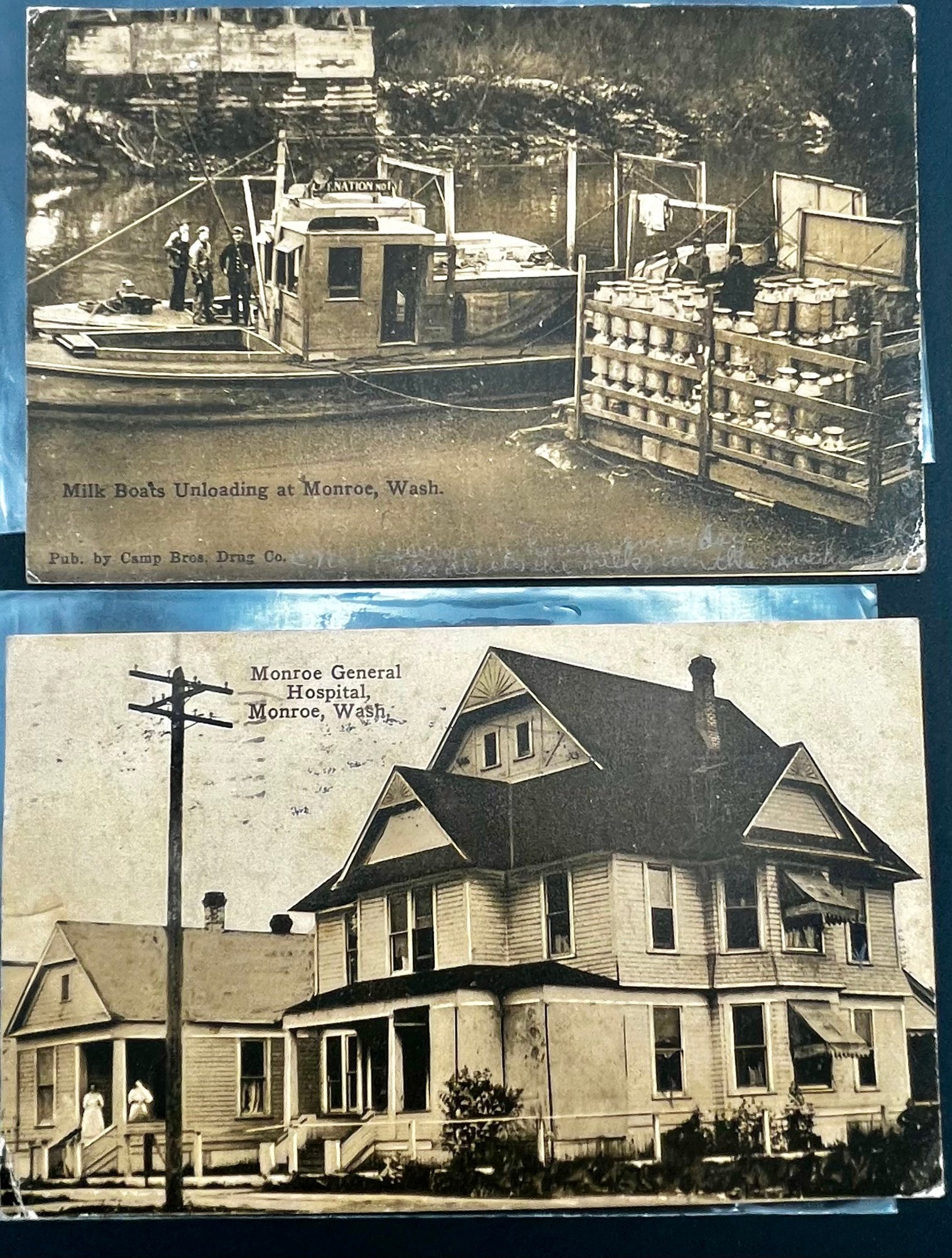 1910 & 1911 Monroe Washington Black & White Post Cards - old hospital on Main Street, carnation milk boats delivery