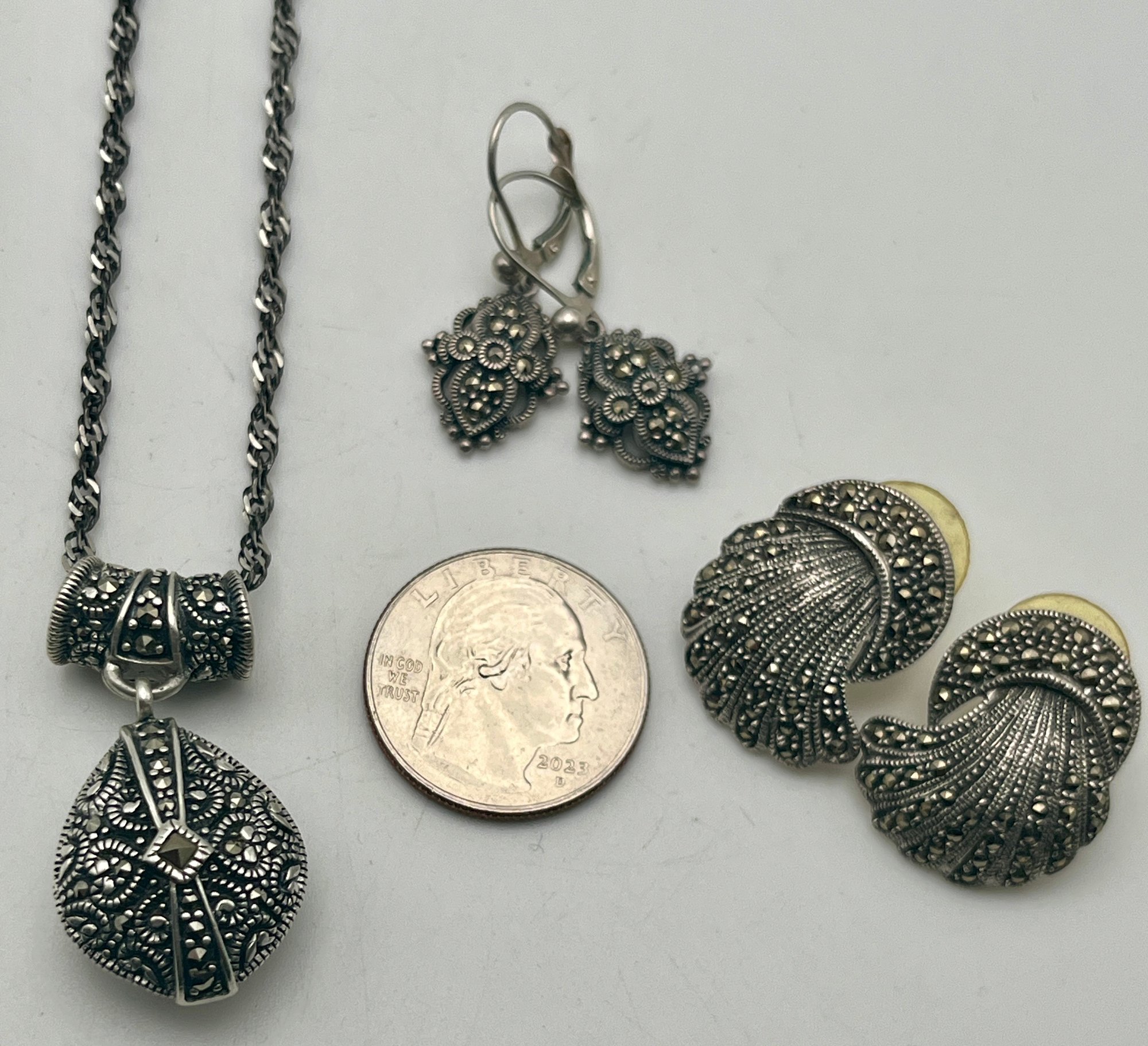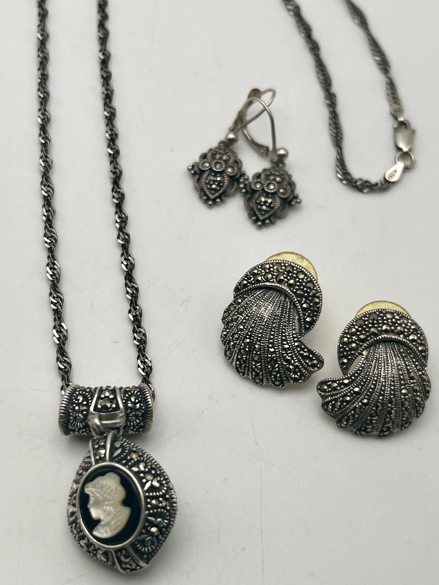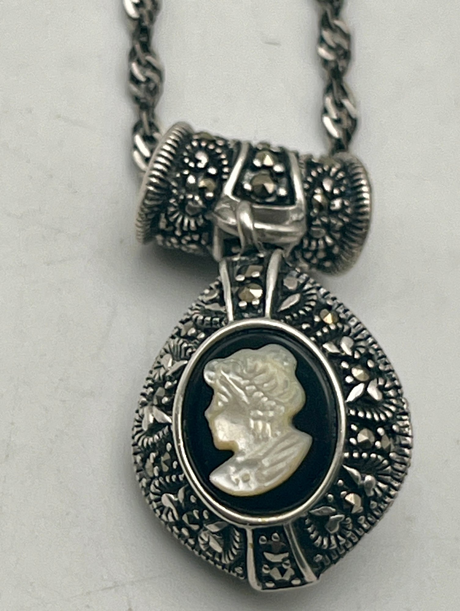 925/Sterling Marcasite Cameo Necklace & Marcasite Earrings