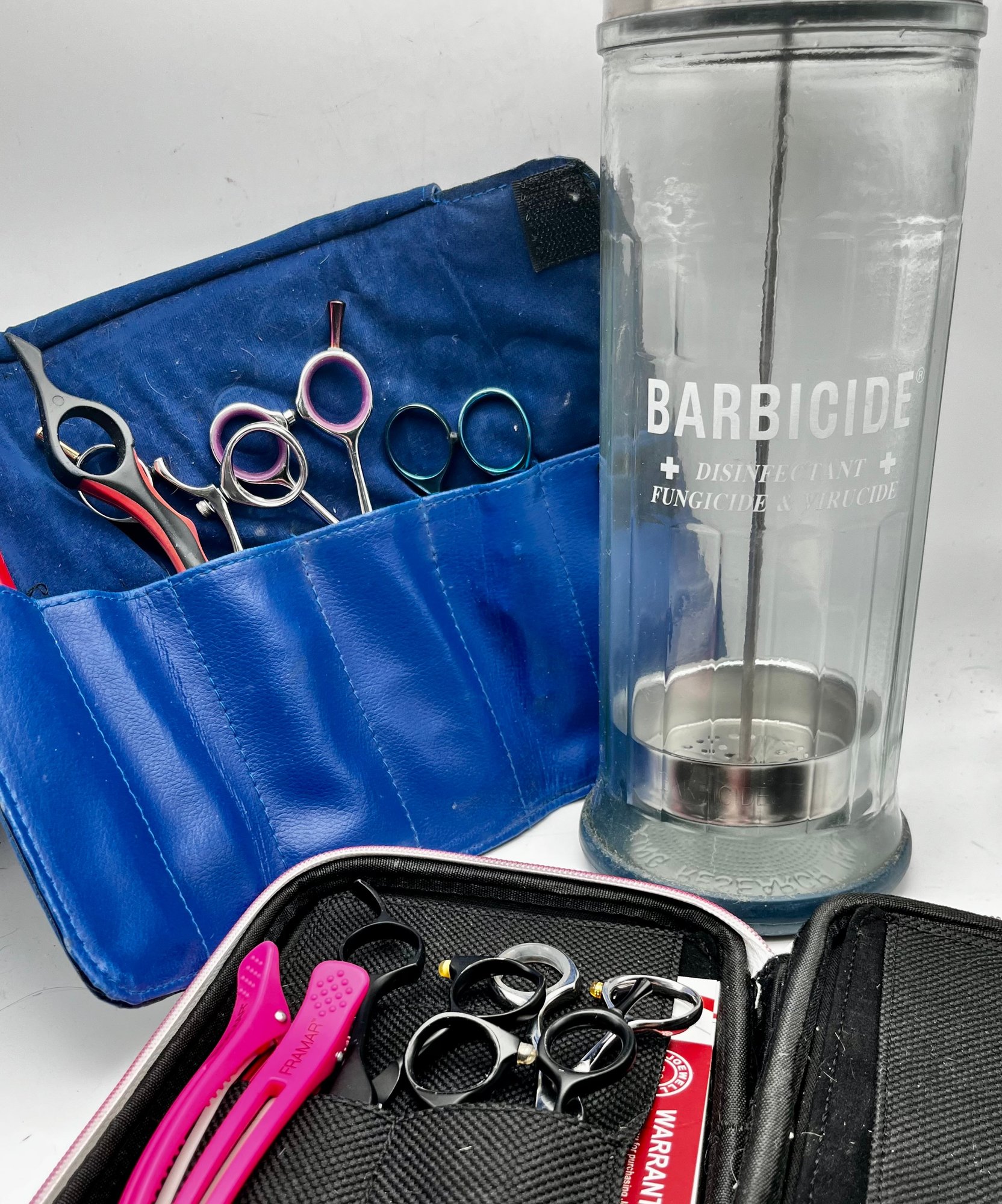 Barbicide Glass Container And Professional Barbering/ Beauty Hair Shears