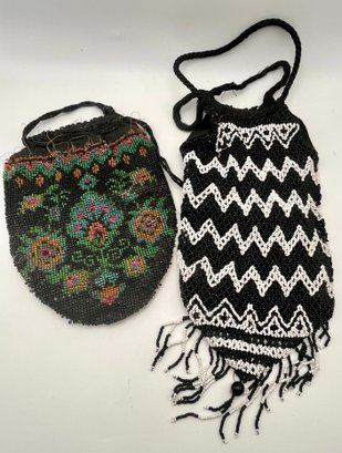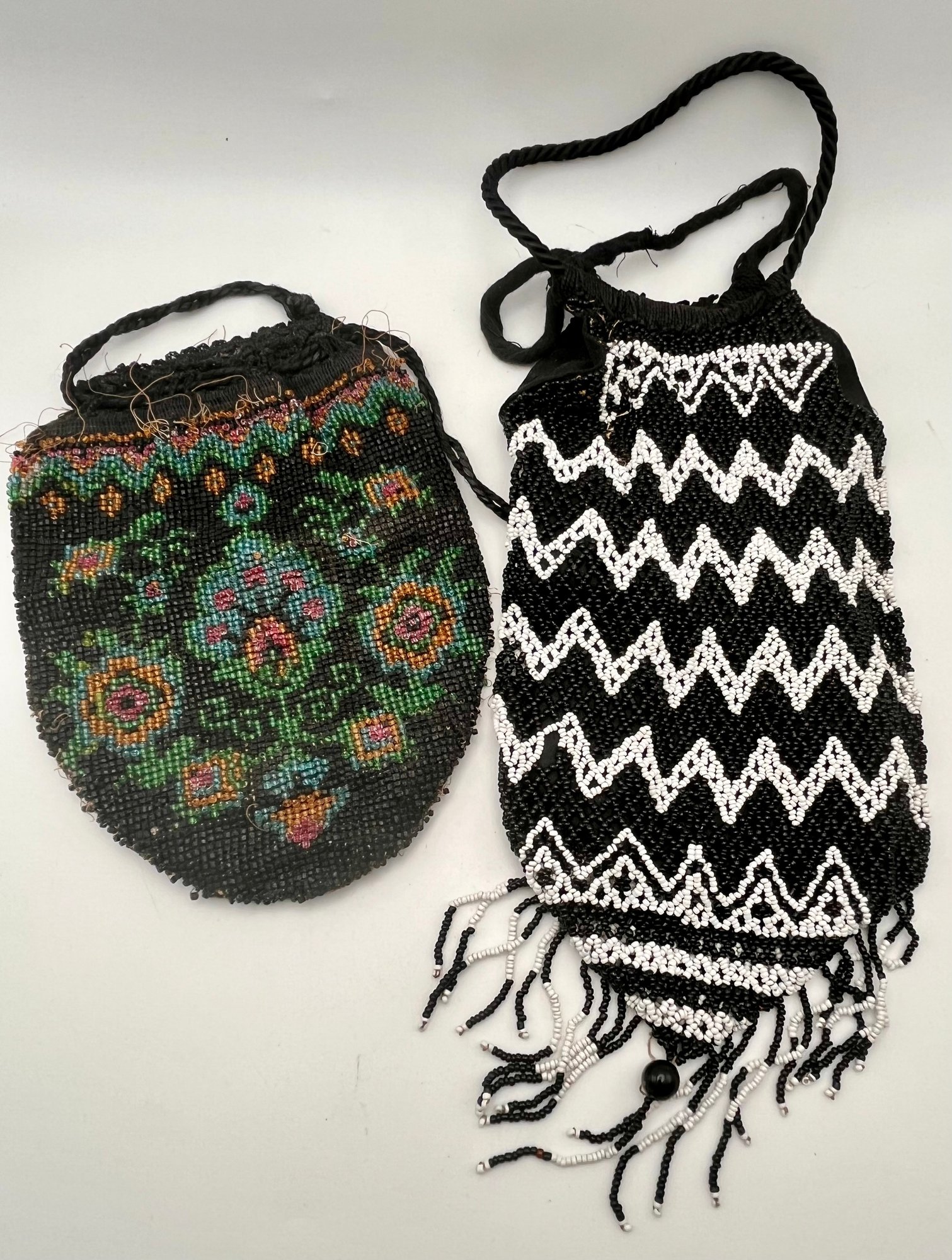The black and white beaded purse has extra beads and one of the fringe dangle pieces