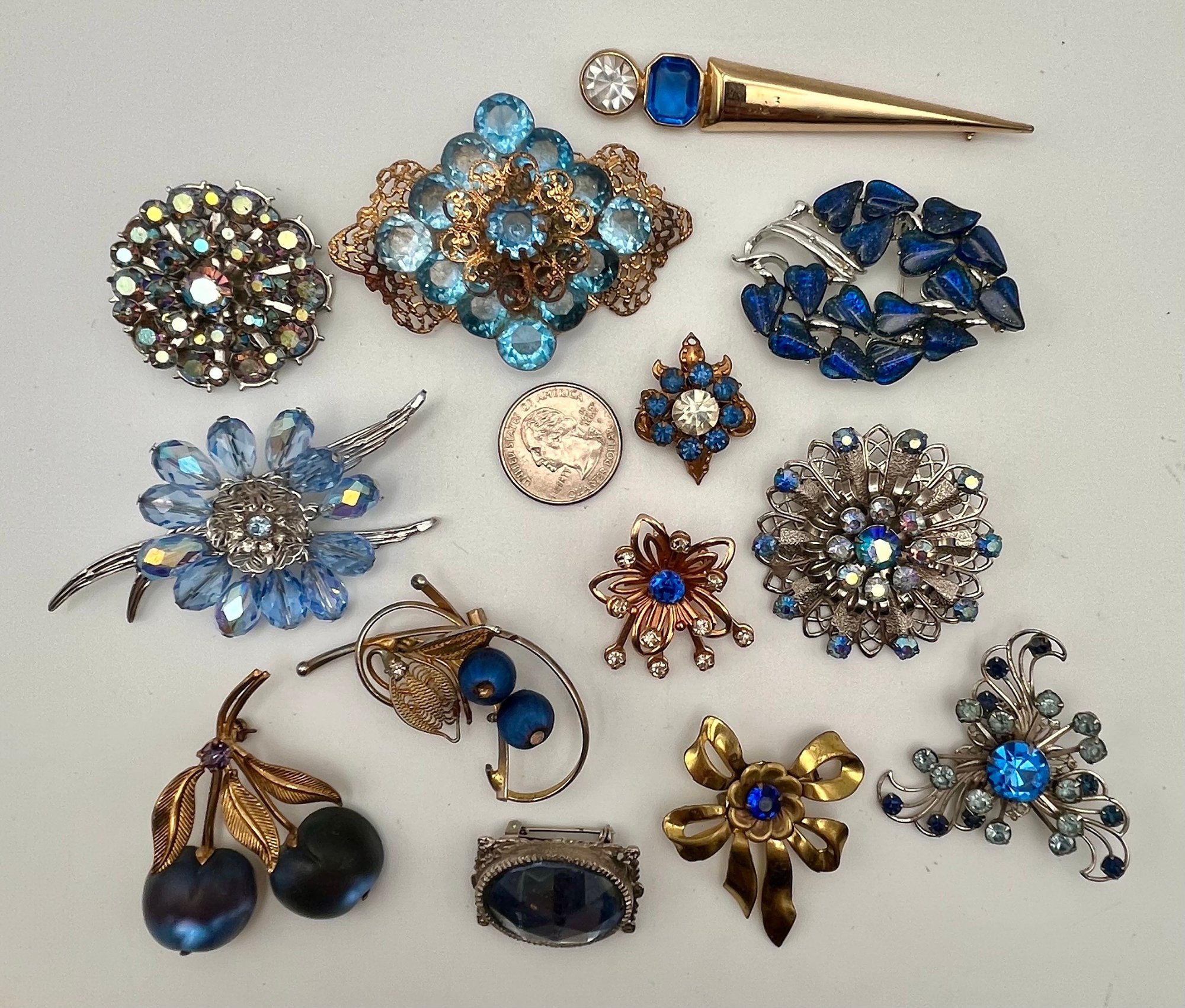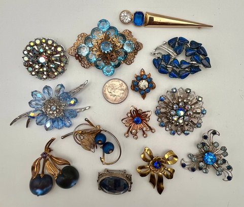 Blues pin lot of 13 includes mis gold tone and silver tone - an crystal, glass, rhinestone