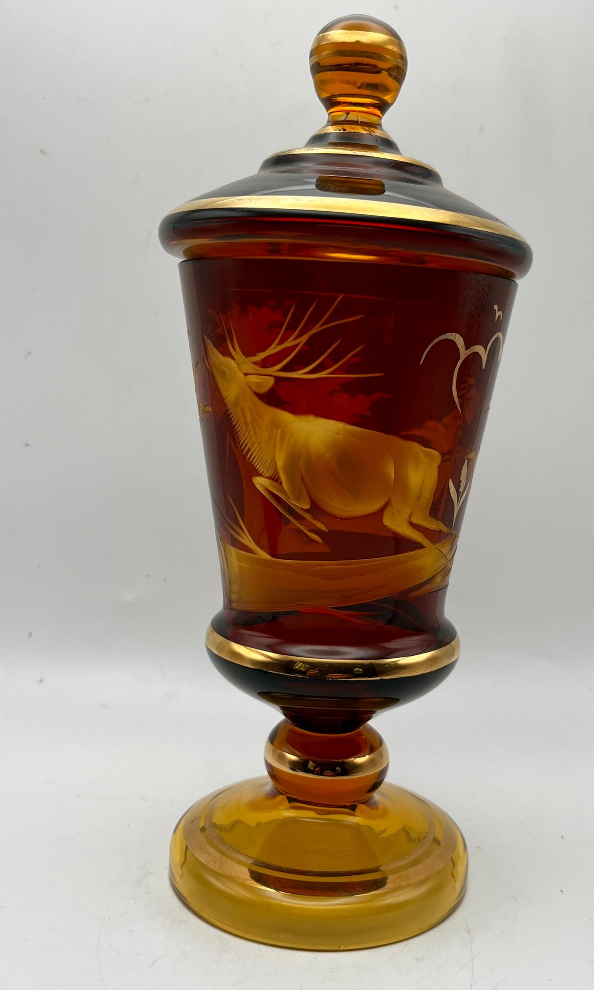 Bohemian Art Glass Pokal With Lid Amber Ruby Glass