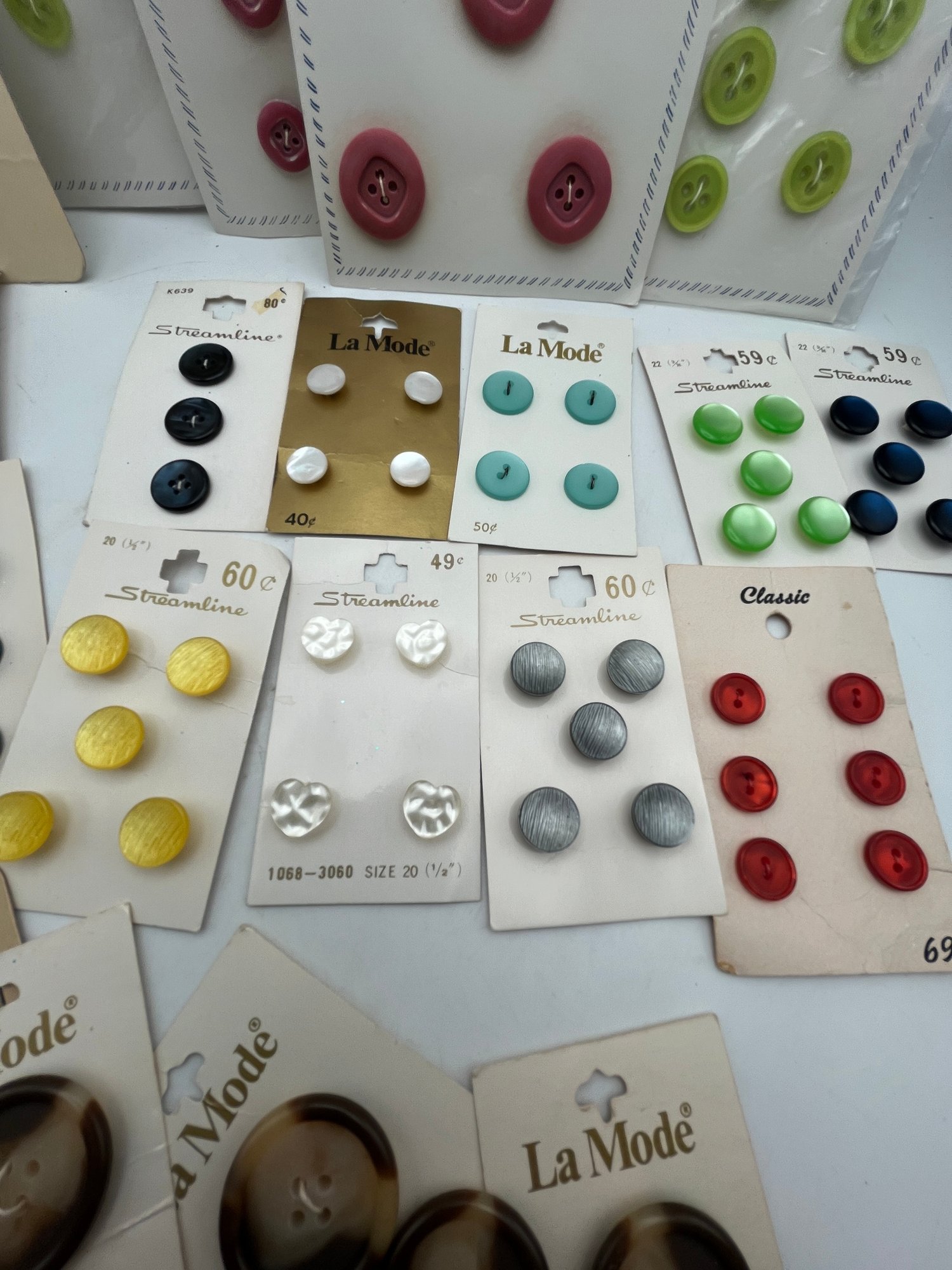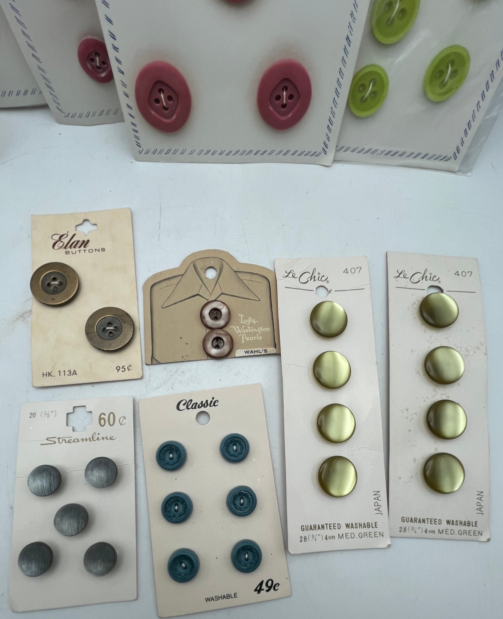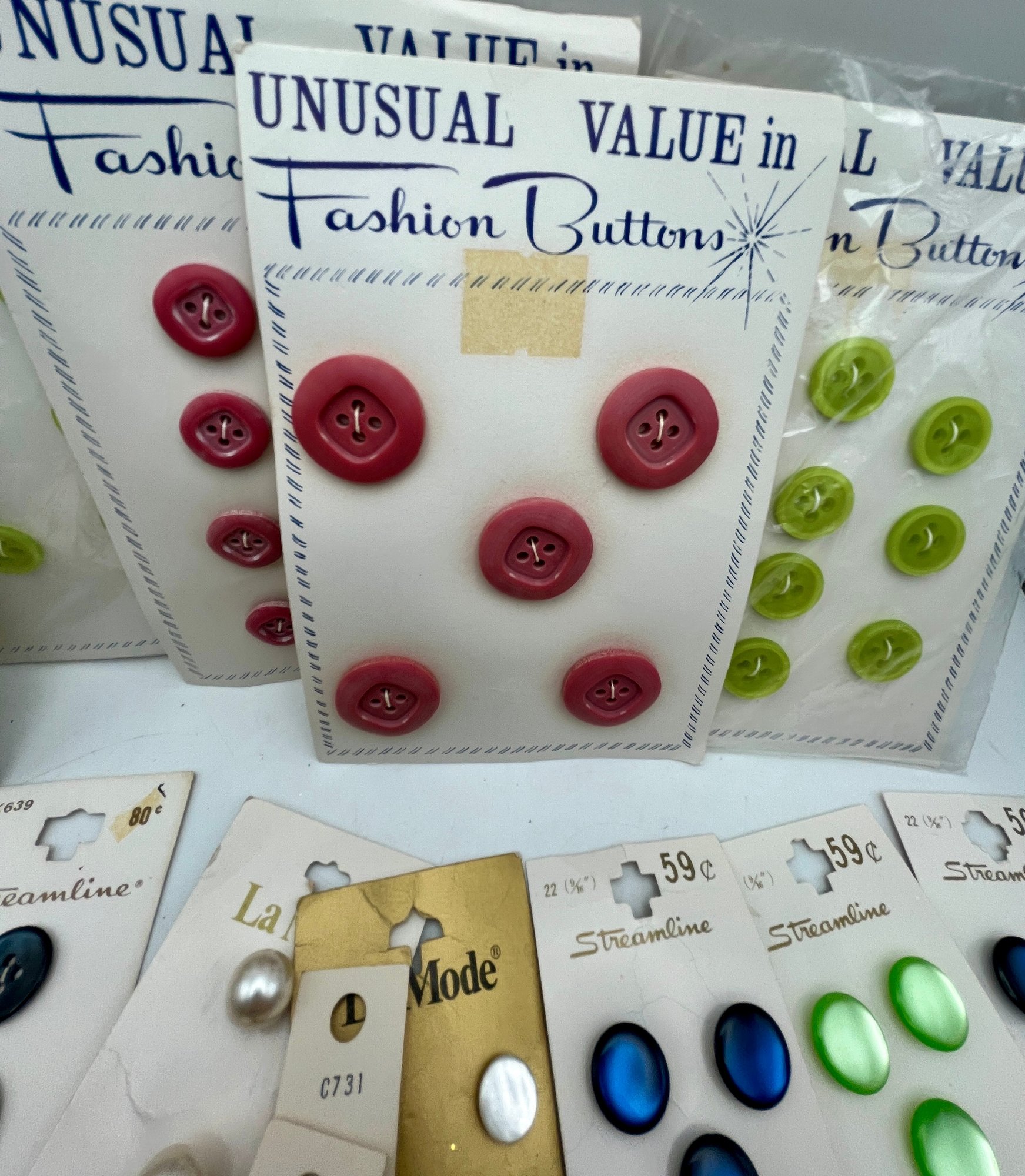 Decorative paper covered cigar Box full of Carded Buttons Vintage