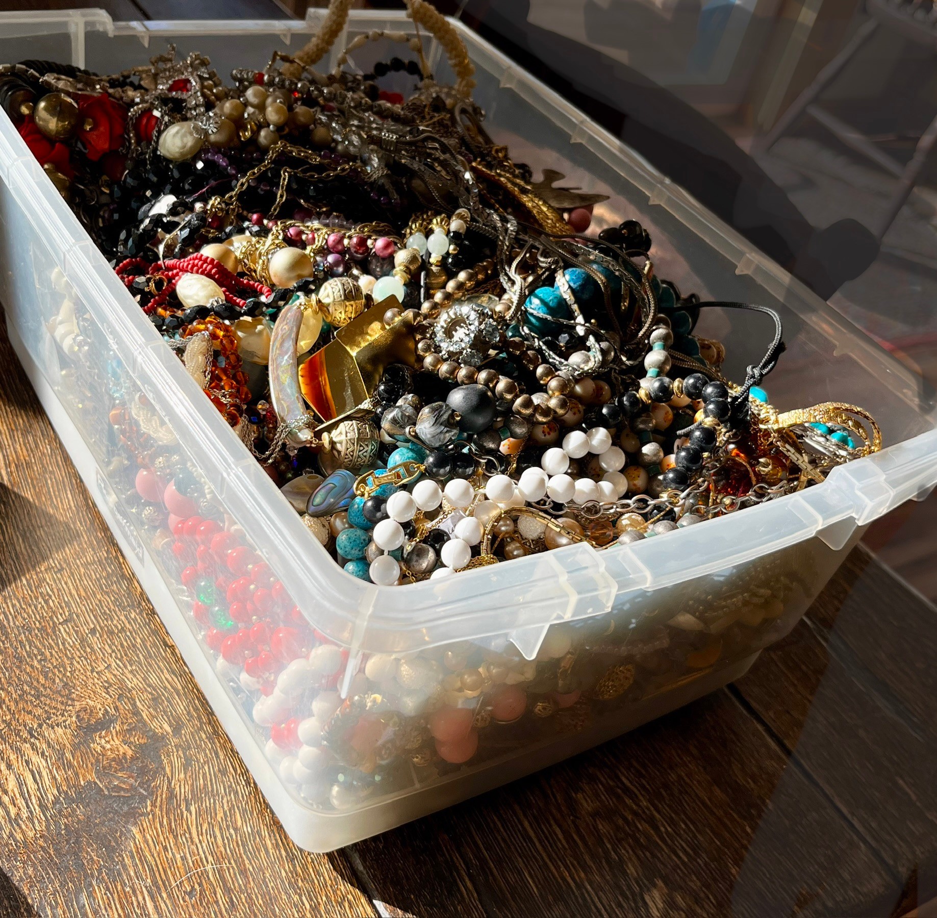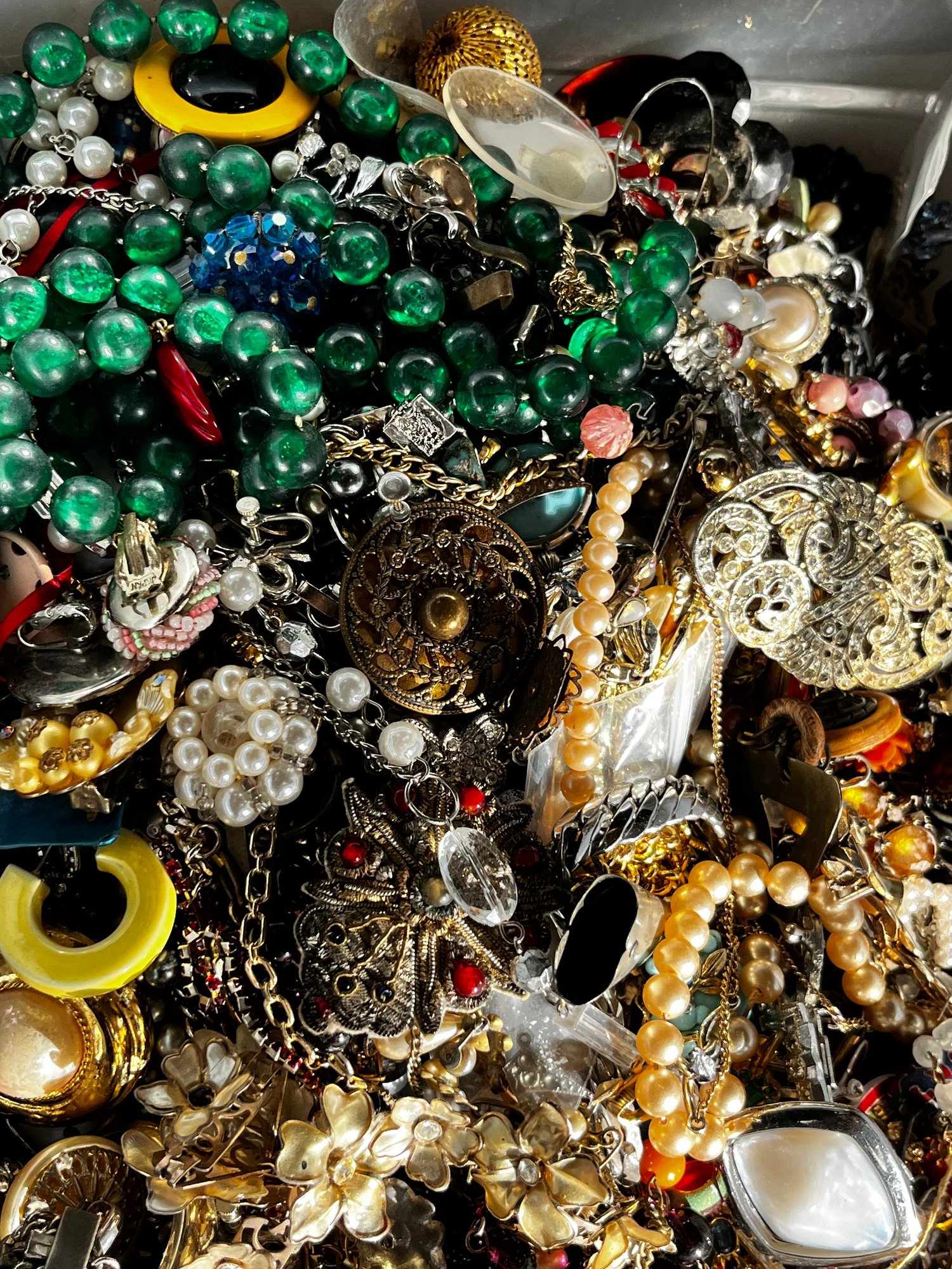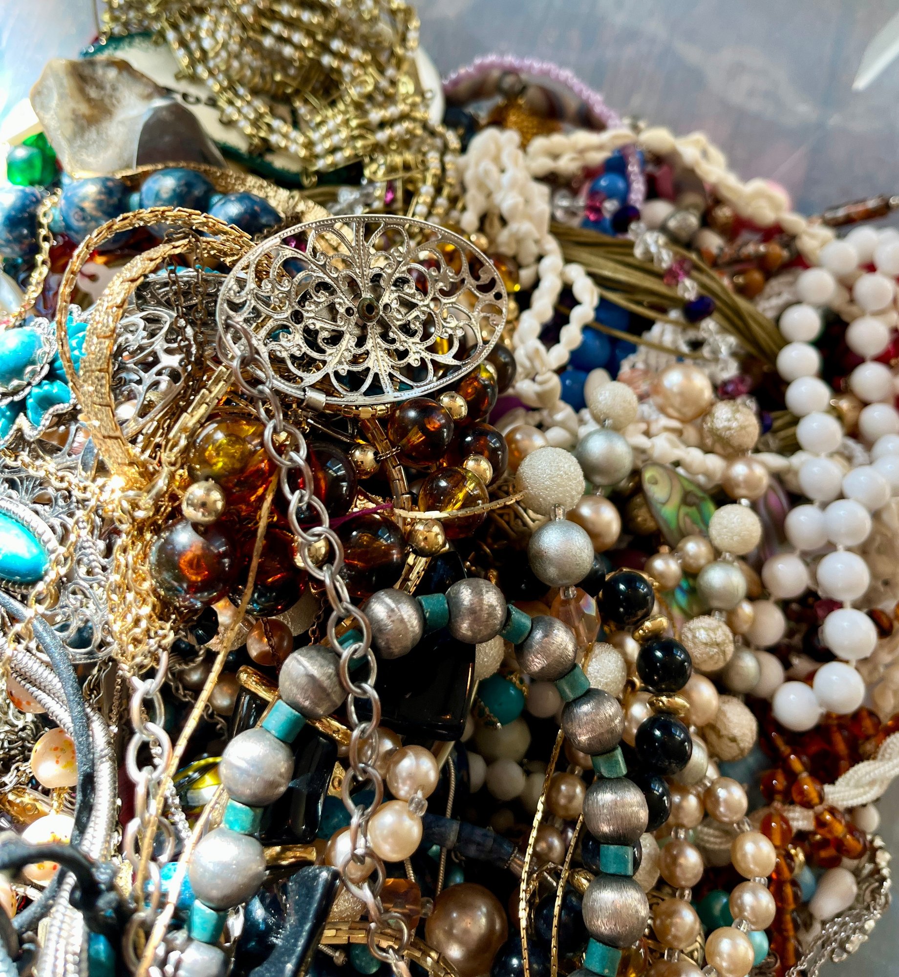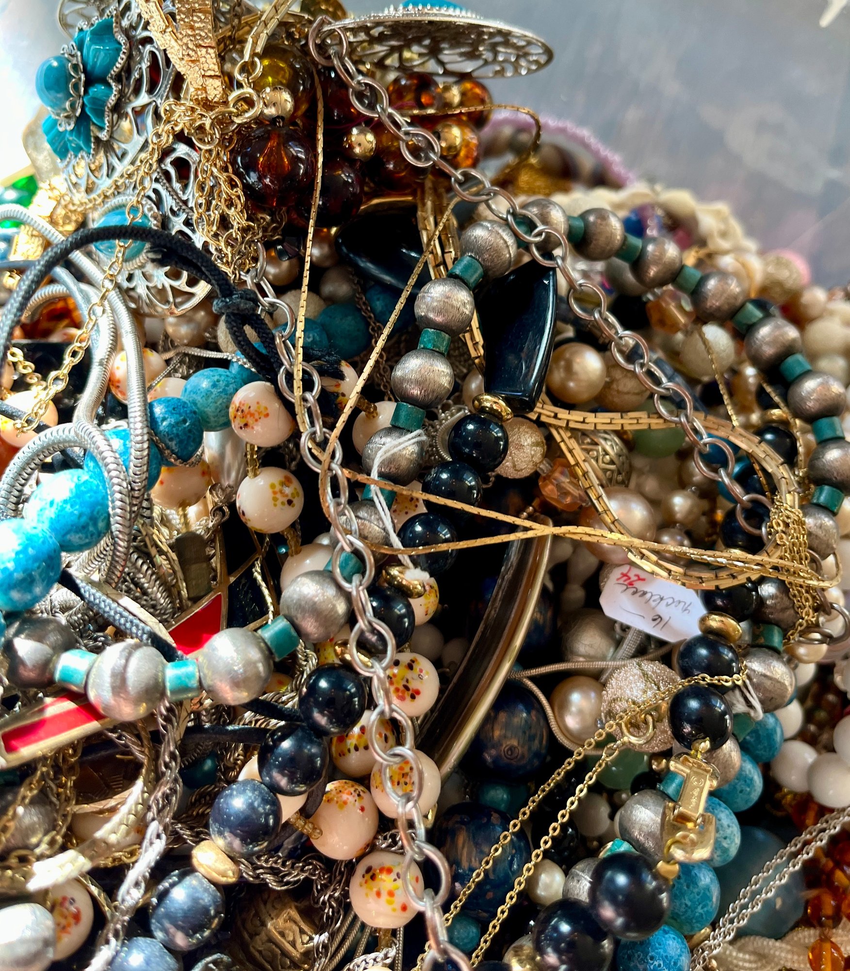 There is a mix of vintage with lots of wearable pieces. Many tangles necklaces, earrings and more in a 15qt tote.
