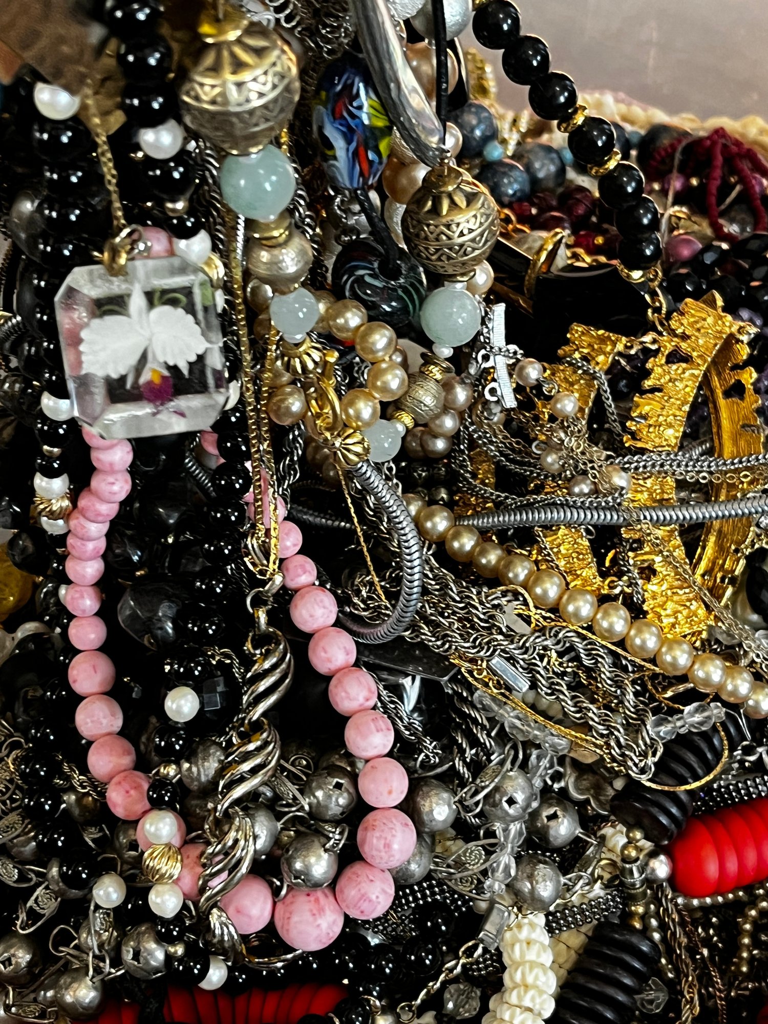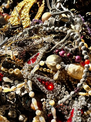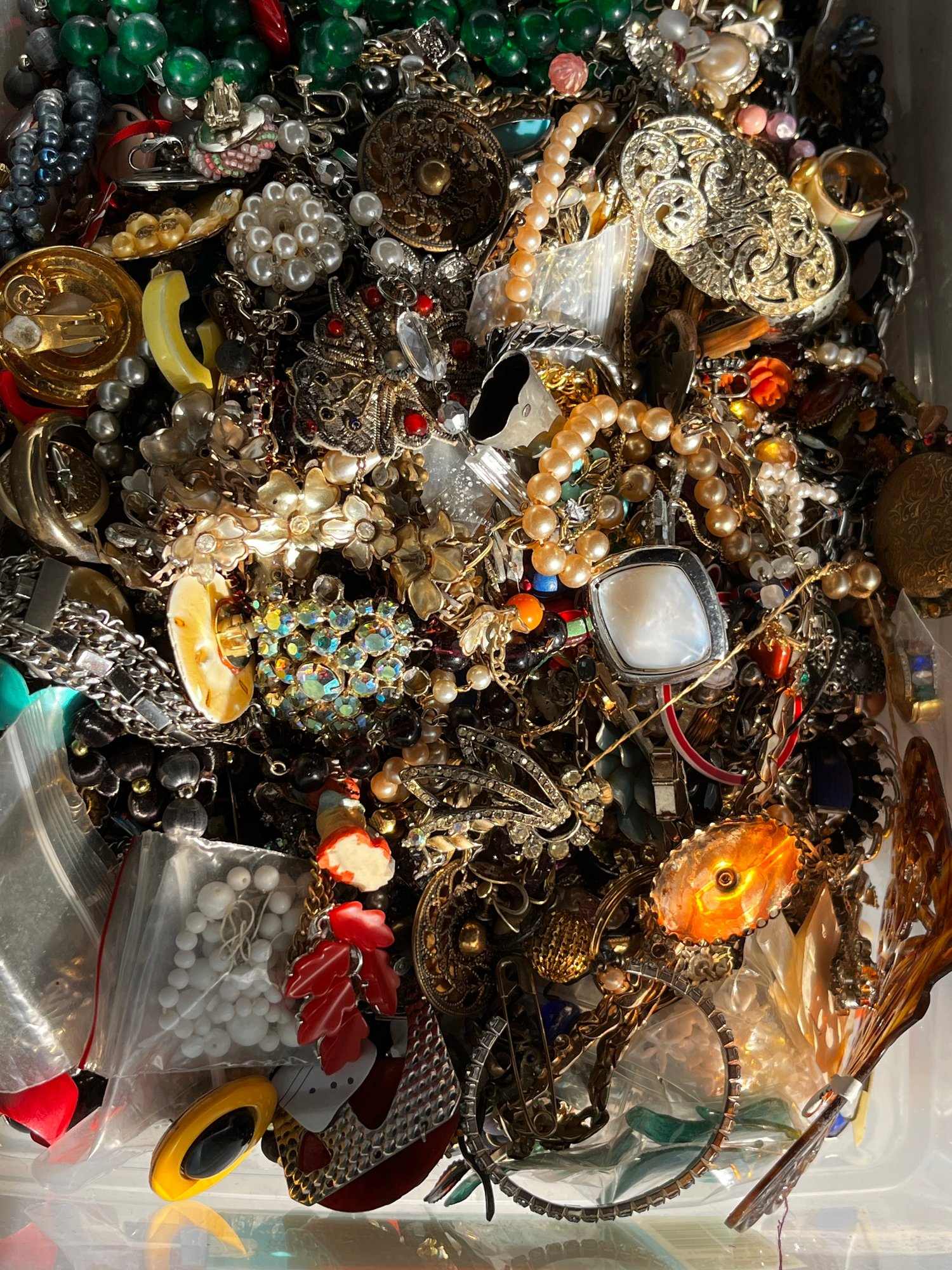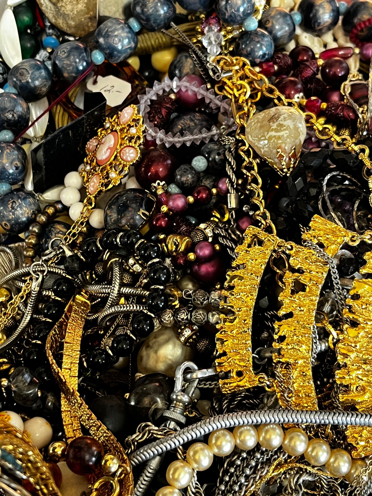 There is a mix of vintage with lots of wearable pieces. Many tangles necklaces, earrings and more in a 15qt tote.