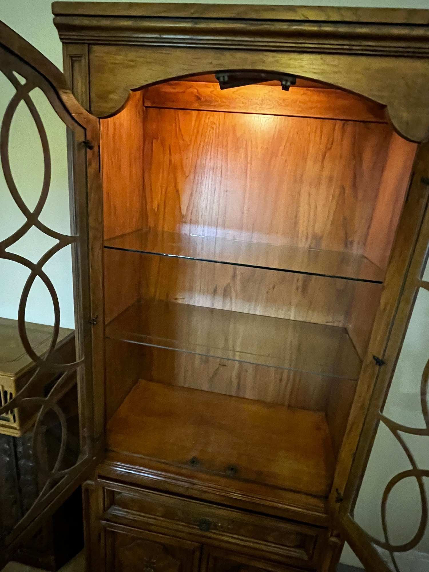 2 adjustable glass shelves, top lighting, one drawer, two door base cab