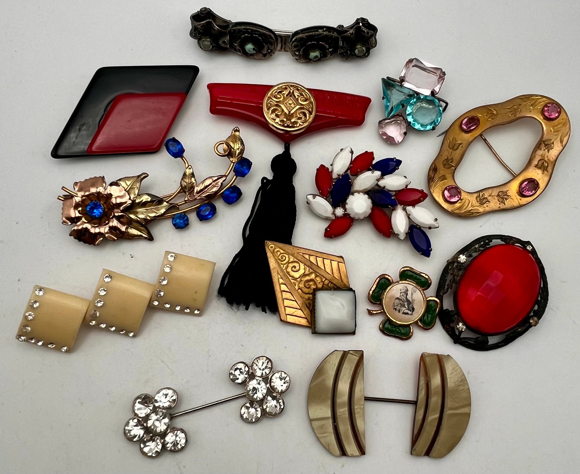 Mix Vintage & Antique Pin Lot- Bakelite,Celluloid, one markedSterling and other as shown