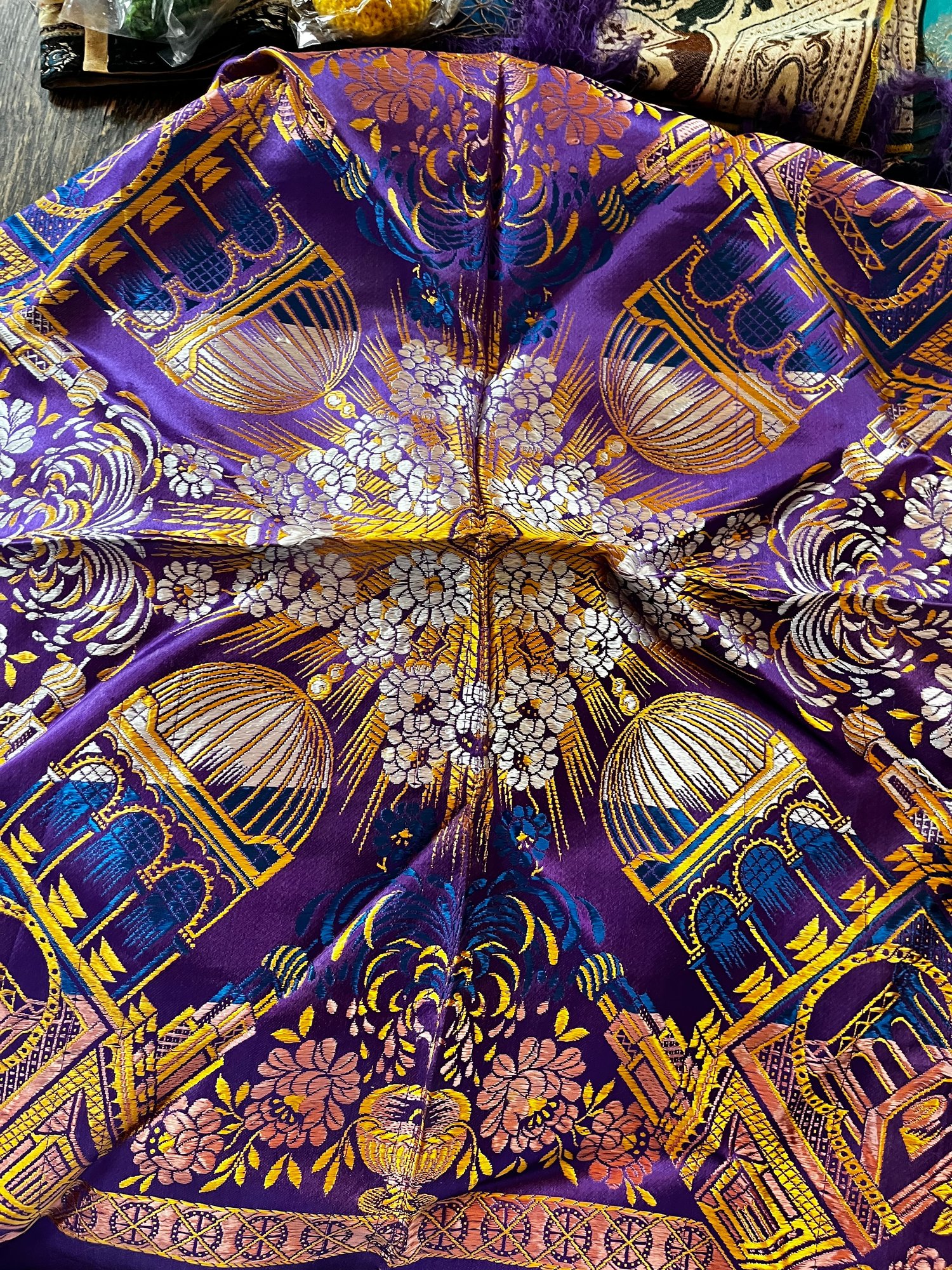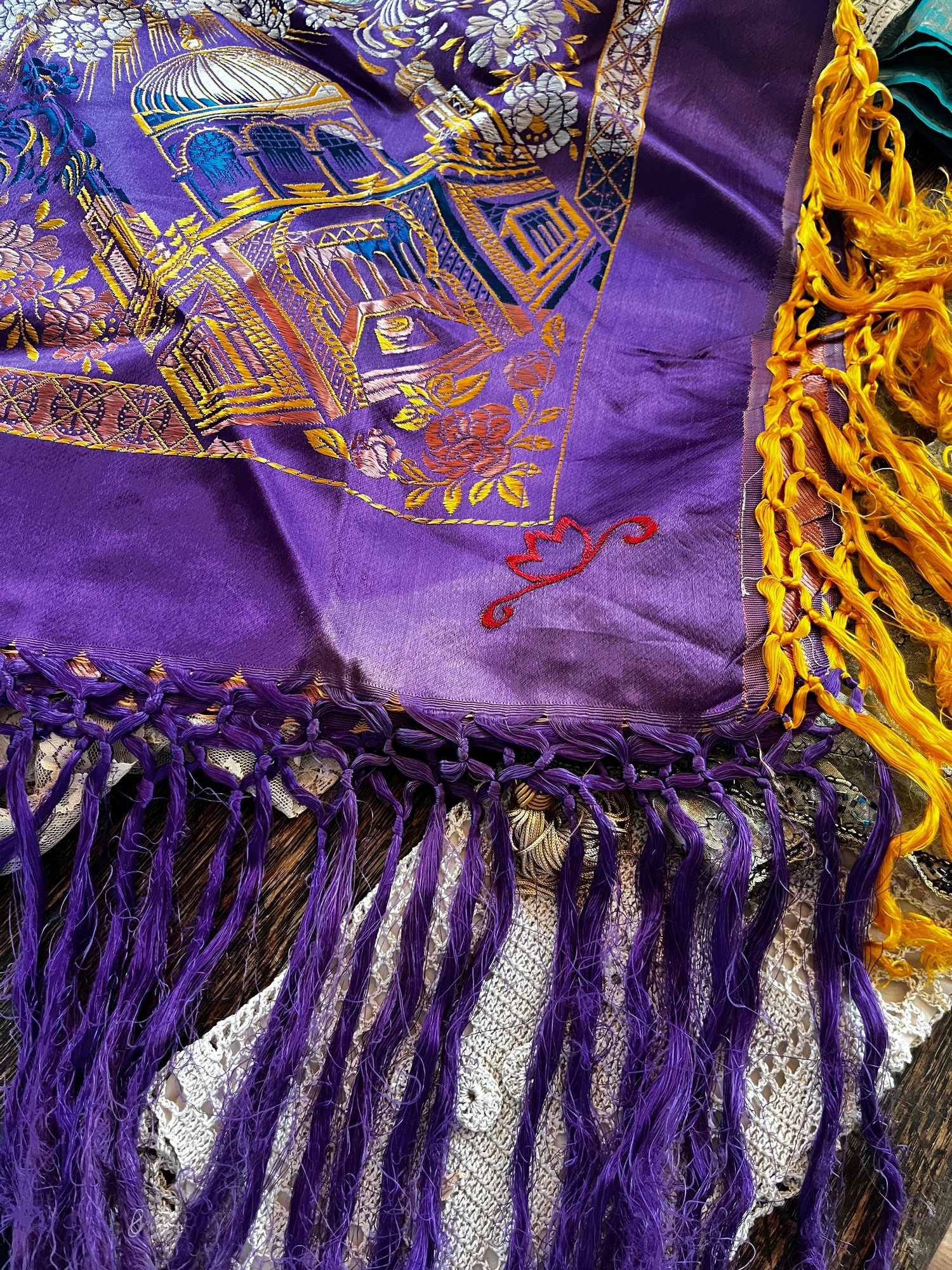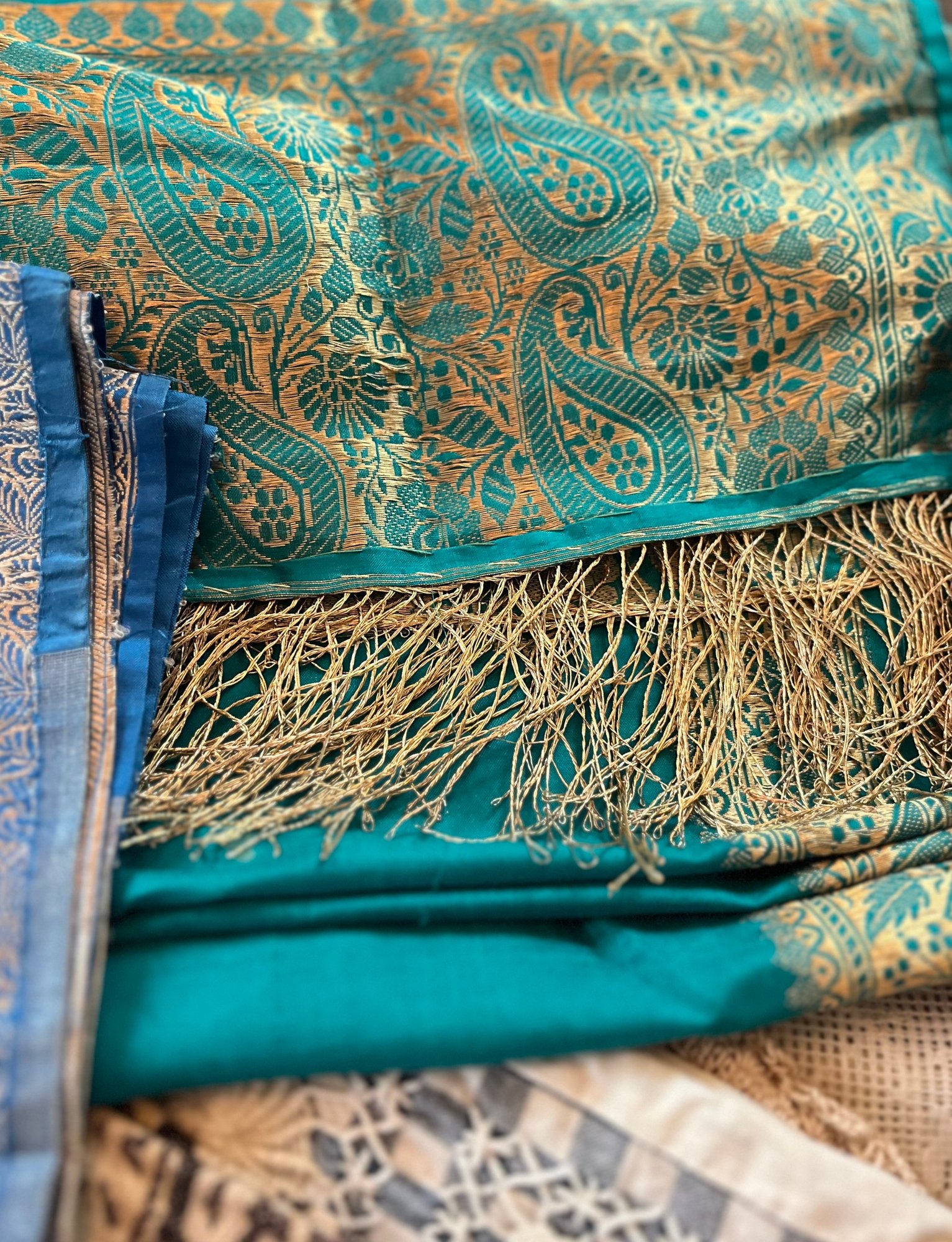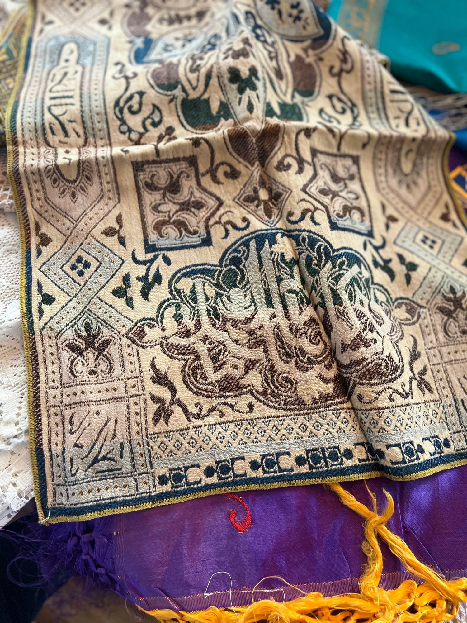 Mixed Linens /Persian Tapestry Runner, Zari Work, Silk Japan Piano Shawl & Pillow Cases