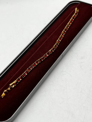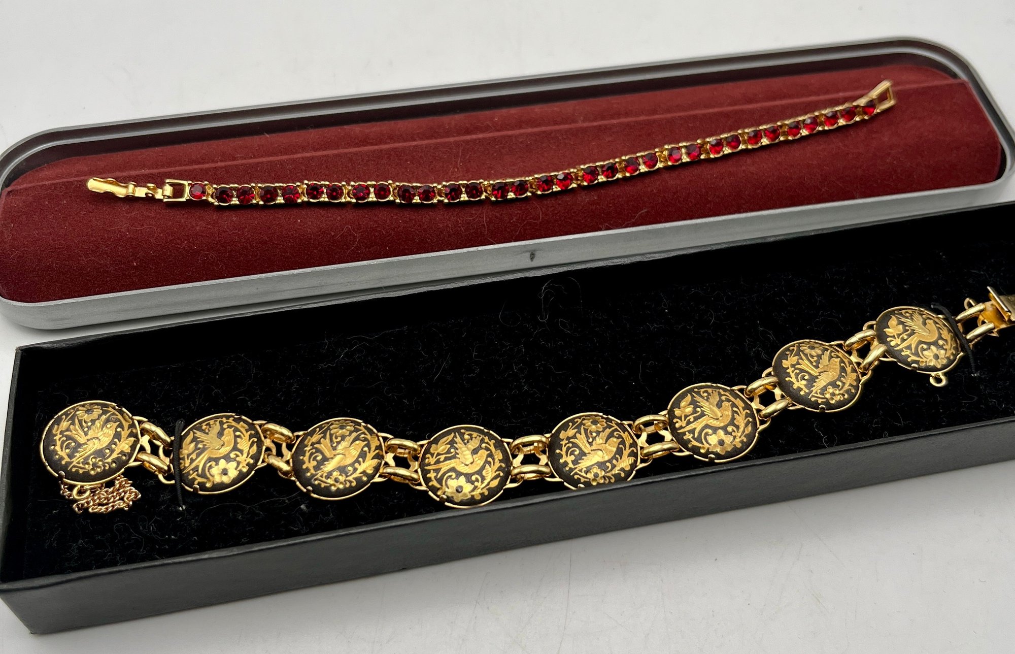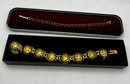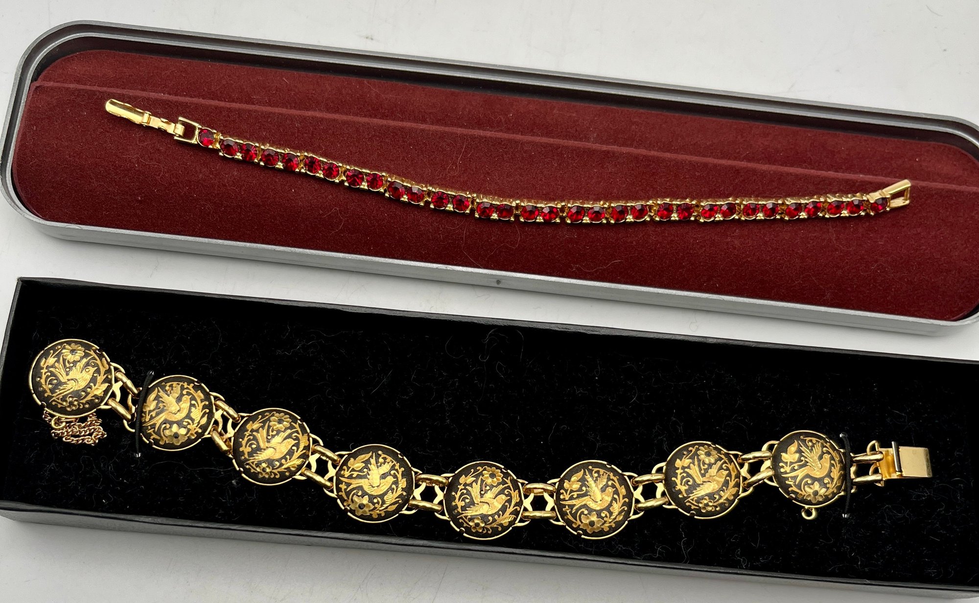 Gold Tone Damascene Link Bird & Flower, Gold Tone Red Stone Bracelets