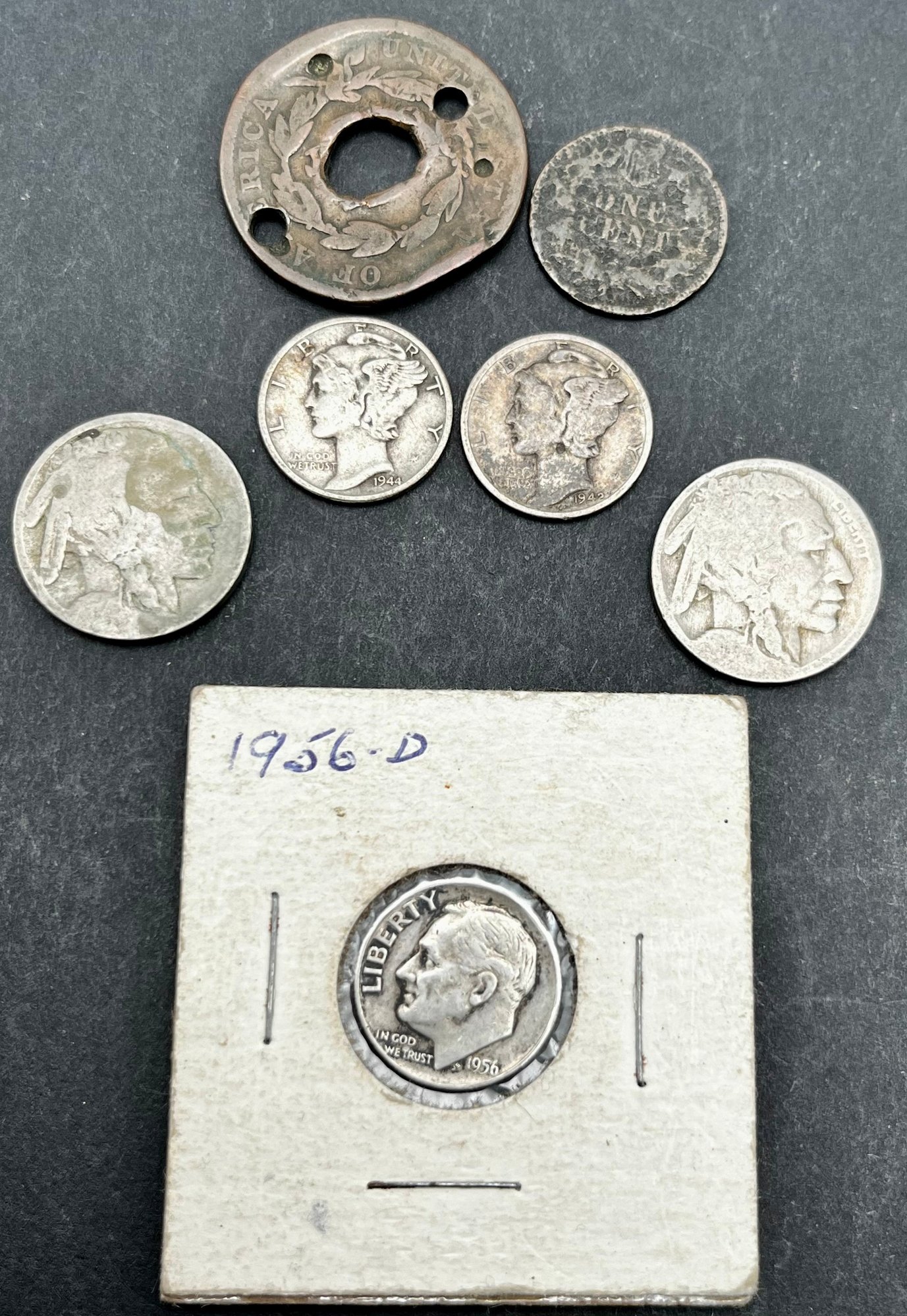 Old Us Coins- 2 Mercury Head Dimes 1942 & 1944, 2 Indian head Buffalo Nickels, 1956 dime, Other very old 1837 as is as shown