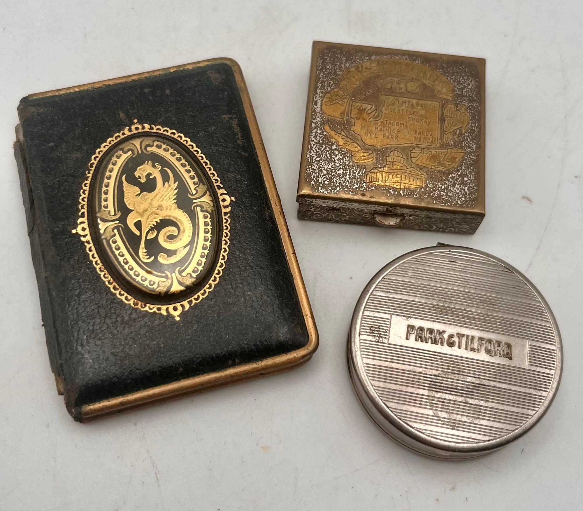 Small Compact/ Pill Box Cases -Washington State,Park & Tilford, leather covered with Mythical emblem