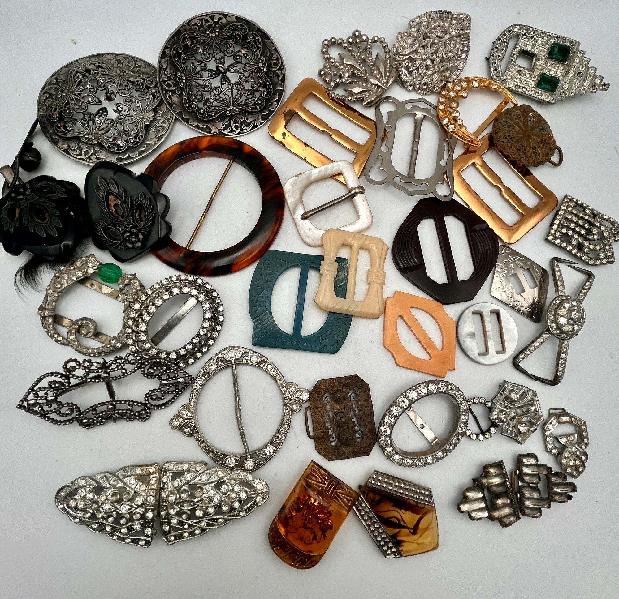 Vintage /Antique Buckles Lot Bakelite, Steele Cut, MOP, metal, plastic