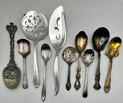 Pierced tomato server, olive spoon, cake server and others as shown