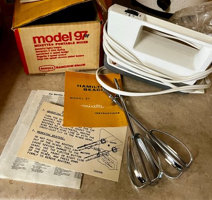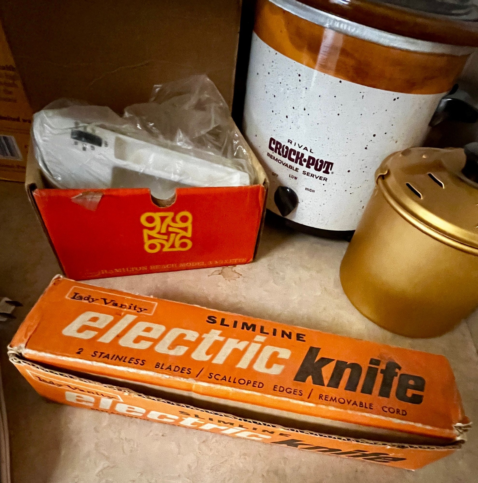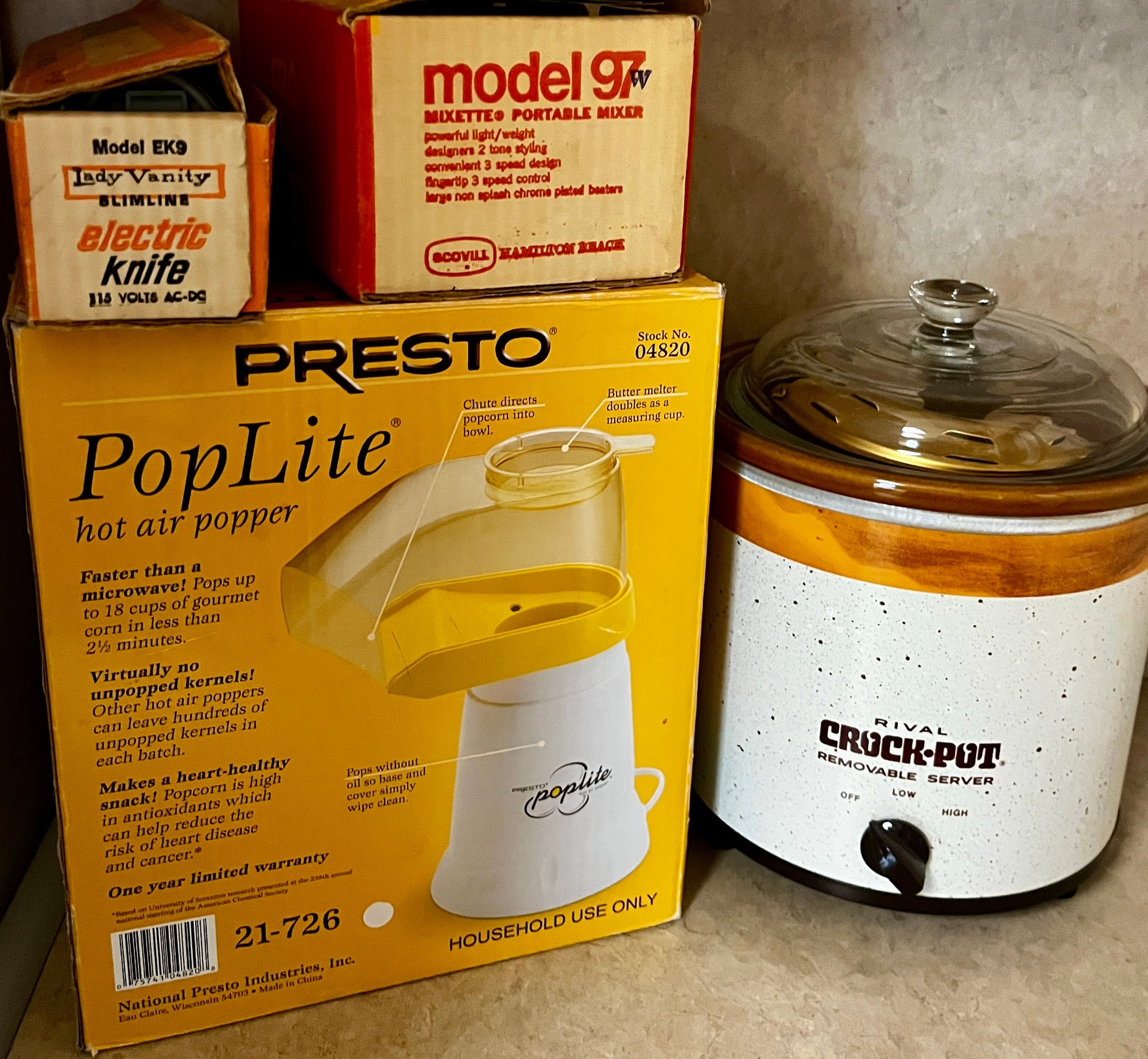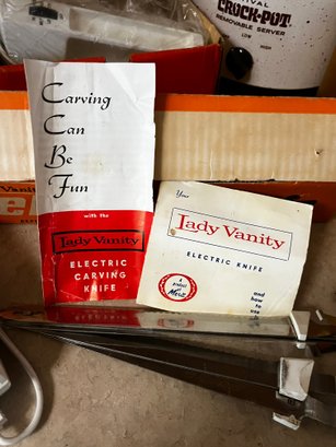 Vintage Kitchen -Hamilton model 197 Mixette hand mixer, Lady Vanity slim line Elect Knife, rival Crock Pot and presto pop lite